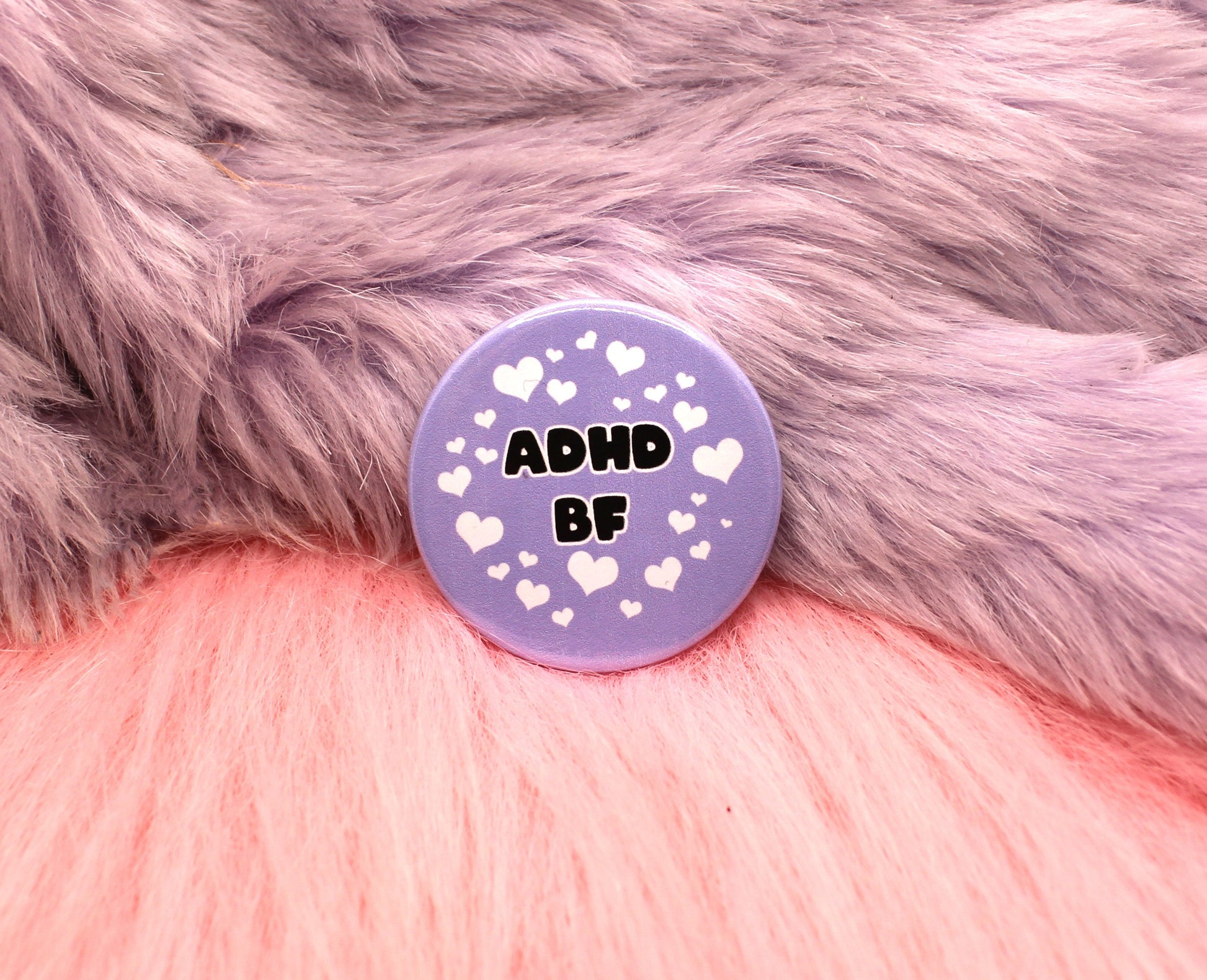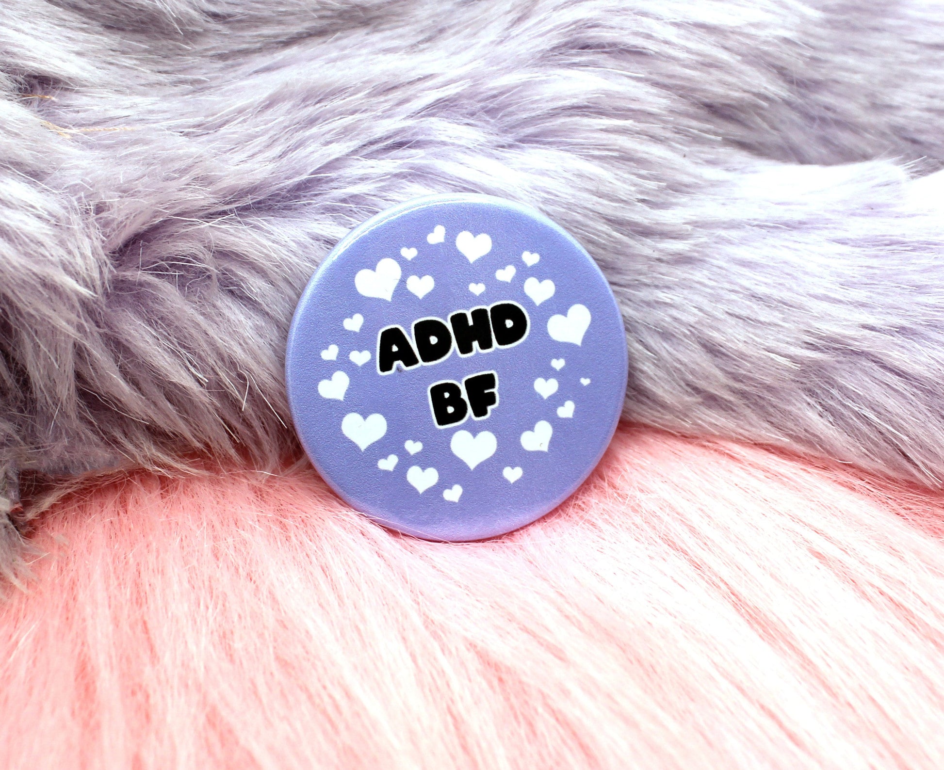This 'ADHD BF' badge is circular and measures about 38mm in diameter, with a clear glossy finish and safety-pin style back.