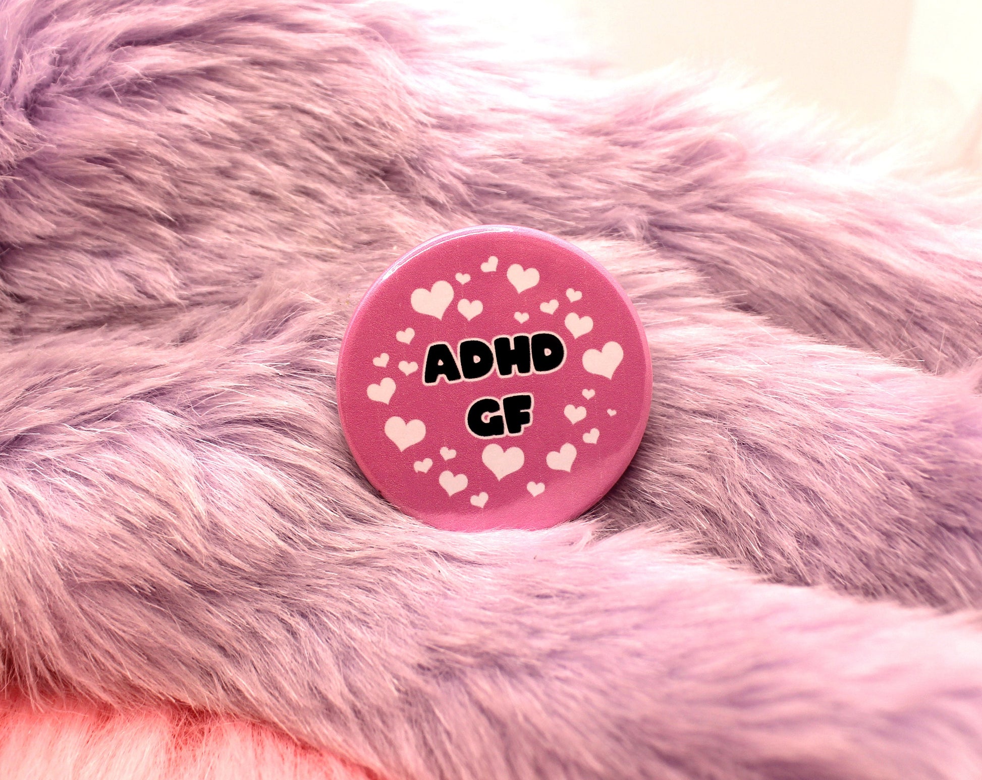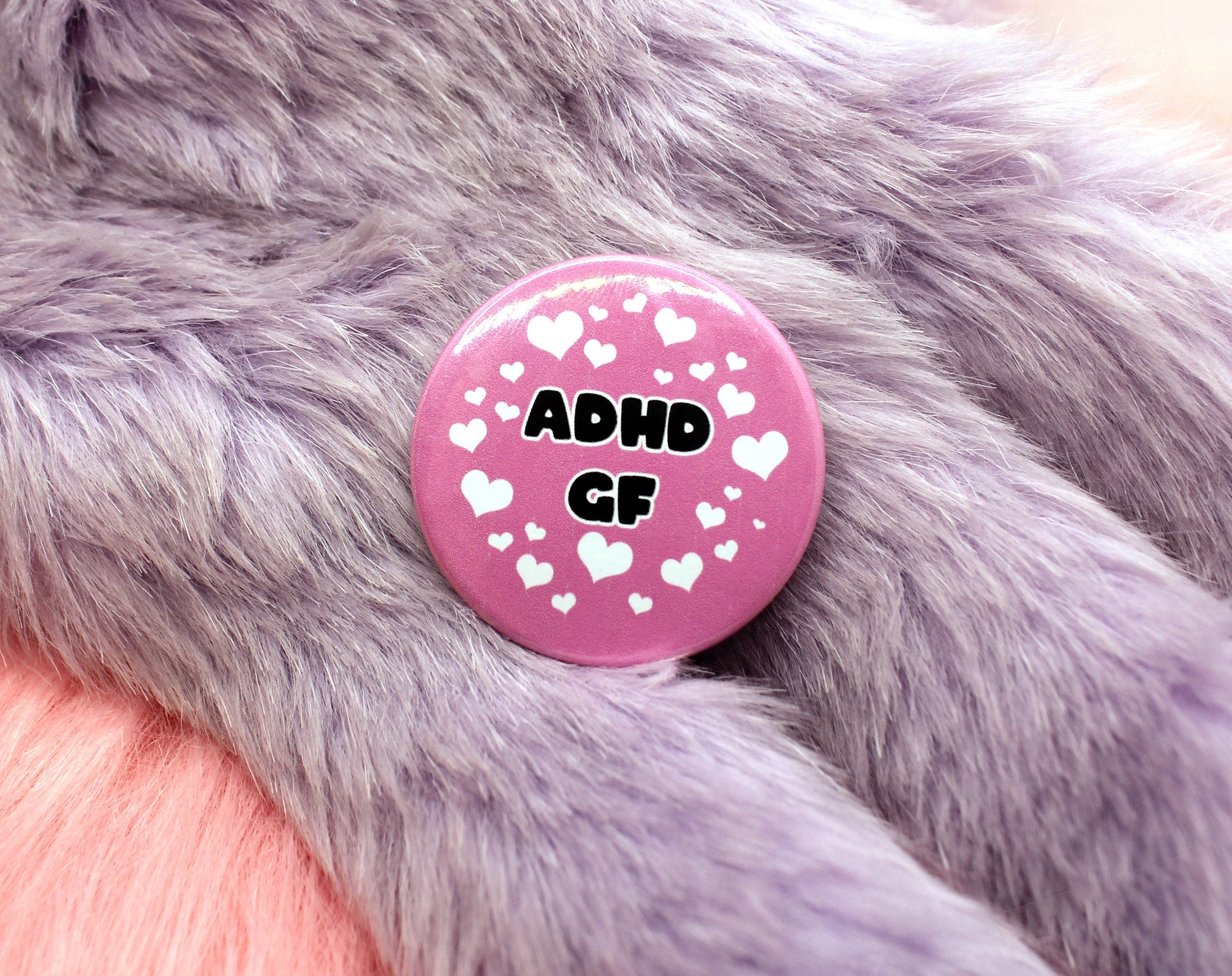 This 'ADHD GF' badge is circular and measures about 38mm in diameter, with a clear glossy finish and safety-pin style back.