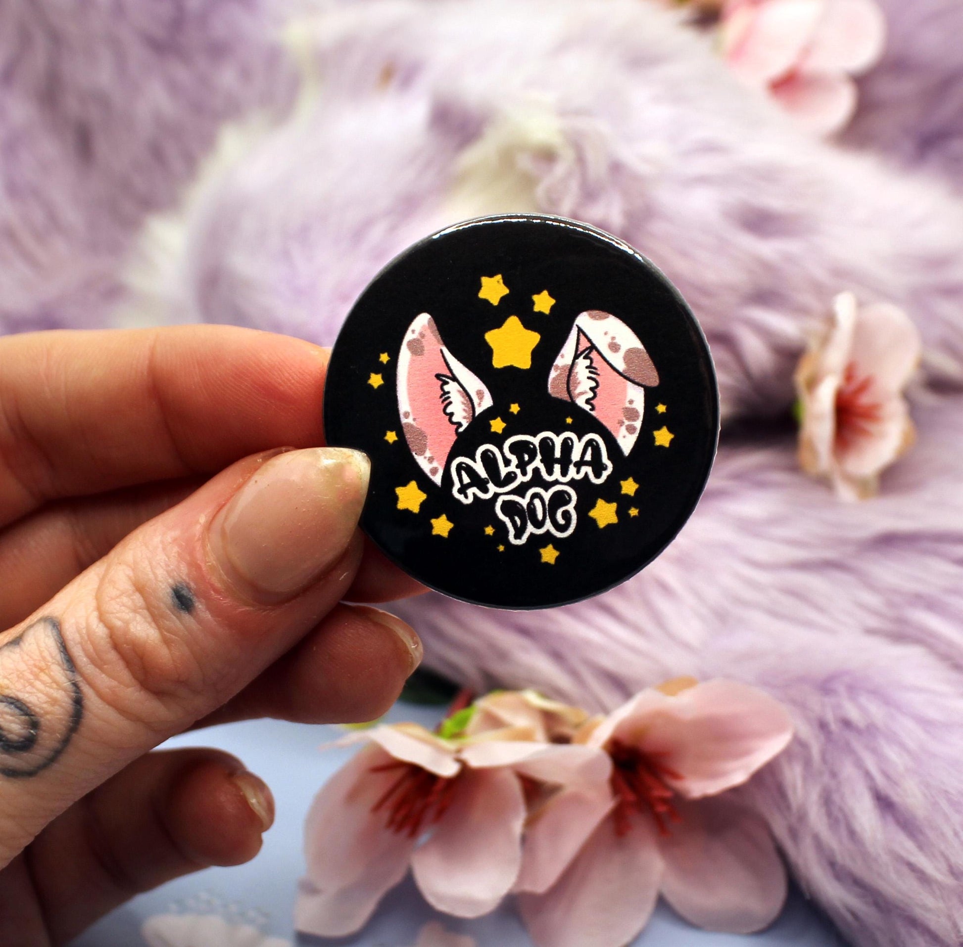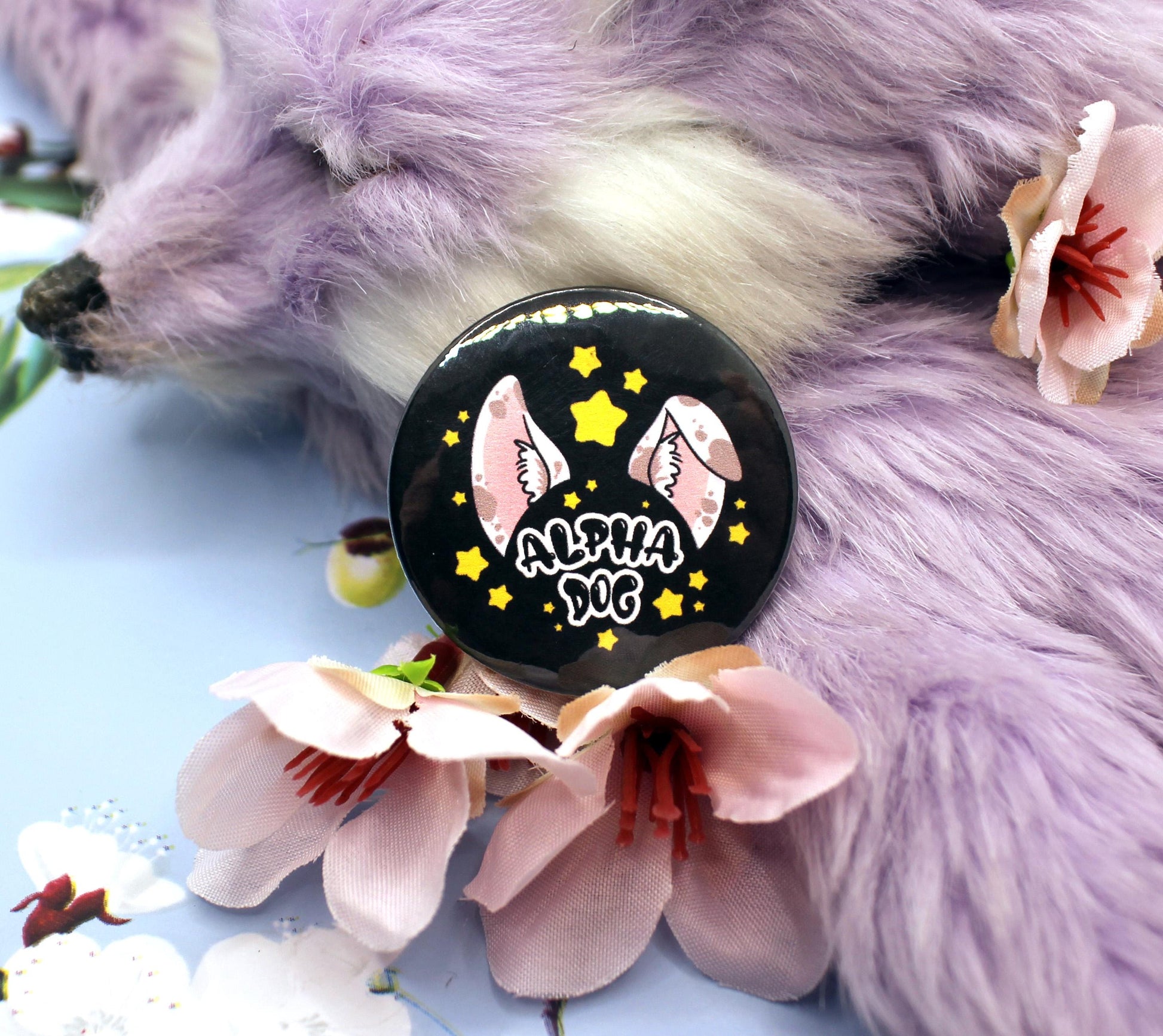The artwork depicted on the badge is a pair of cartoon puppy dog ears, surrounded by gold stars. Beneath the dog's ears is text that reads 'Alpha Dog' in a black and white bubble font.