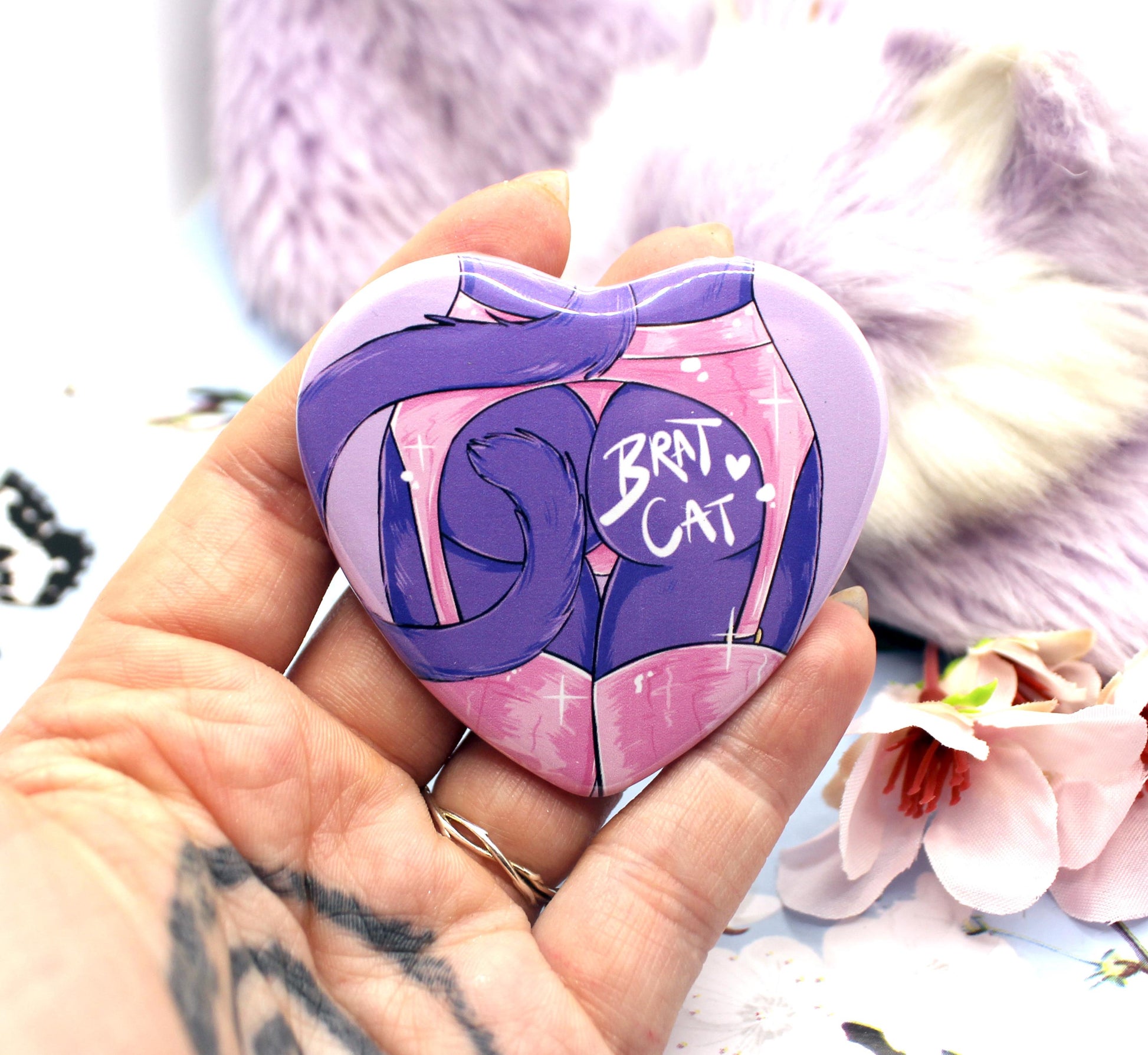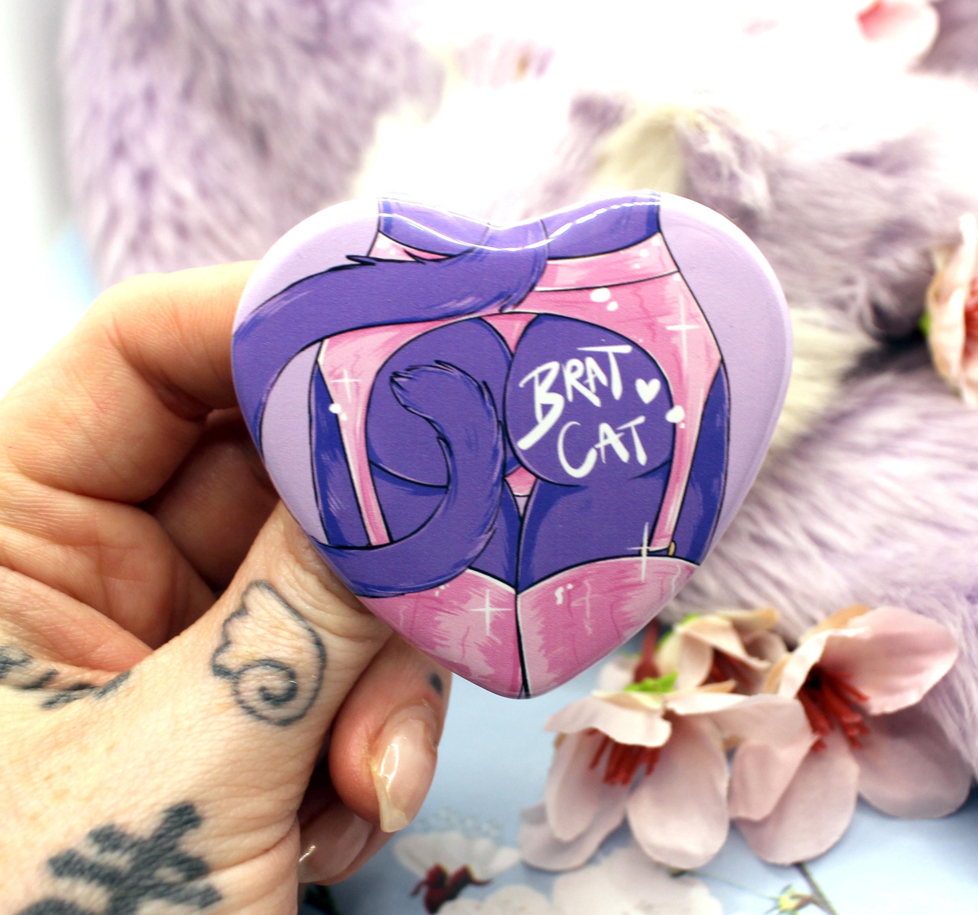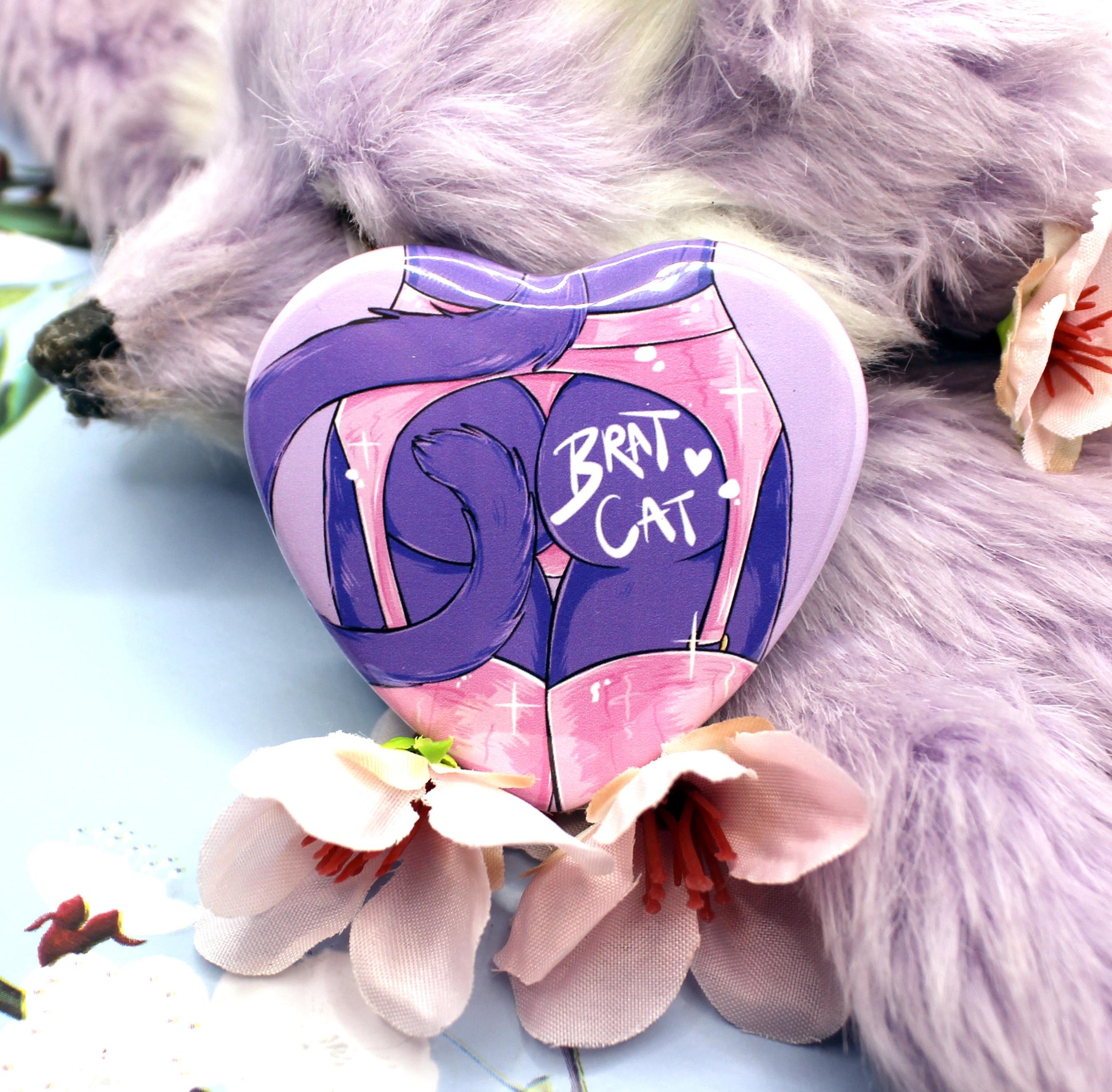 This 'Brat Cat' badge is heart shaped with a clear glossy finish.