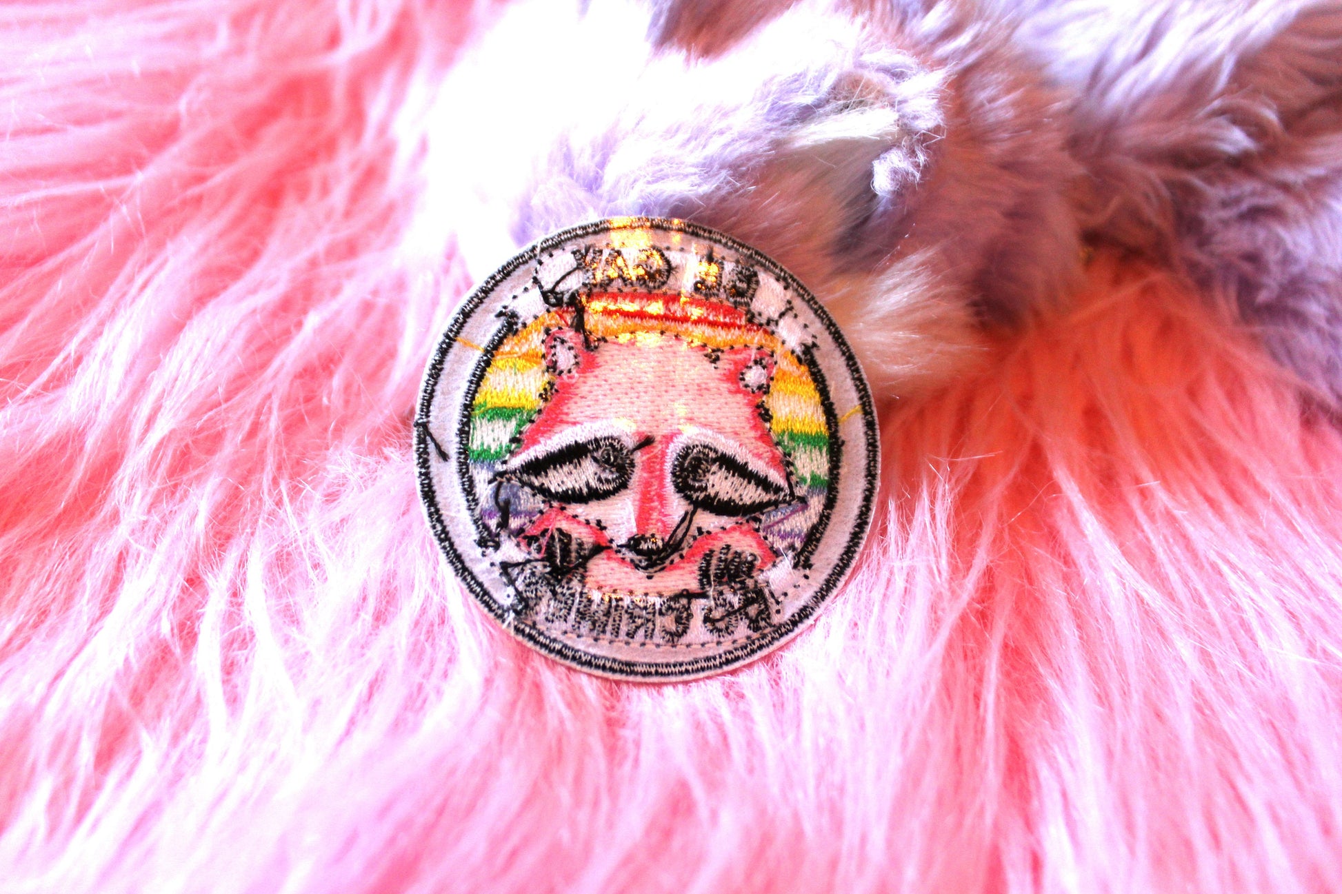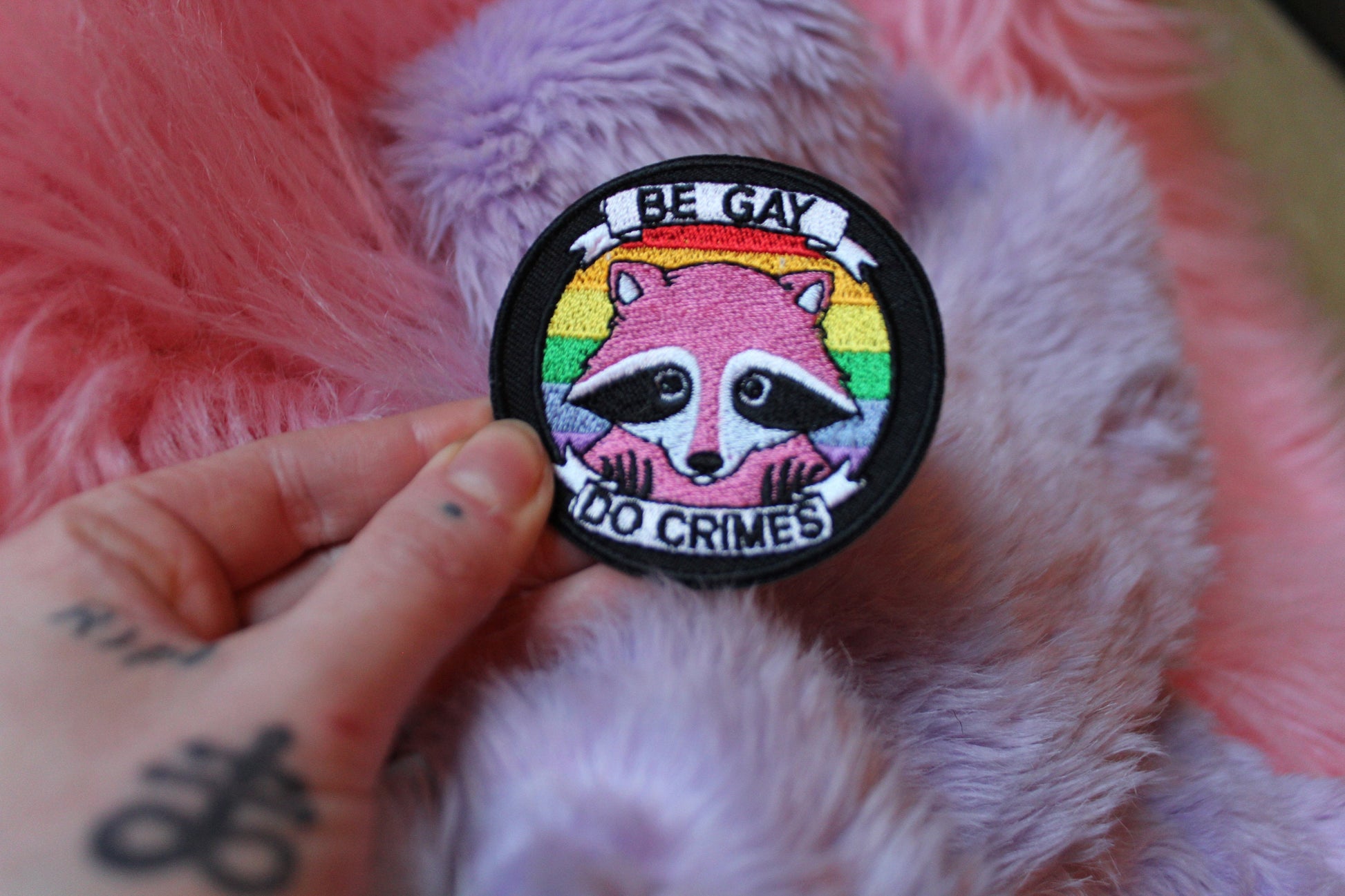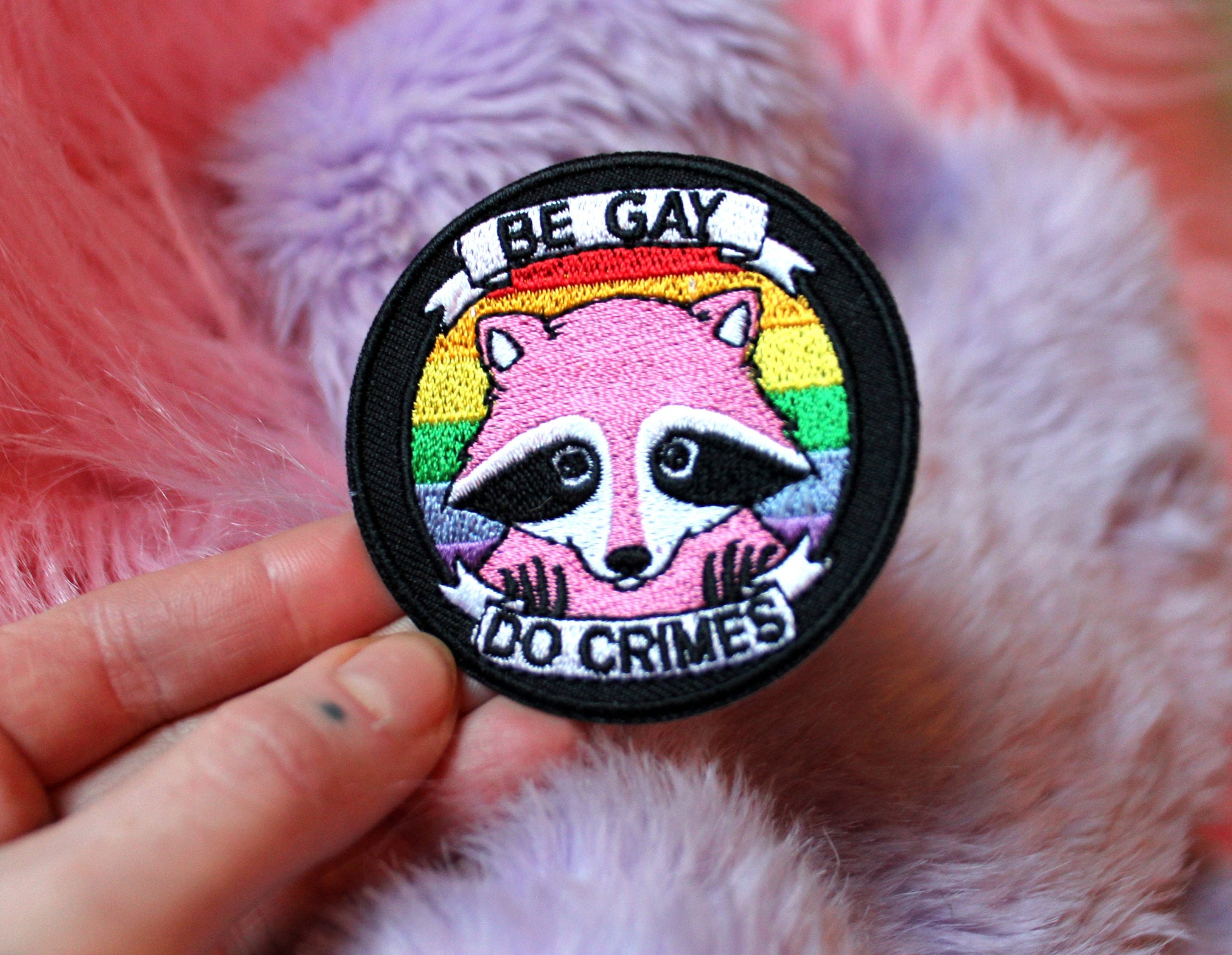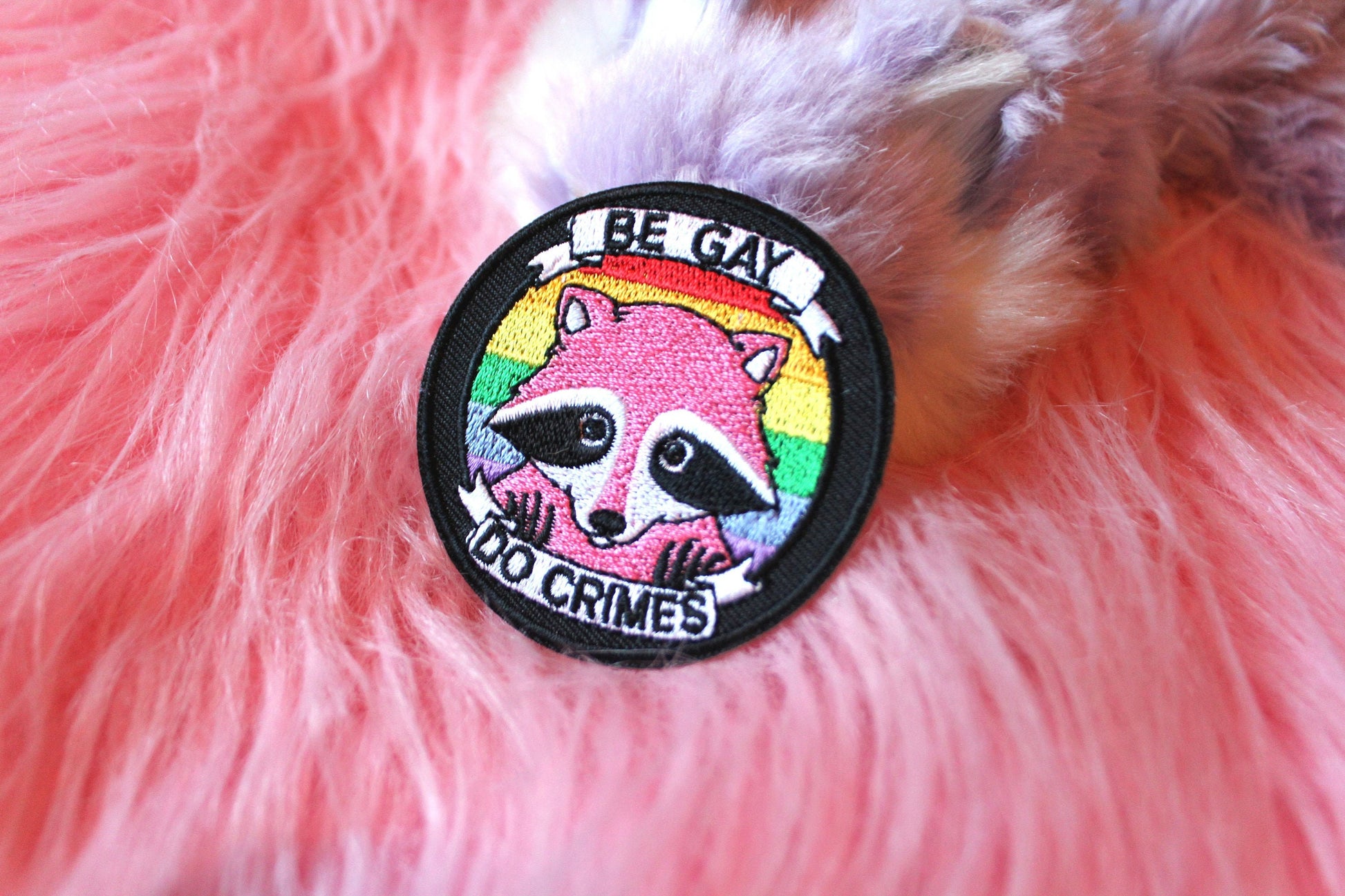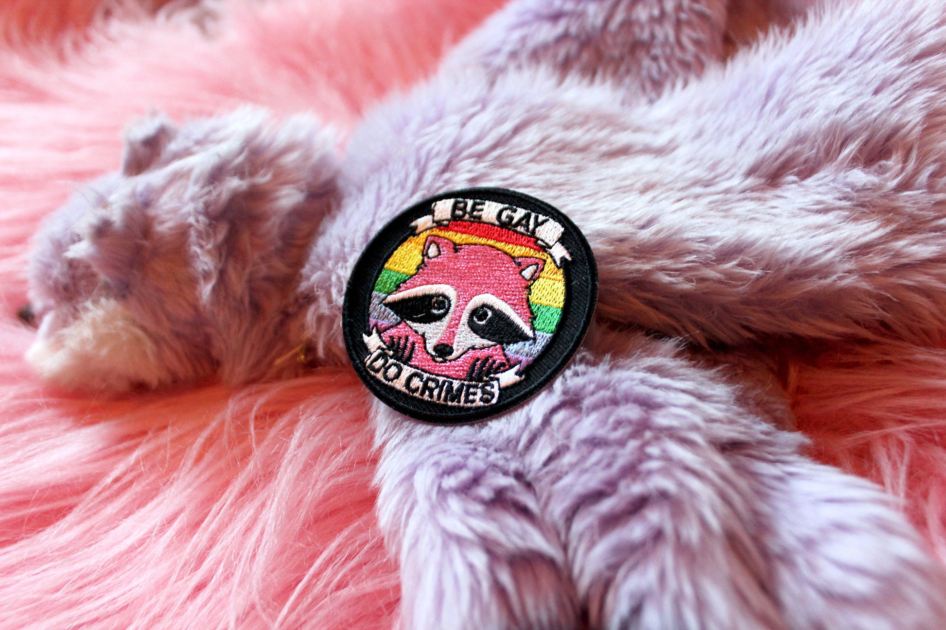 Be Gay Do Crimes Iron-On Patch (60mm) - pink raccoon embroidered patch