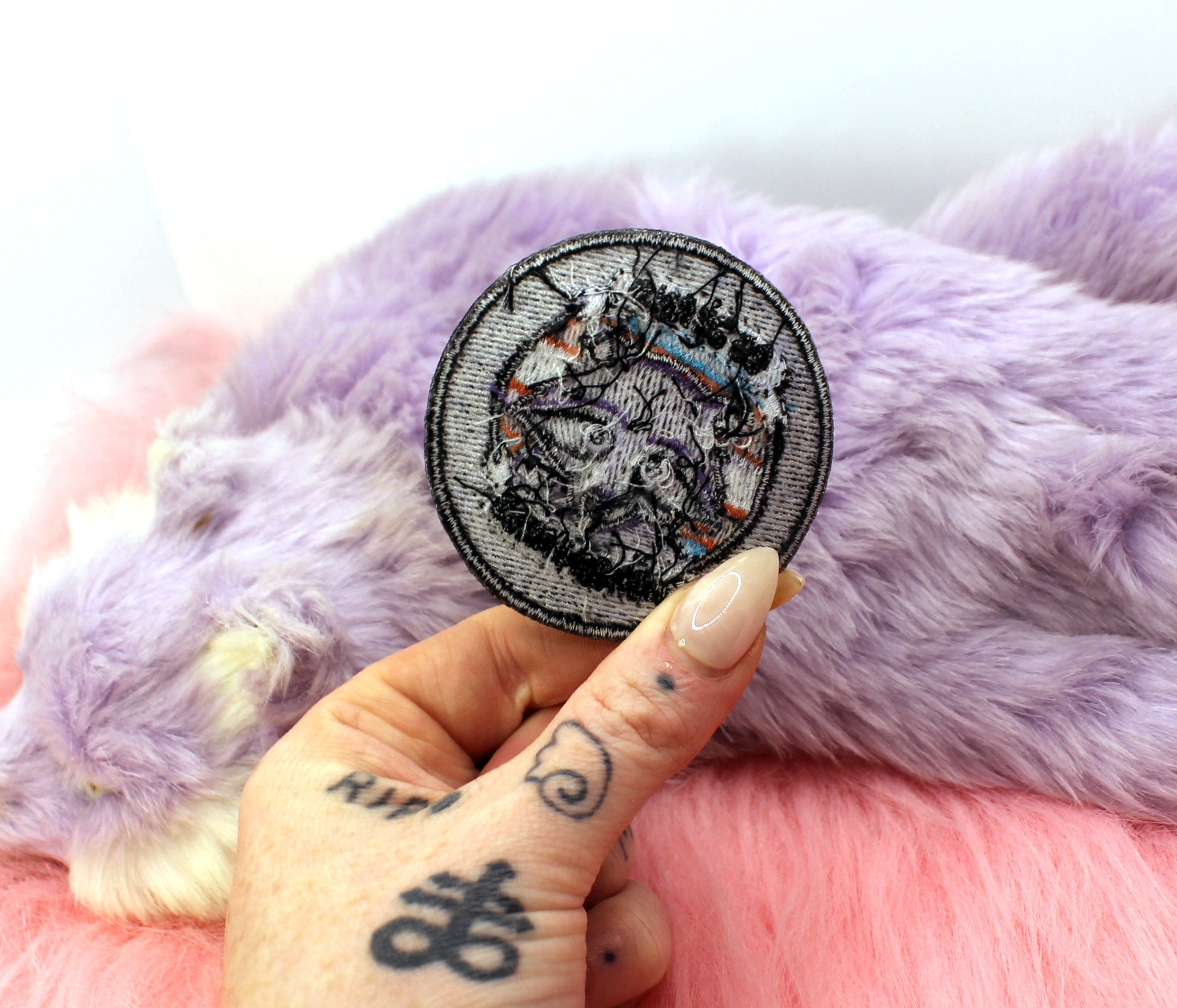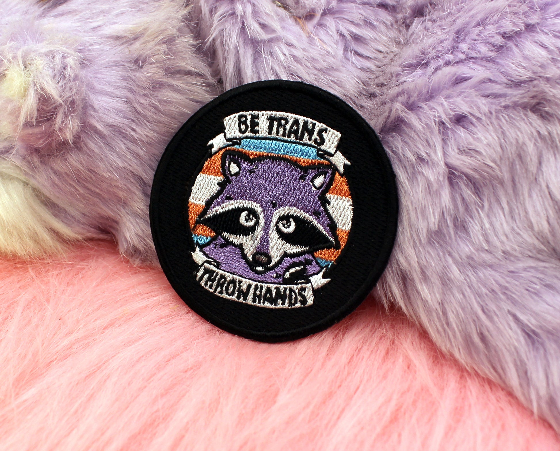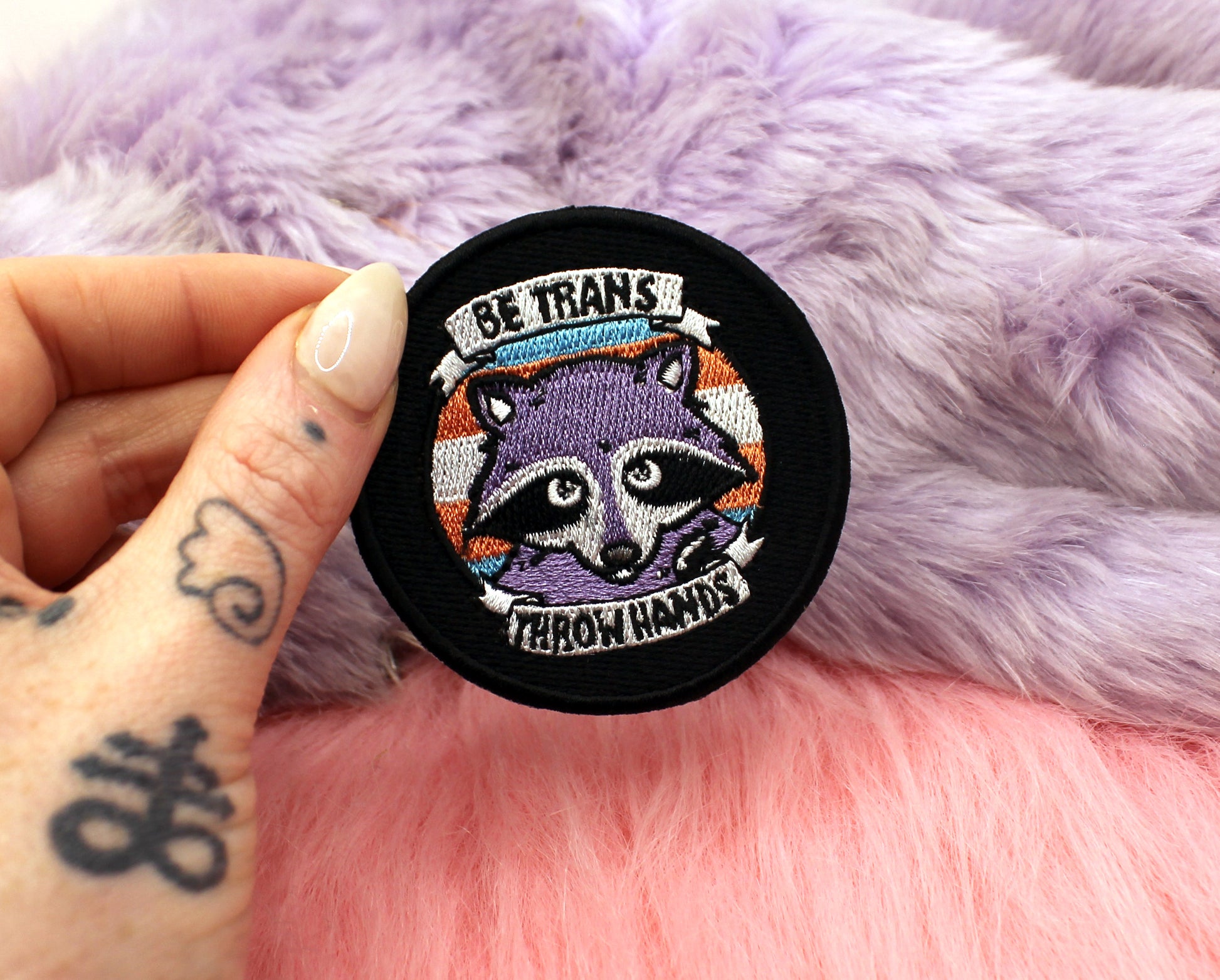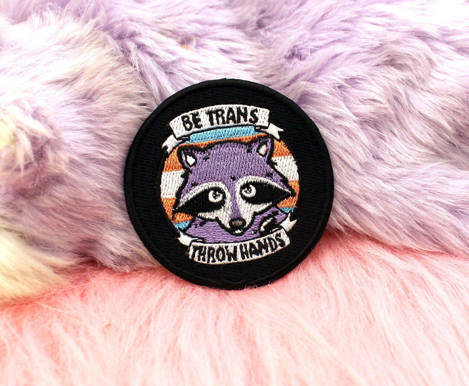 Be Trans Throw Hands Iron-On Patch (60mm) - transgender pride flag raccoon embroidered patch