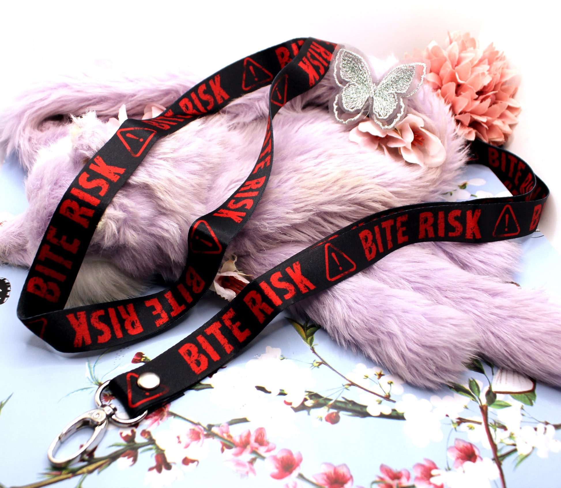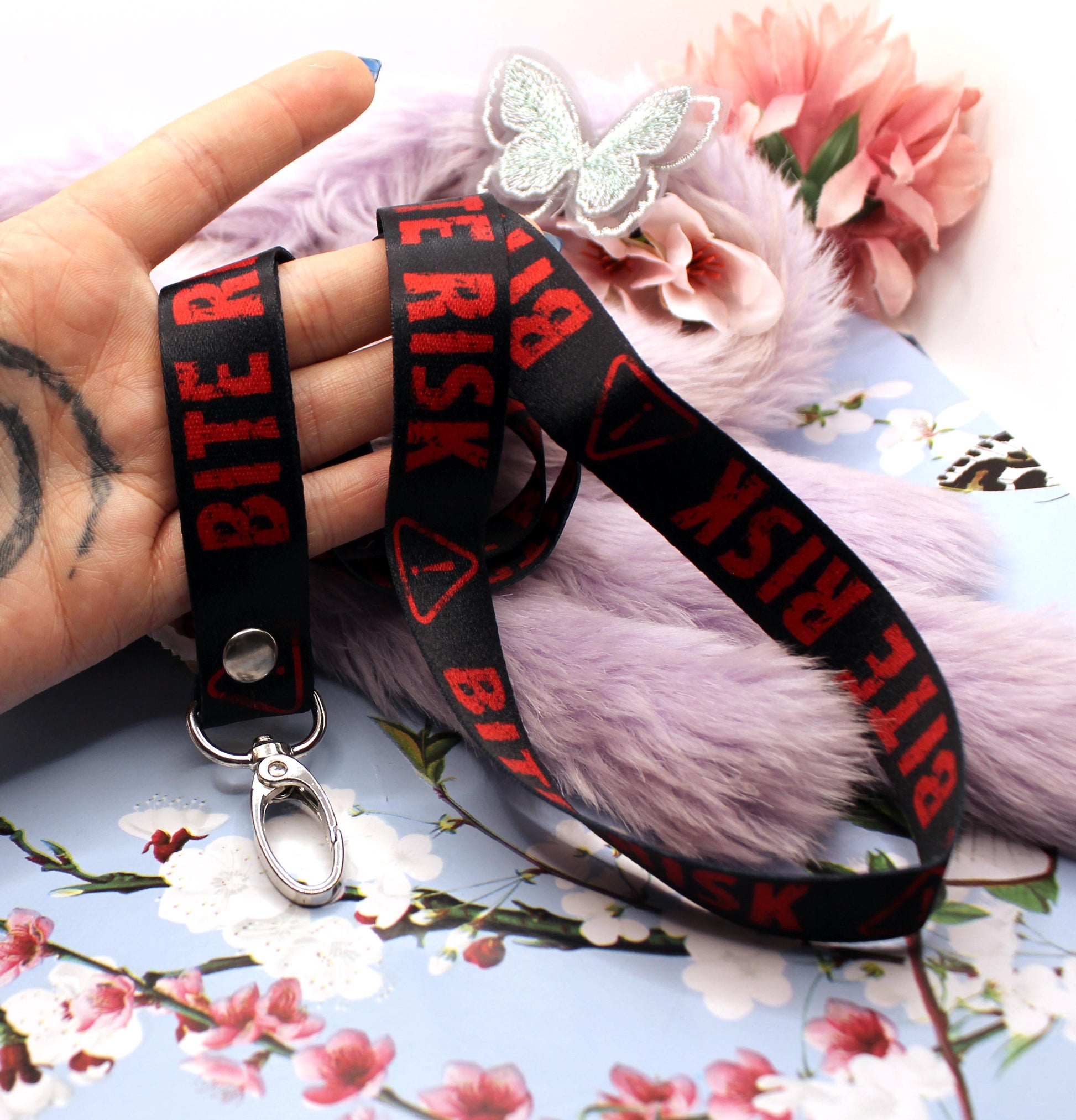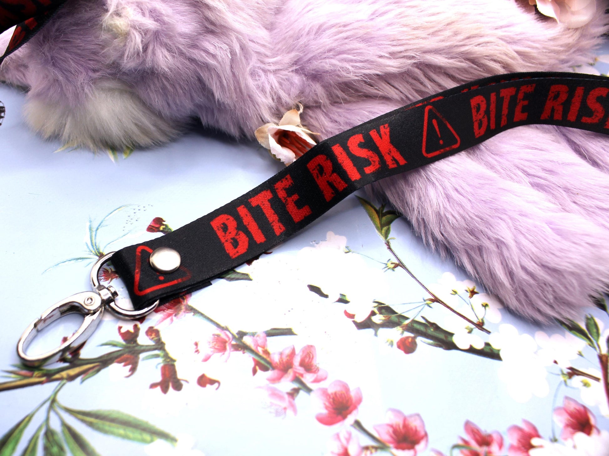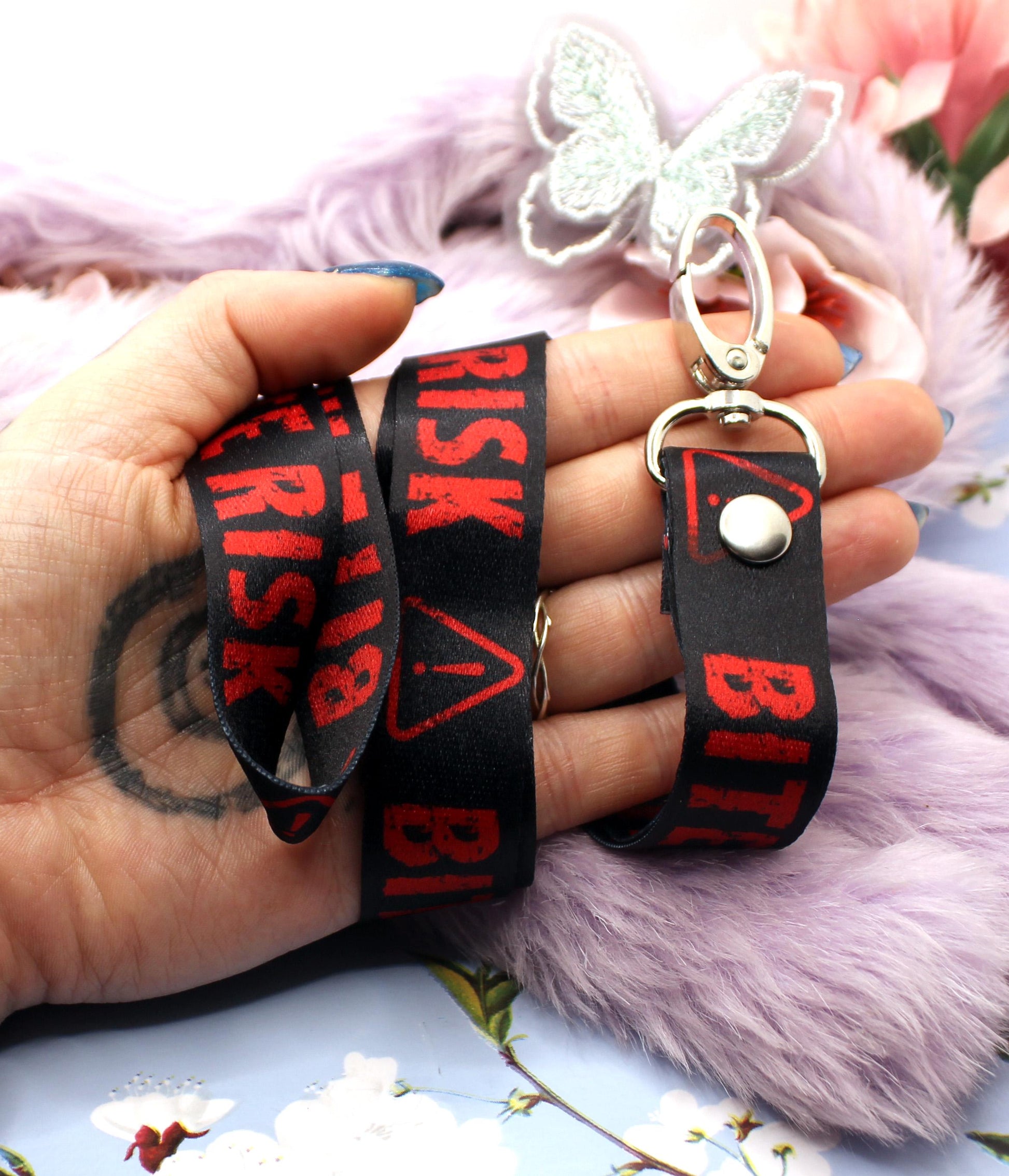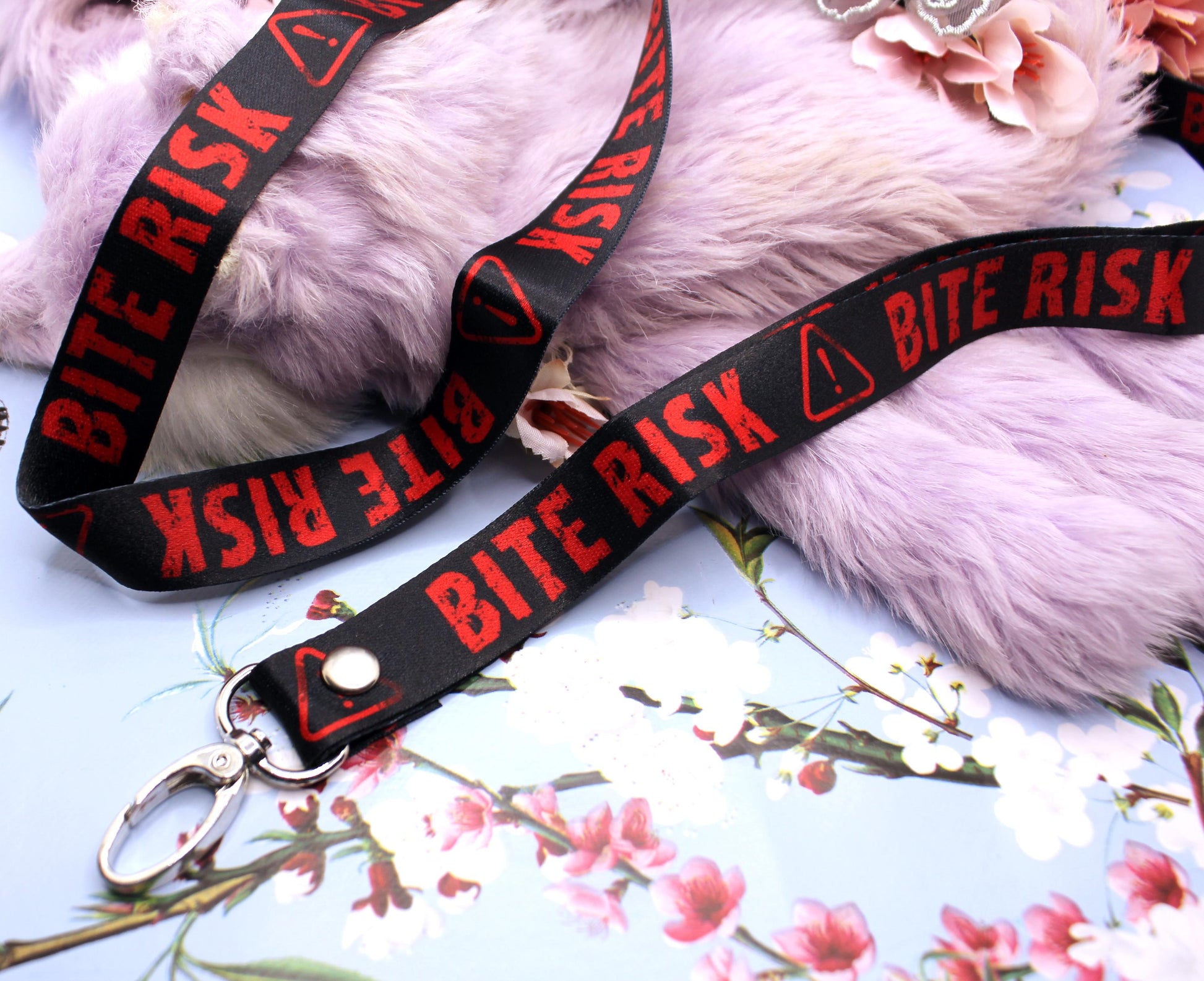 This black lanyard features red text that reads 'Bite Risk' and has an exclamation point inside of a triangle sign between words.