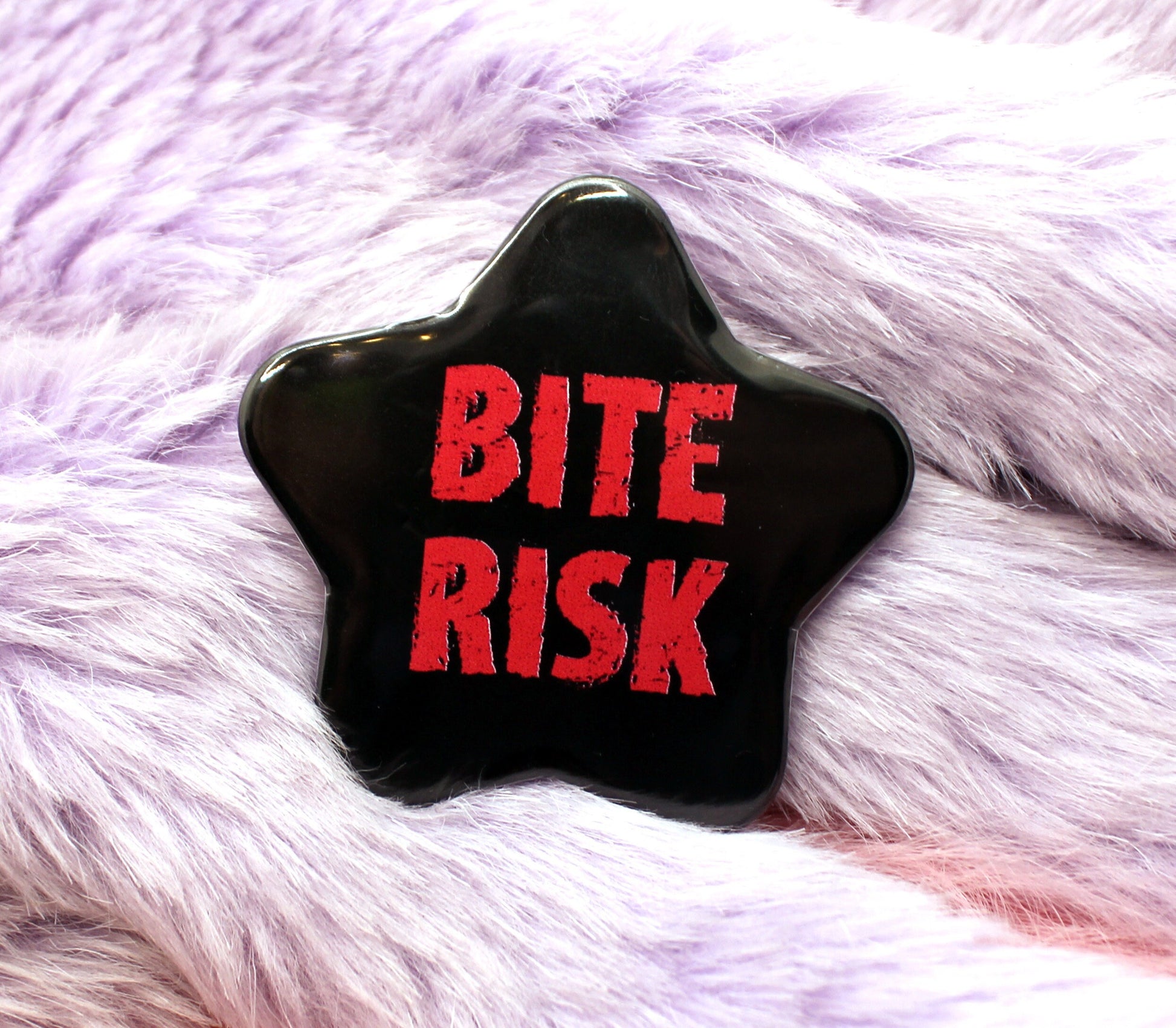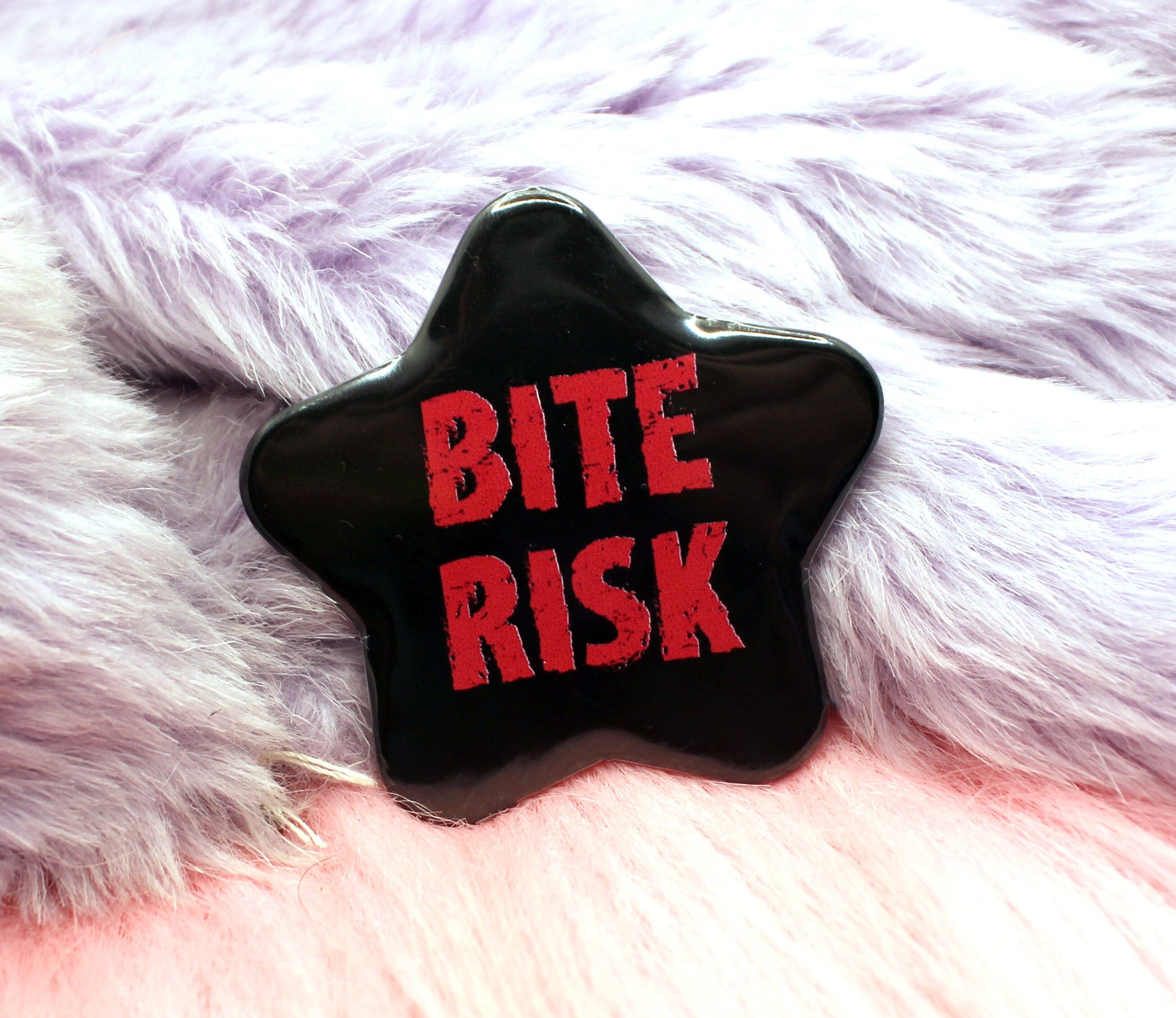 These 'Bite Risk' star badges have a clear glossy finish, are approximately 55mm in size and have a safety-pin style back.