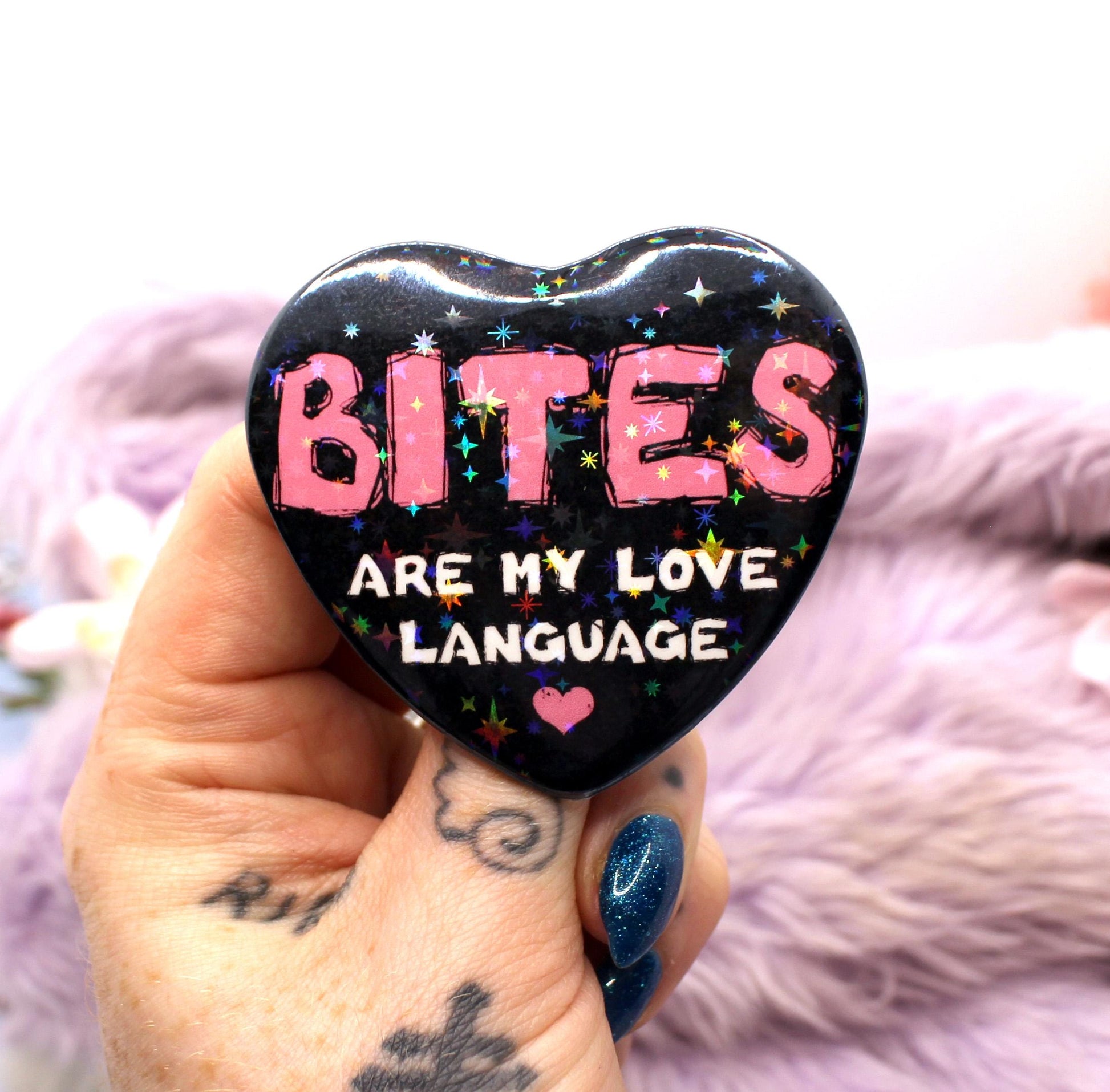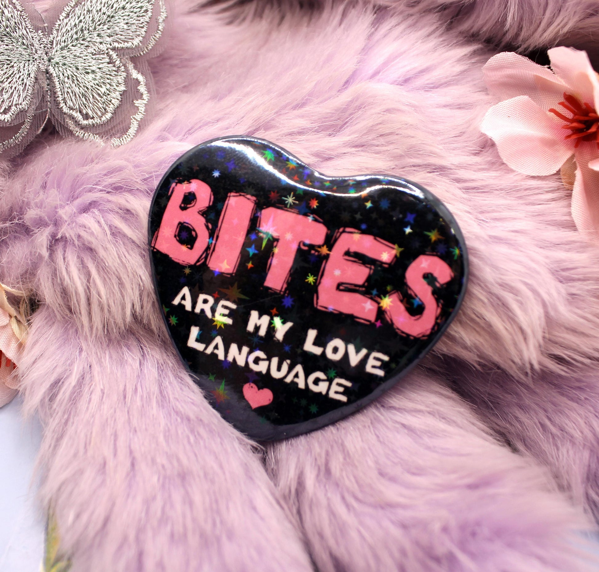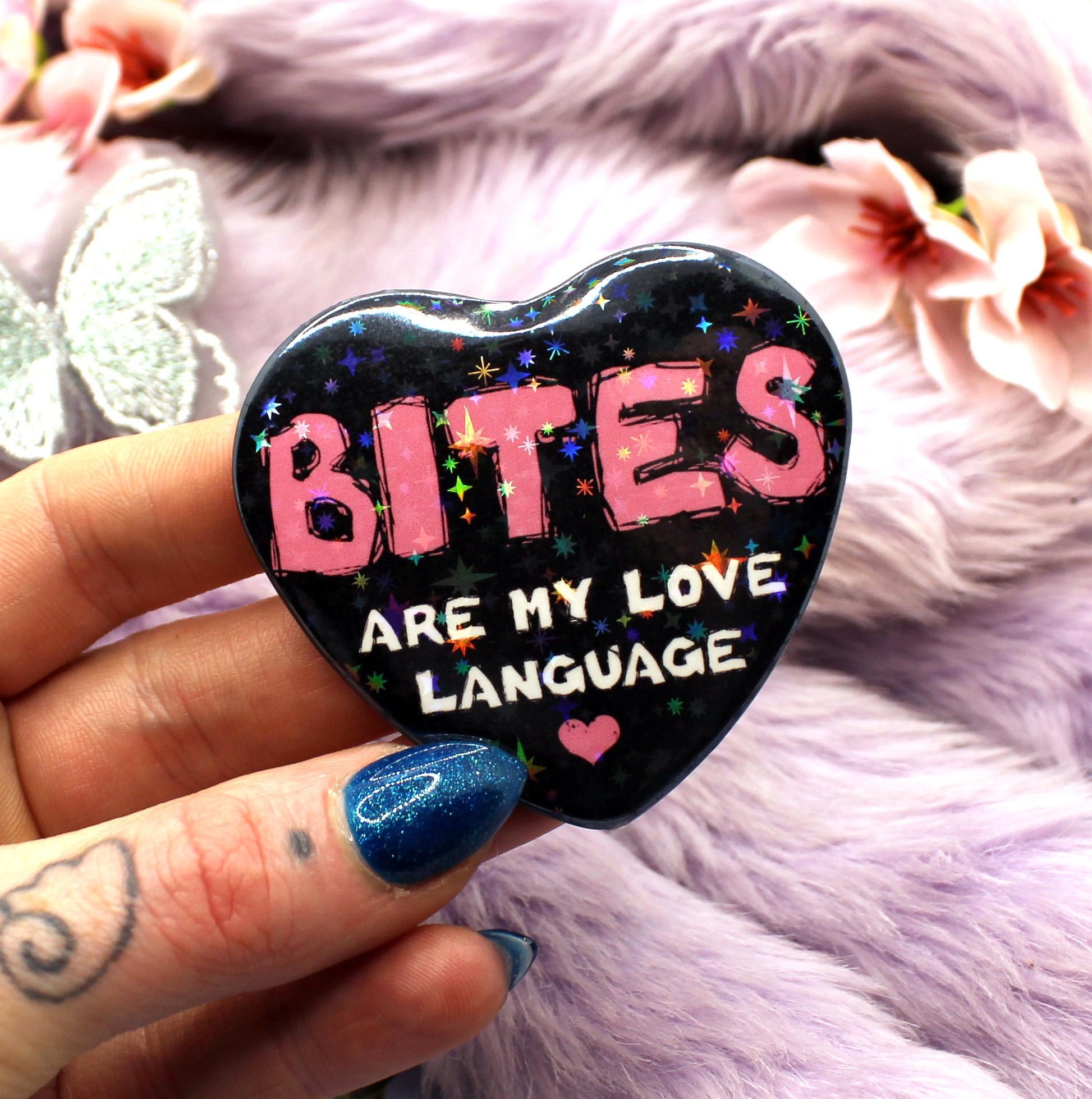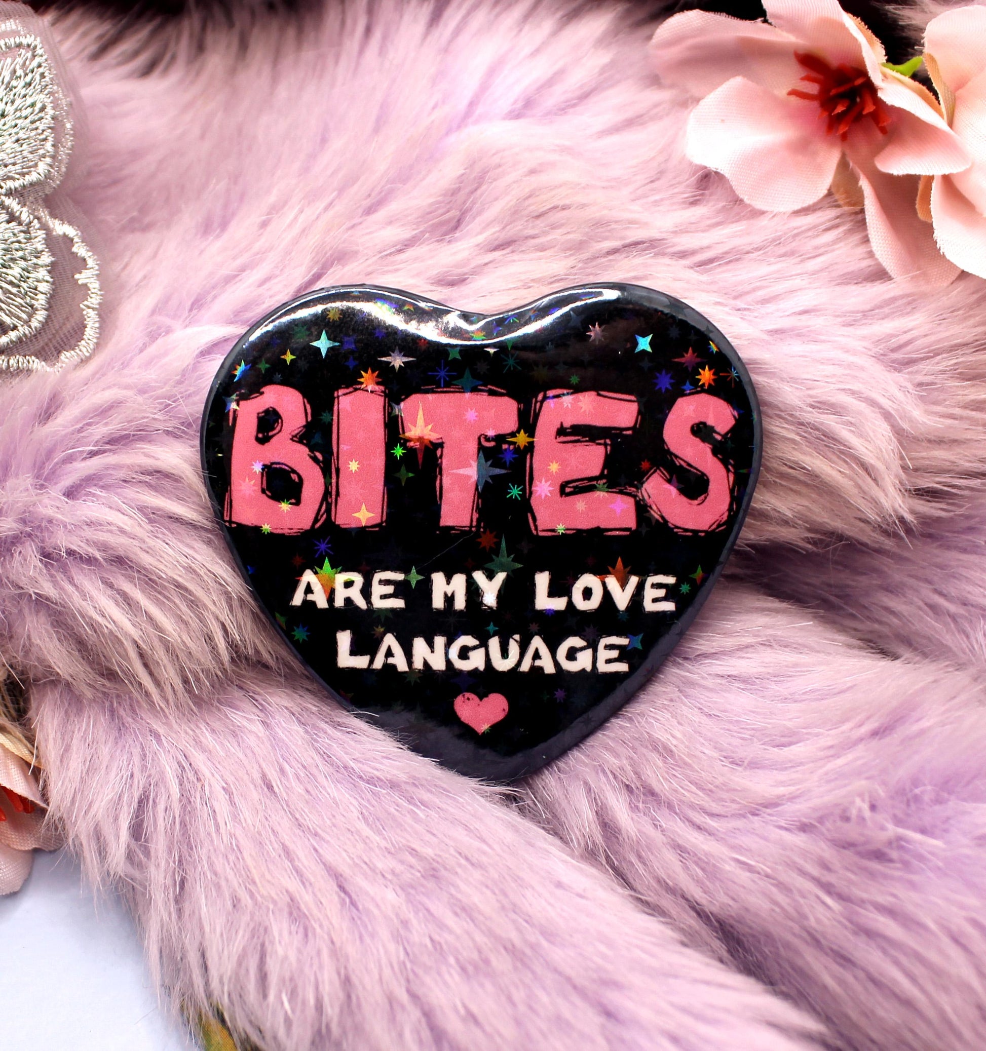 This badge is heart shaped with a sparkly glossy finish, the text on the front reads 'Bites are my love language' in pink and white text on a black background. The back has a safety-pin style fastening.