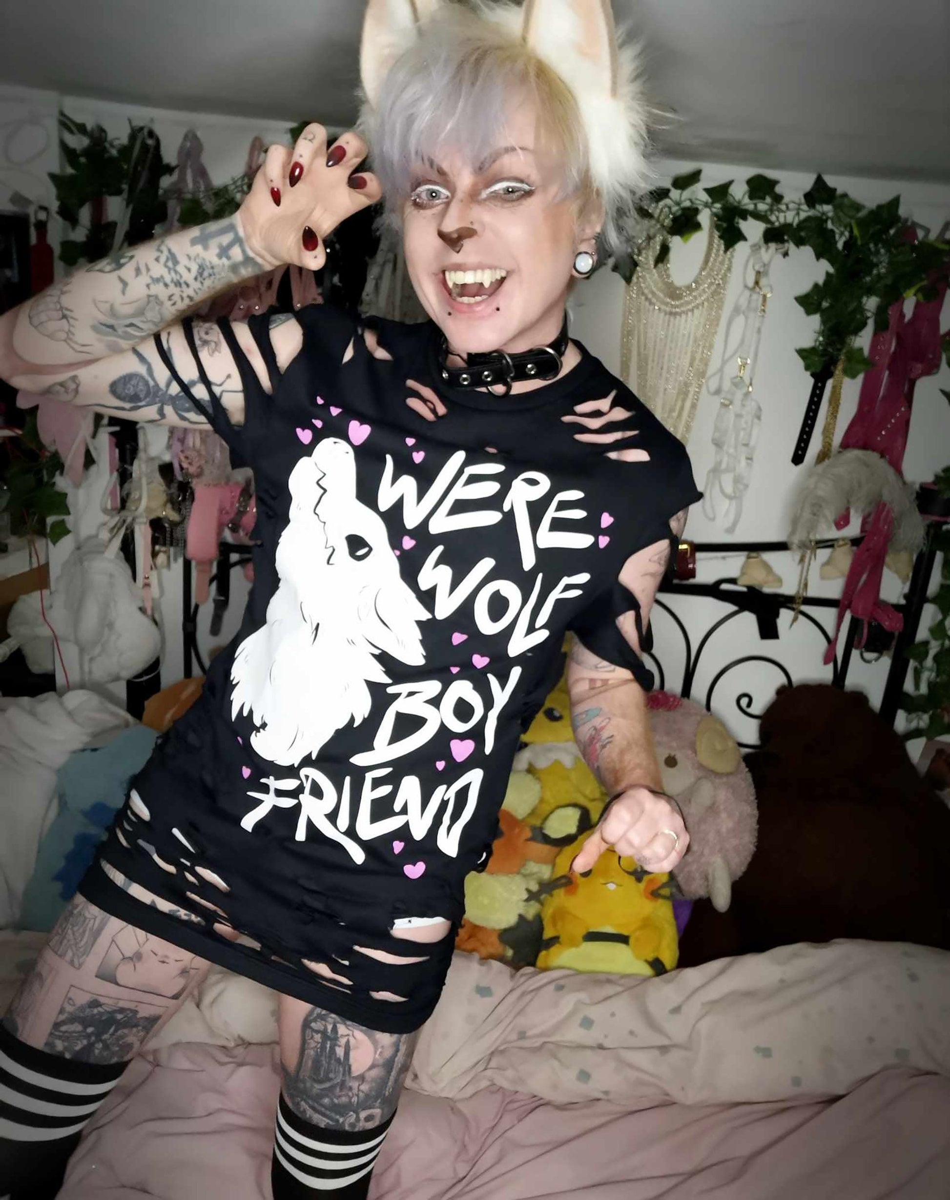 Werewolf Boyfriend T-shirt with a tamed werewolf surrounded by chains, hearts and graphic text.