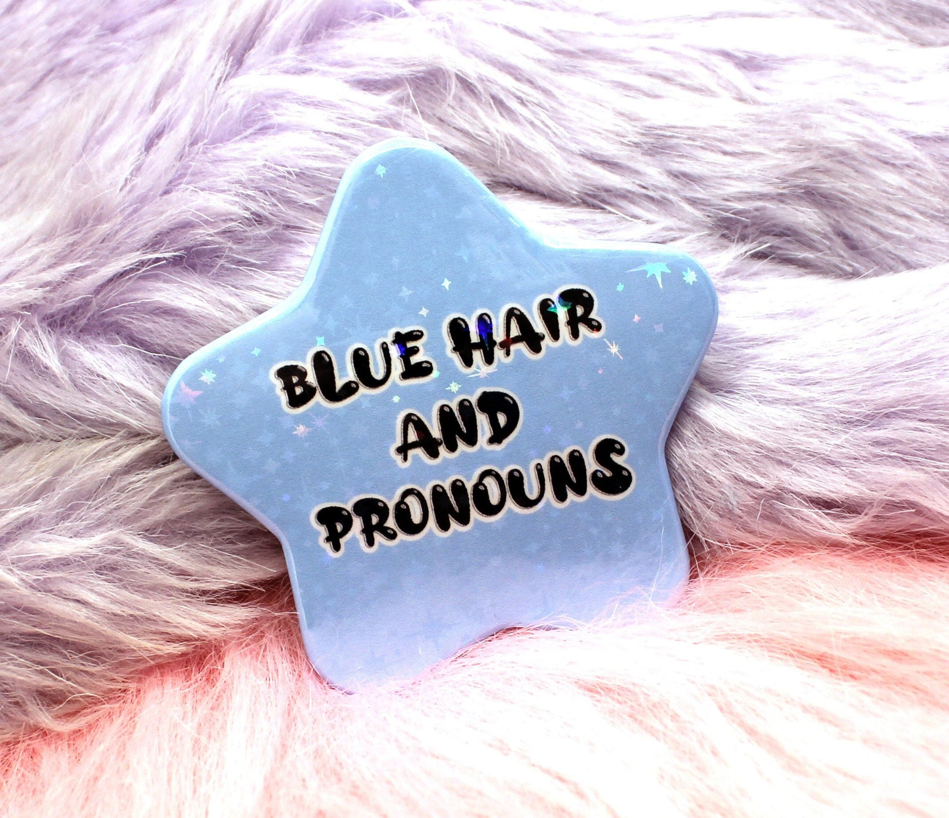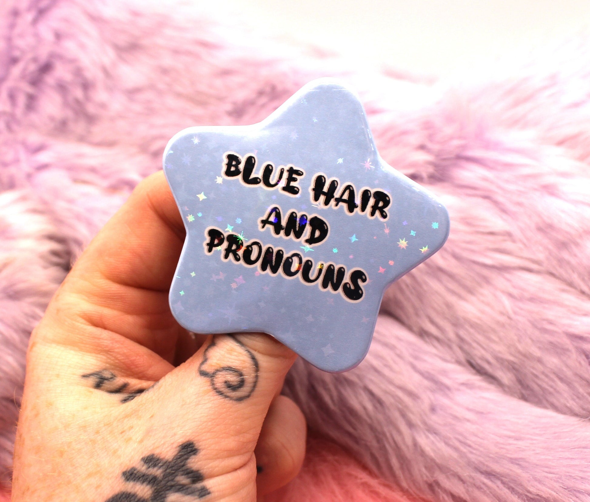 These star badges have a sparkly holographic finish, are approximately 55mm in size and have a safety-pin style back.