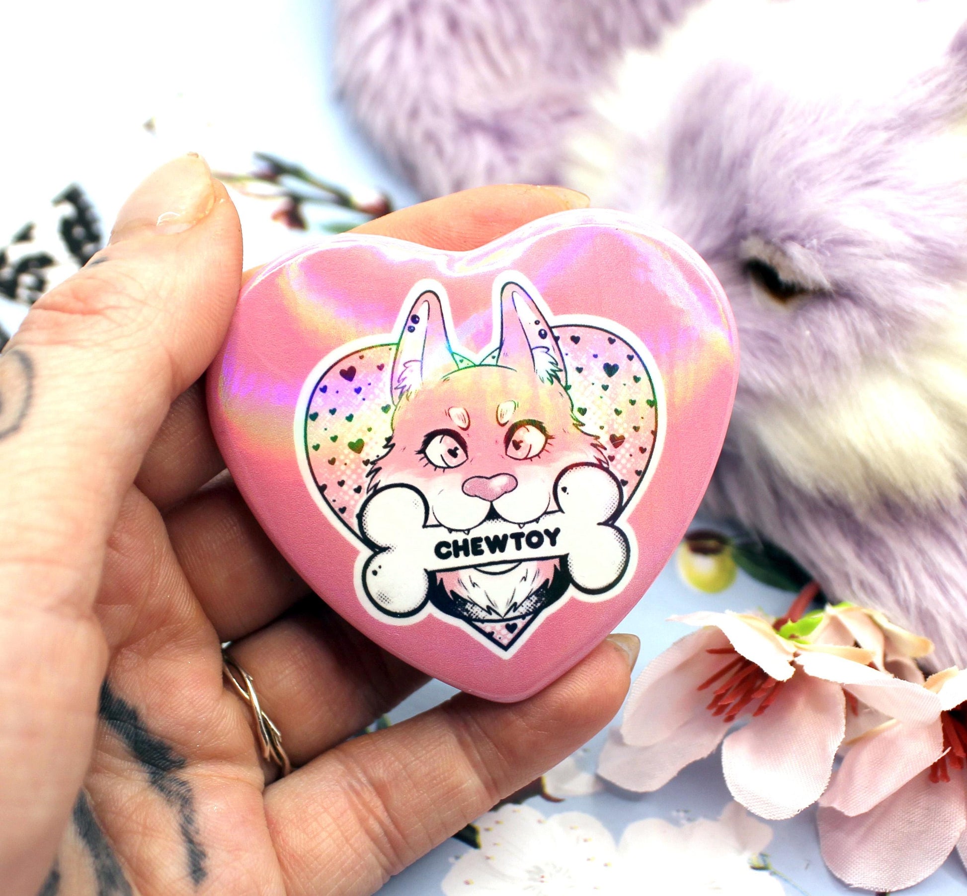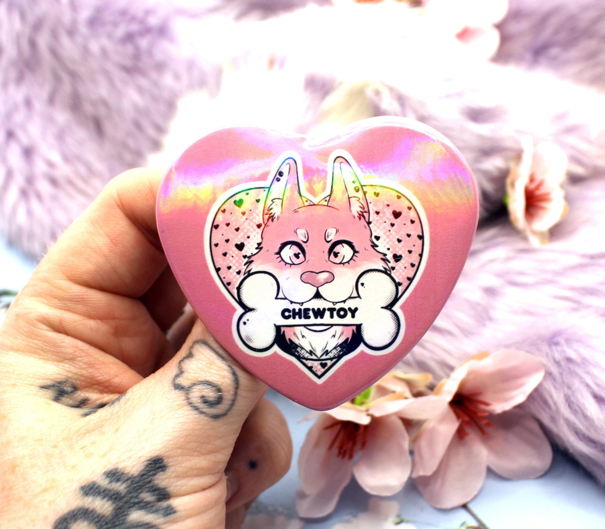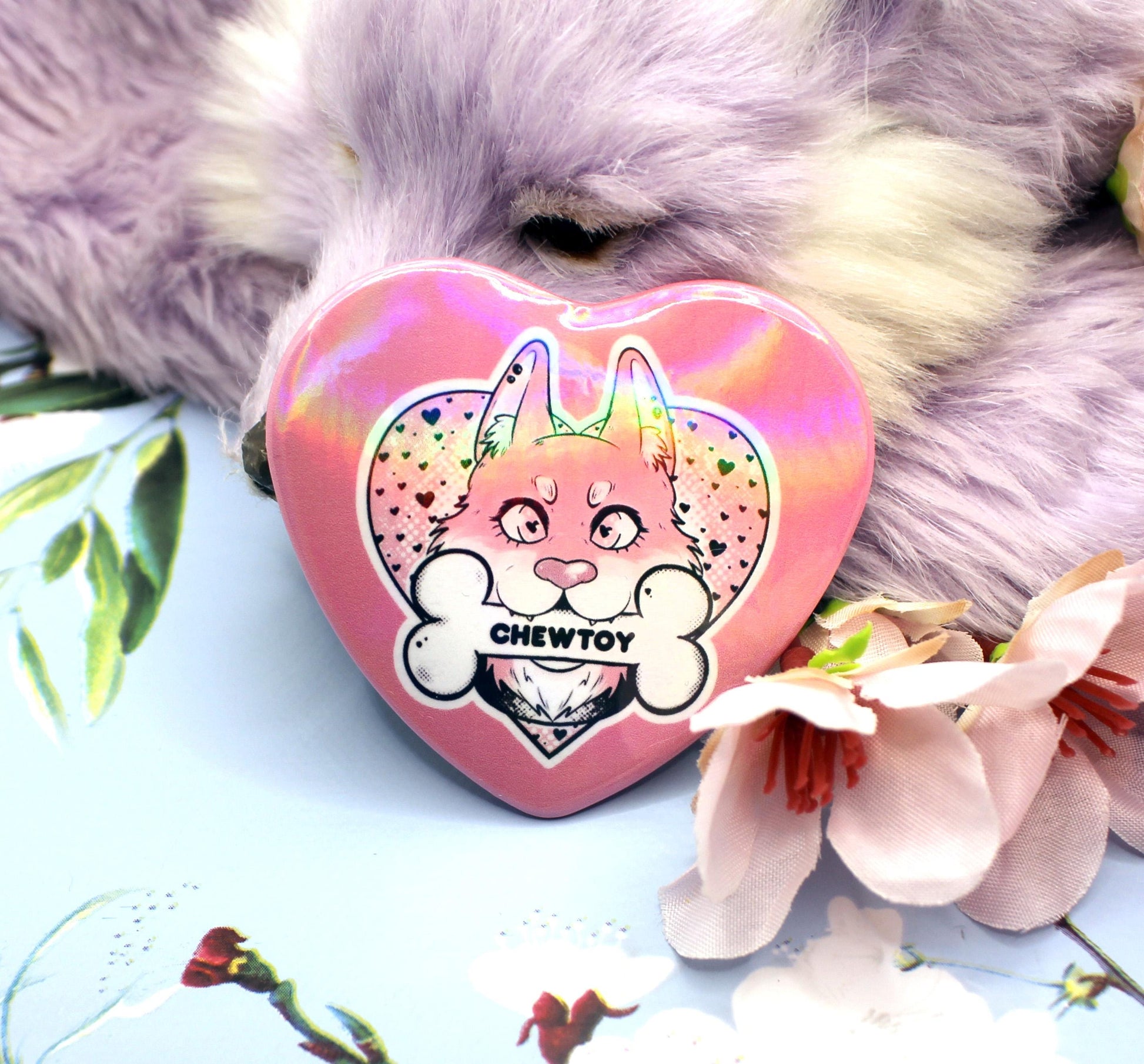This 'Chew Toy' badge is heart shaped with a clear glossy finish.