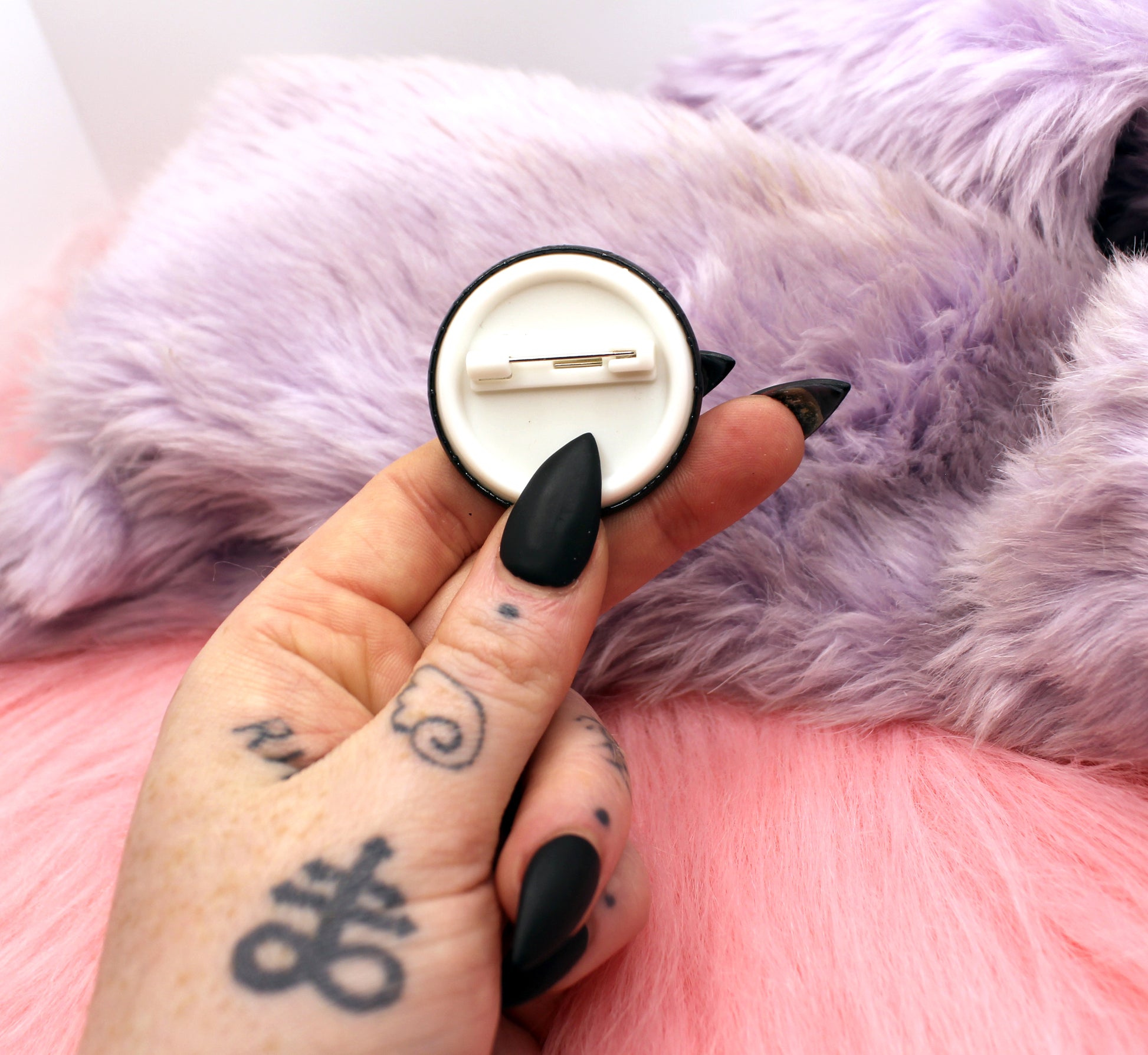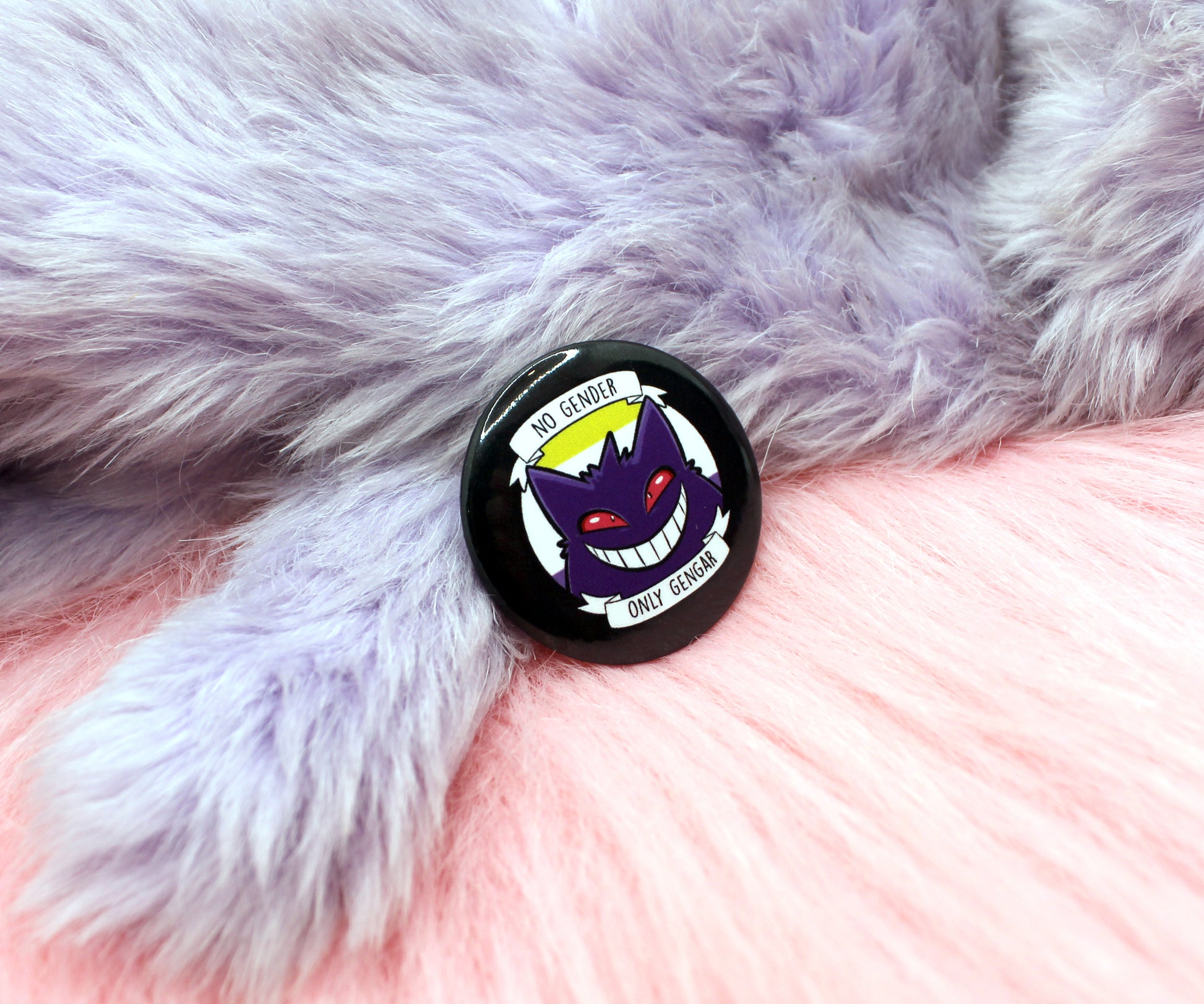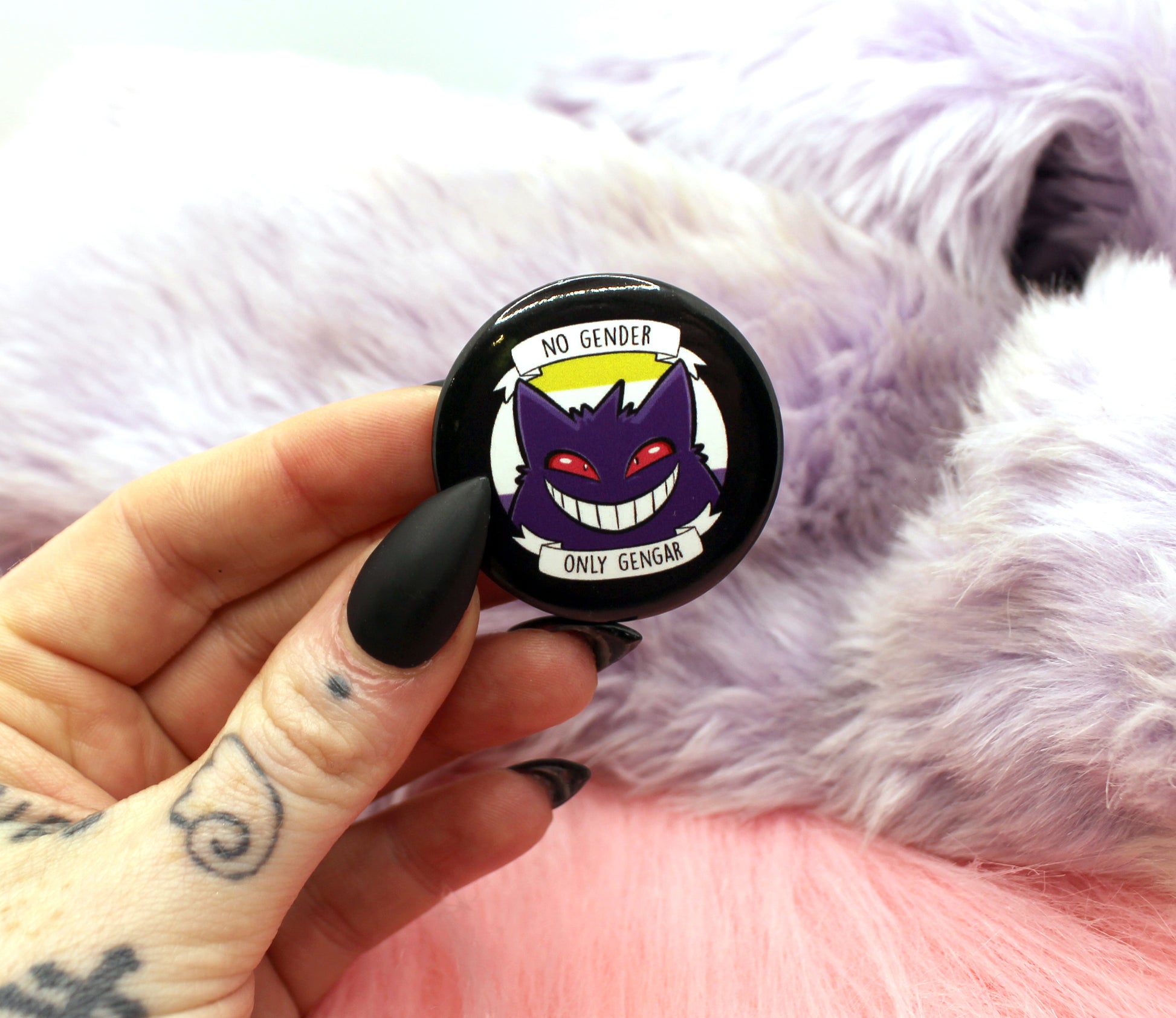 A 38mm badge featuring Gengar smiling, with a banner that says 'no gender only gengar' and a nonbinary flag in the background, is a colorful and inclusive accessory that celebrates both the beloved Pokémon character and the principles of gender inclusivity.