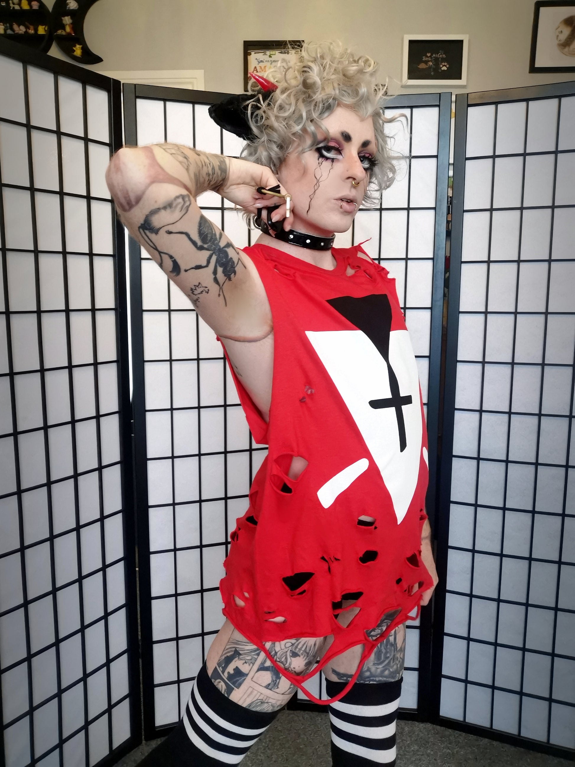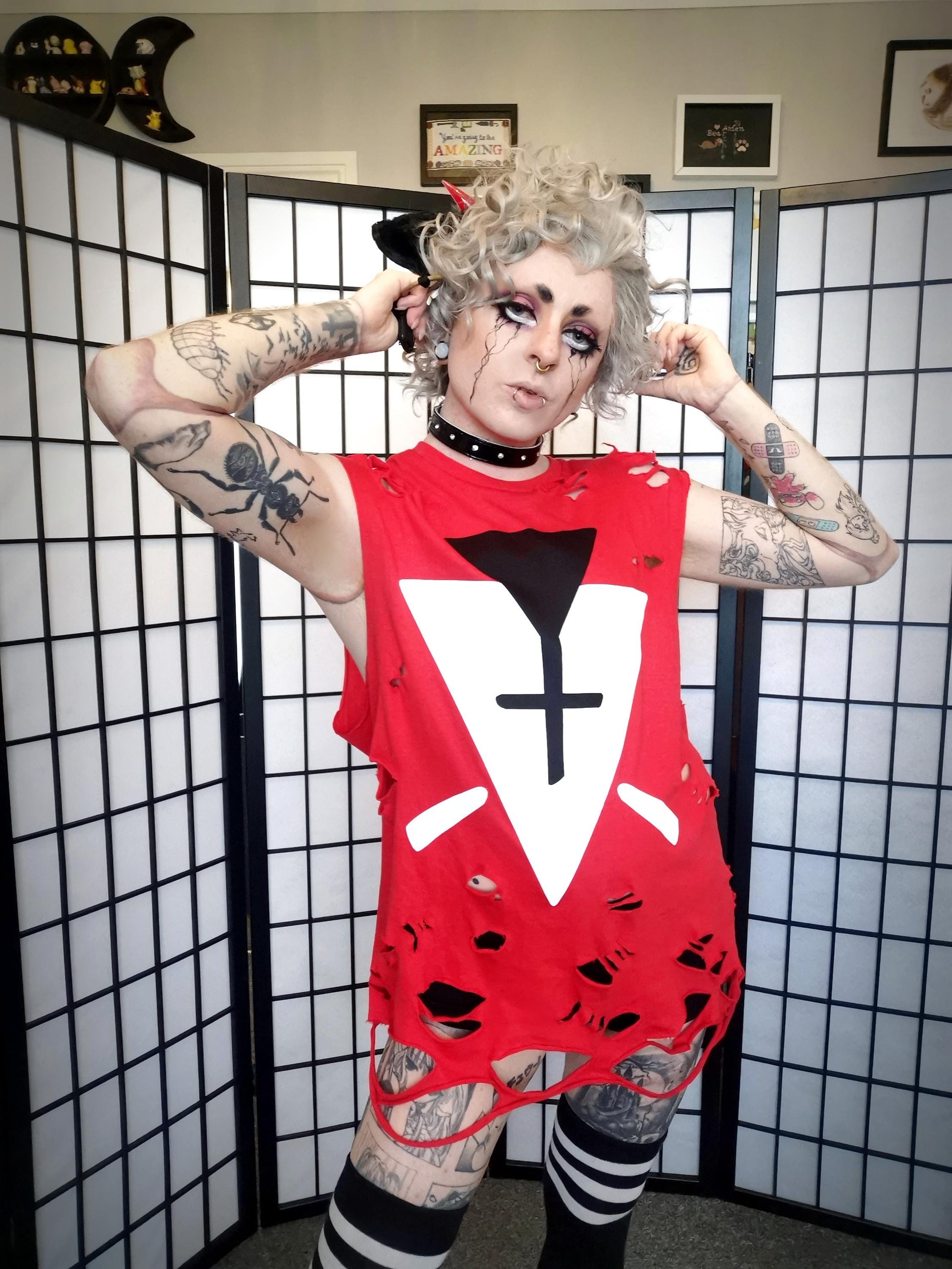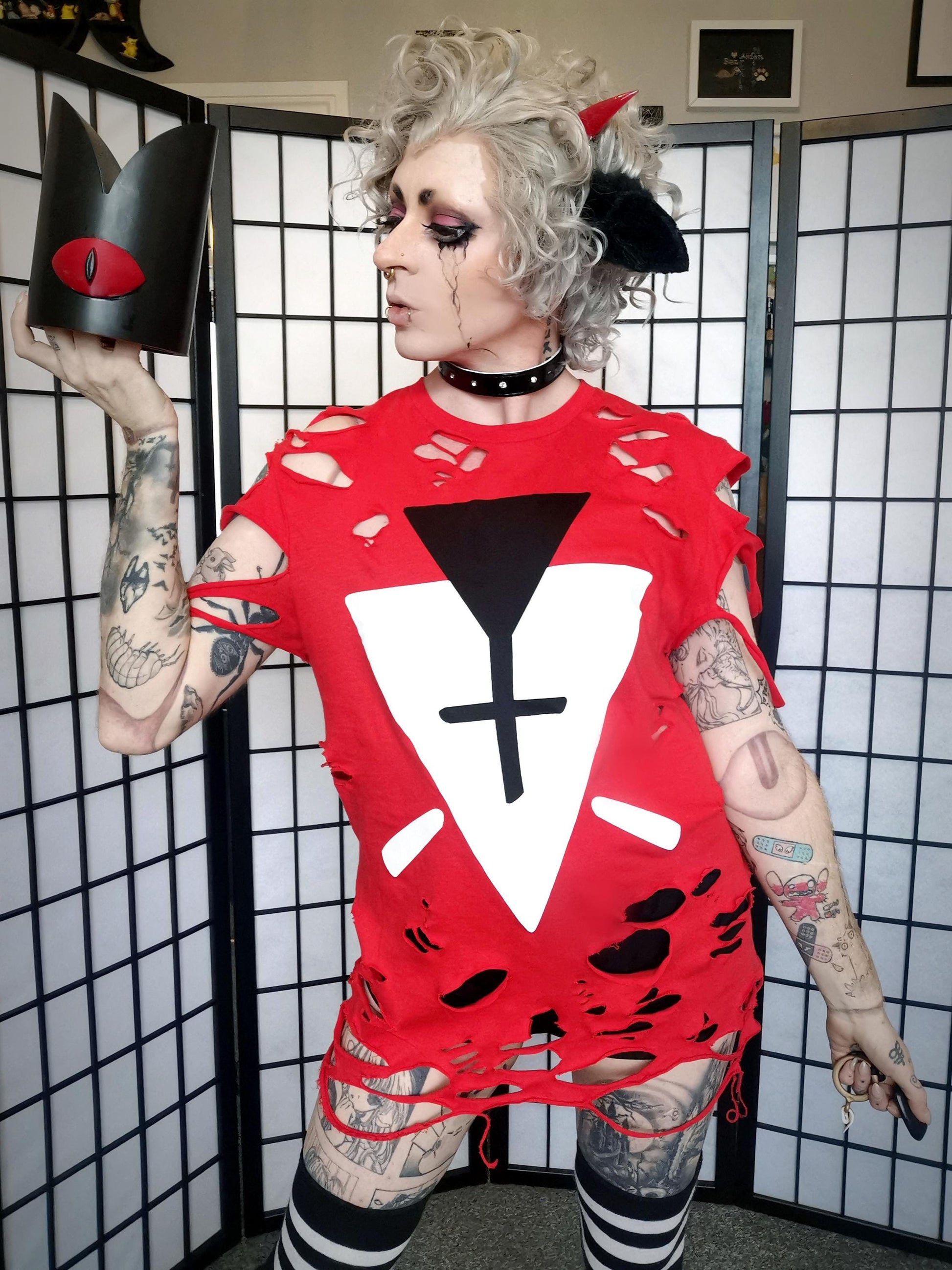These Cult of the Lamb inspired -shirts are unisex fit, made from 100% soft style yarn cotton, and are a 150gsm weight. They are red with a black and white diamond and triangle motif, based on the cultist follower outfits from the game.