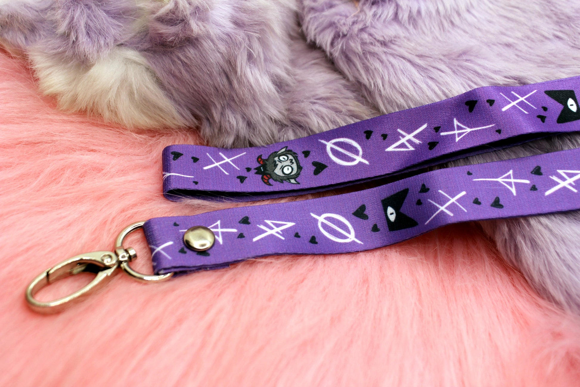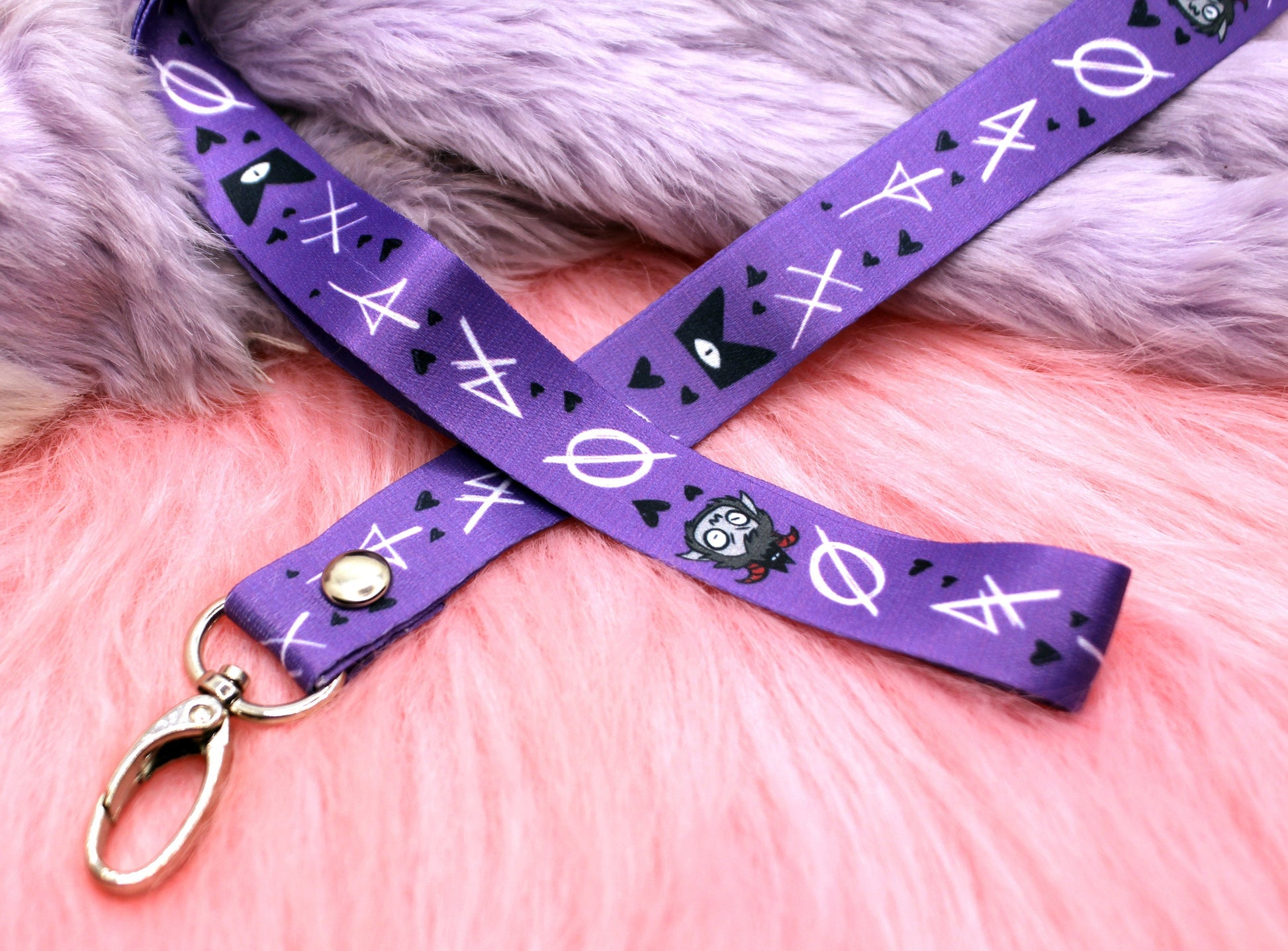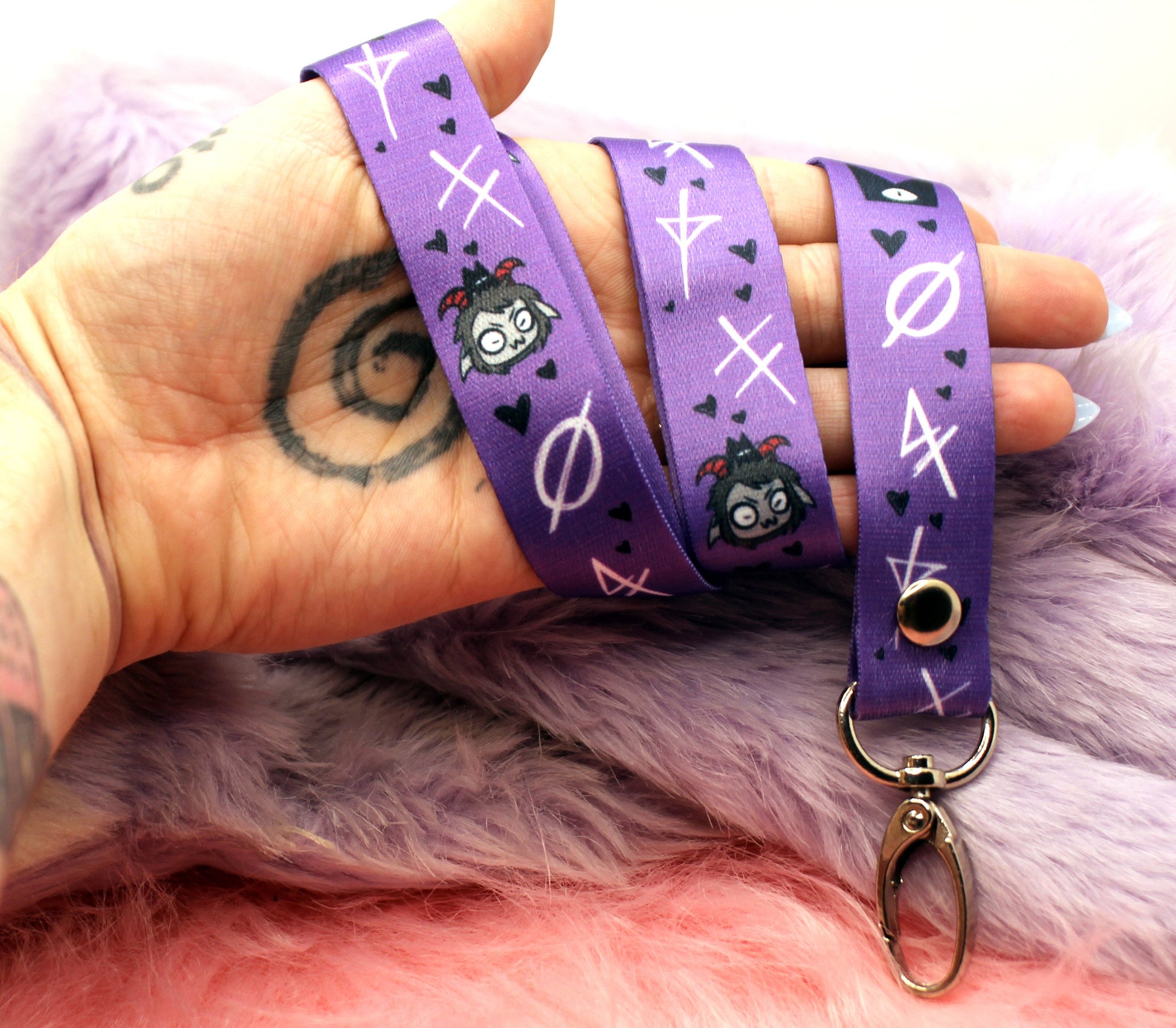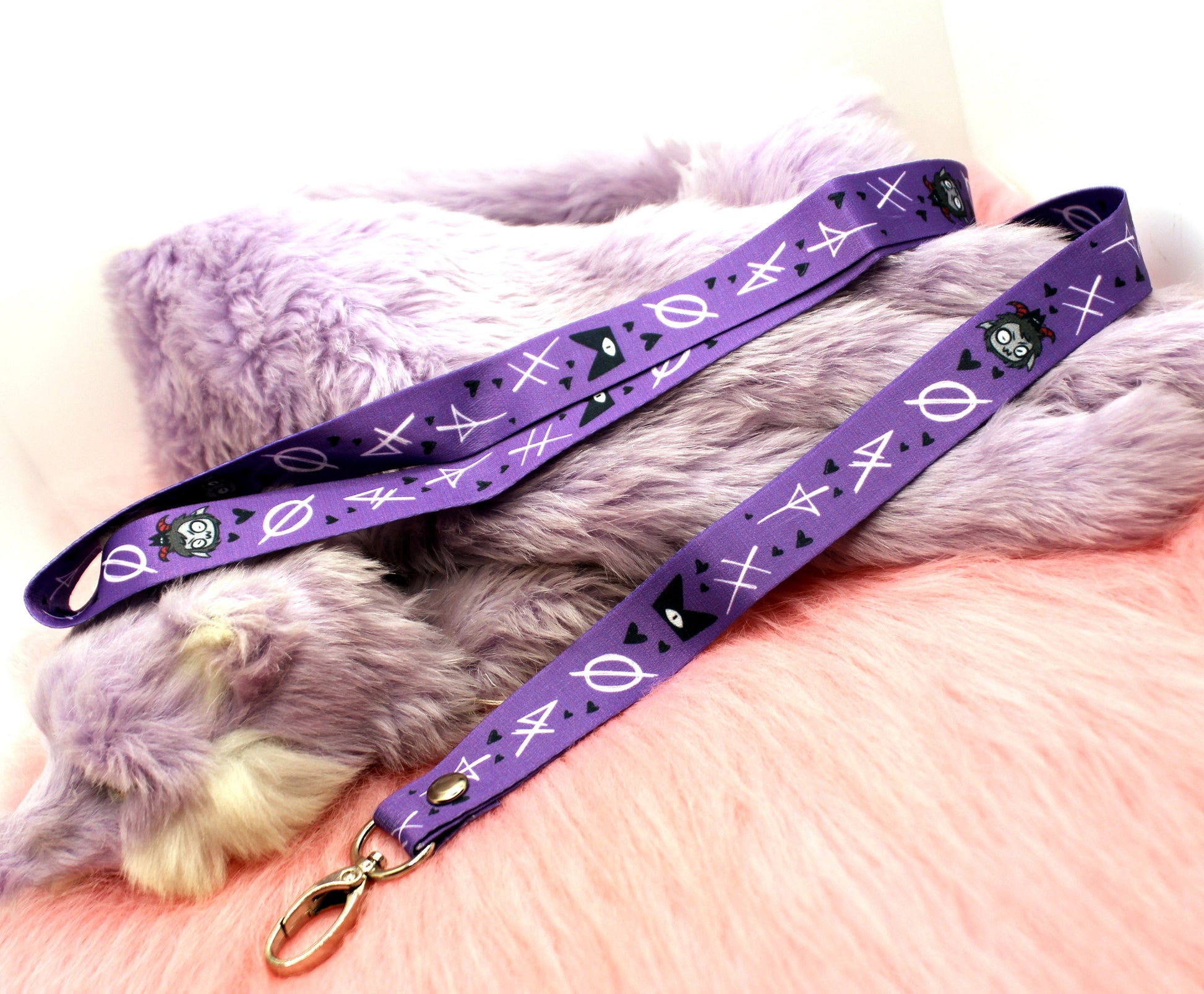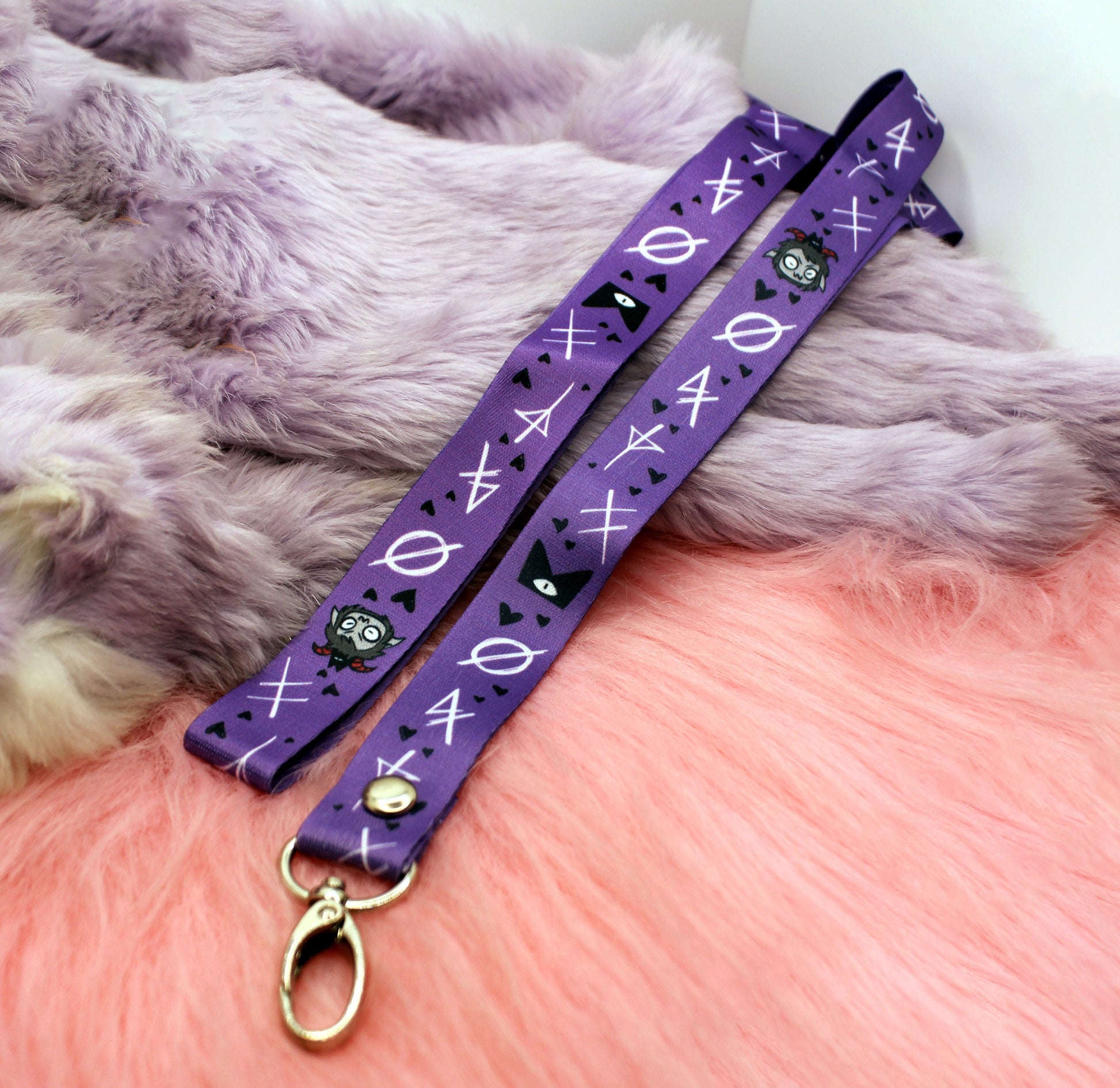These purple Cult of the Lamb Goat inspired Lanyards are 2cm by 90cm with a lobster clasp style clip on the end to attach your keys, cards, phone or wallet.