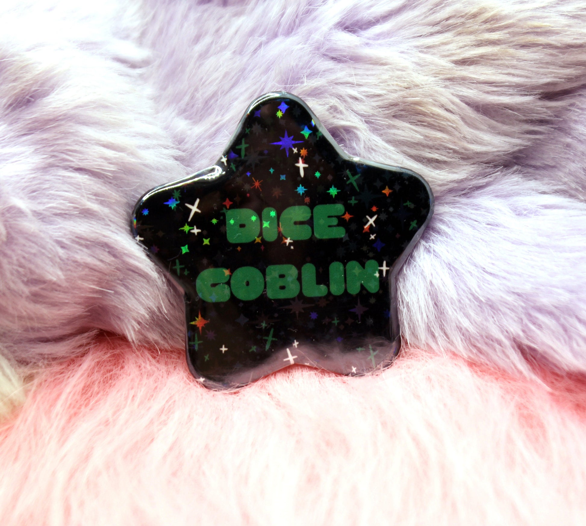 Inspired by the goblins found in the table-top role playing game Dungeons and Dragons, this 55mm star badge has a holographic finish and a metal pin back.