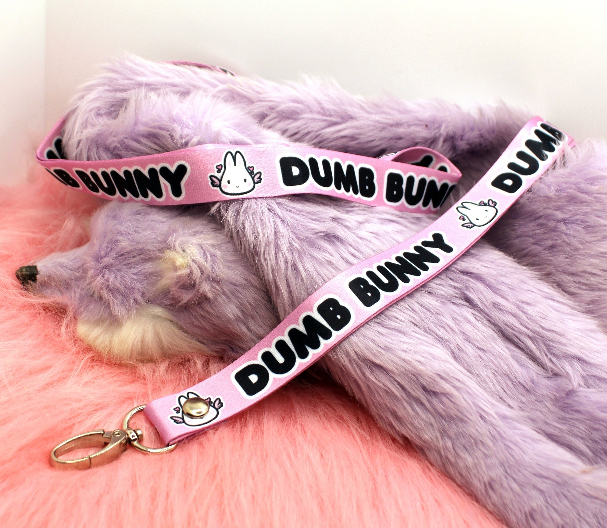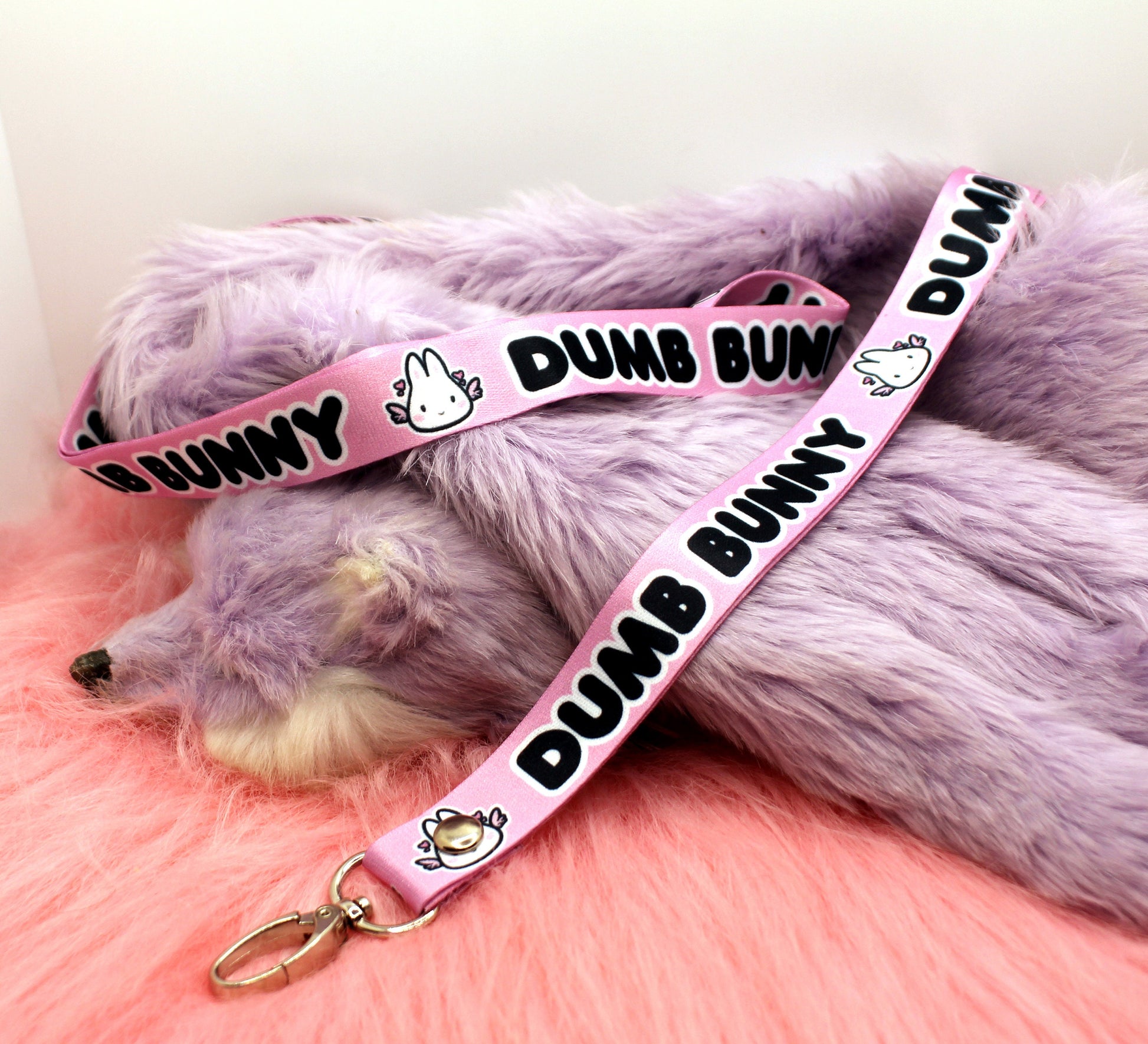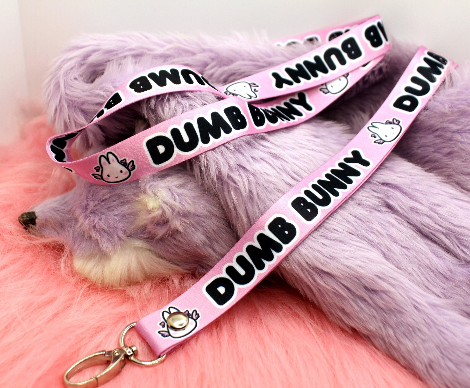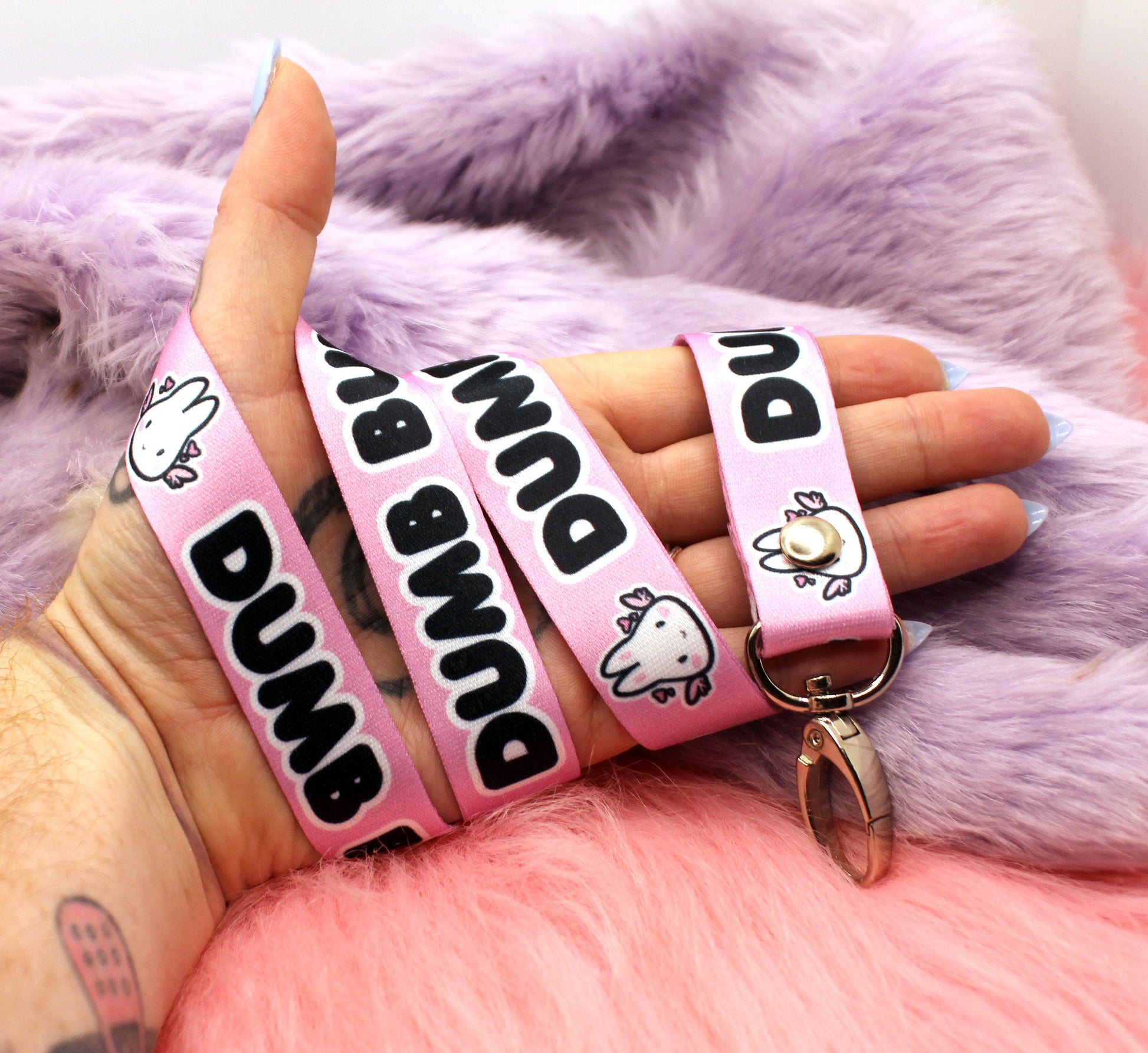 These pink Dumb Bunny Lanyards are 2cm by 90cm with a lobster clasp style clip on the end to attach your keys, cards, phone or wallet.