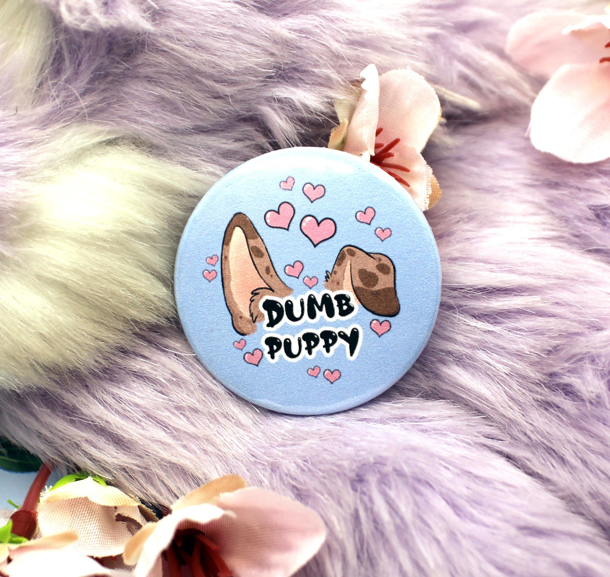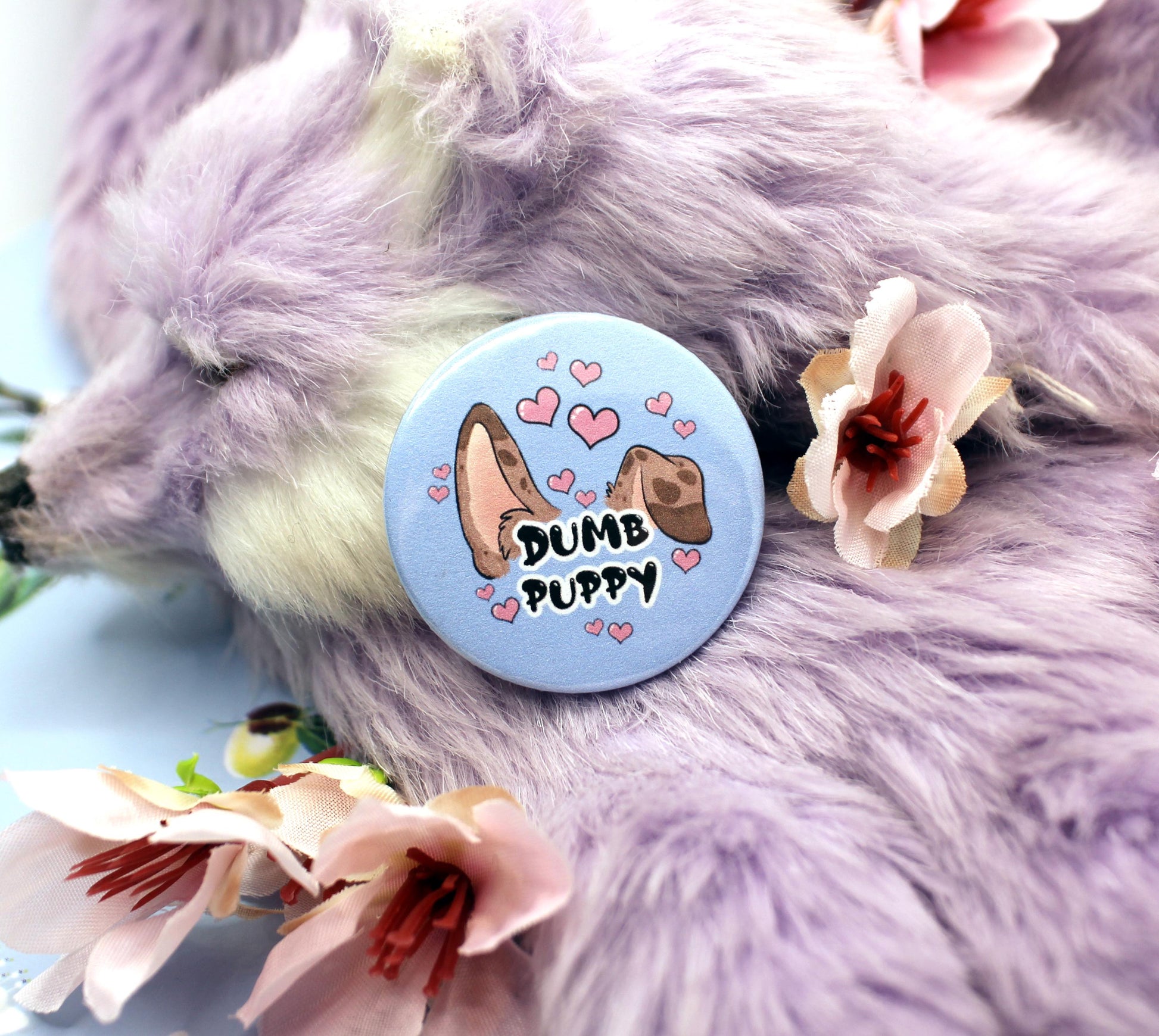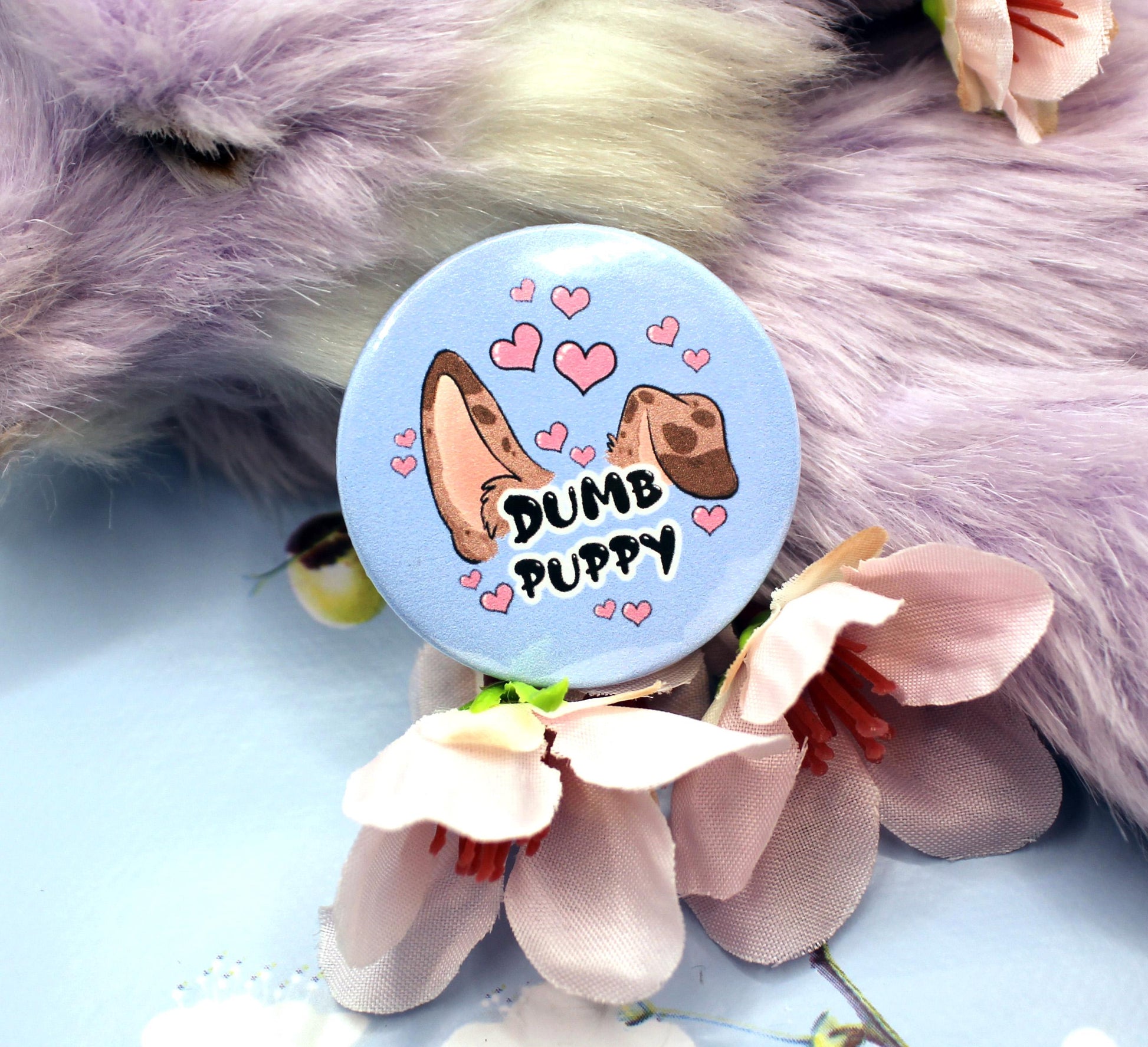 The artwork depicted on the badge is a pair of brown cartoon puppy ears, surrounded by pink hearts on a pastel blue background. Beneath the dog's ears is text that reads 'Dumb Puppy' in a black and white bubble font.