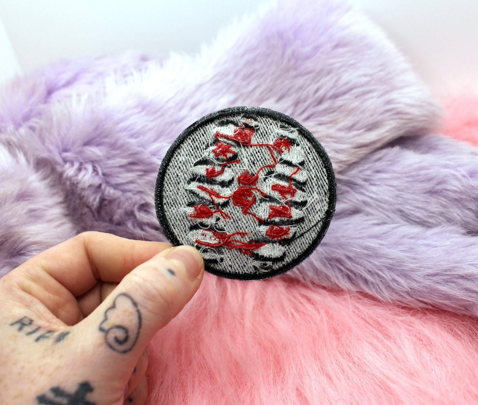 It is 6cm in size with details embroidered onto the front in red and white thread.