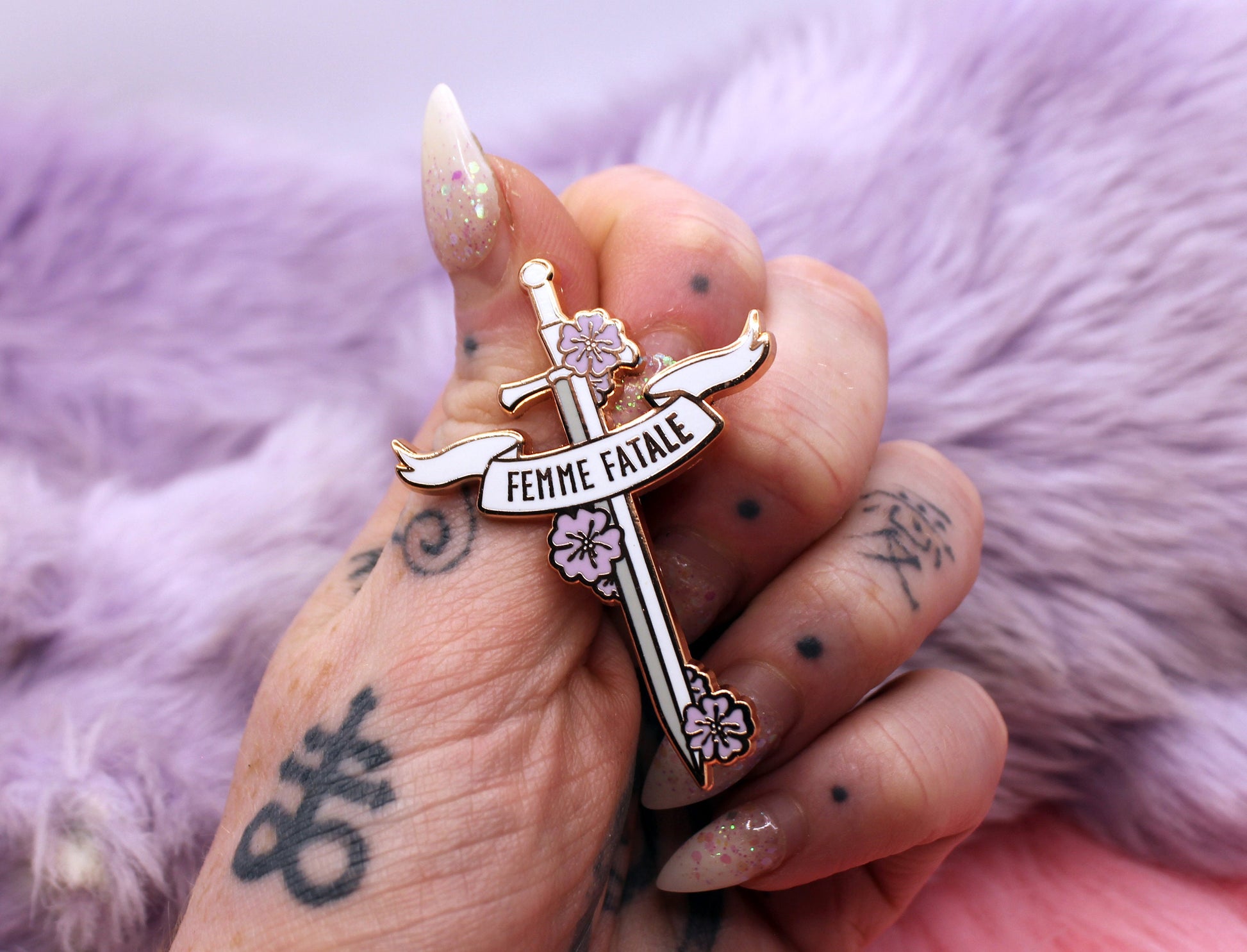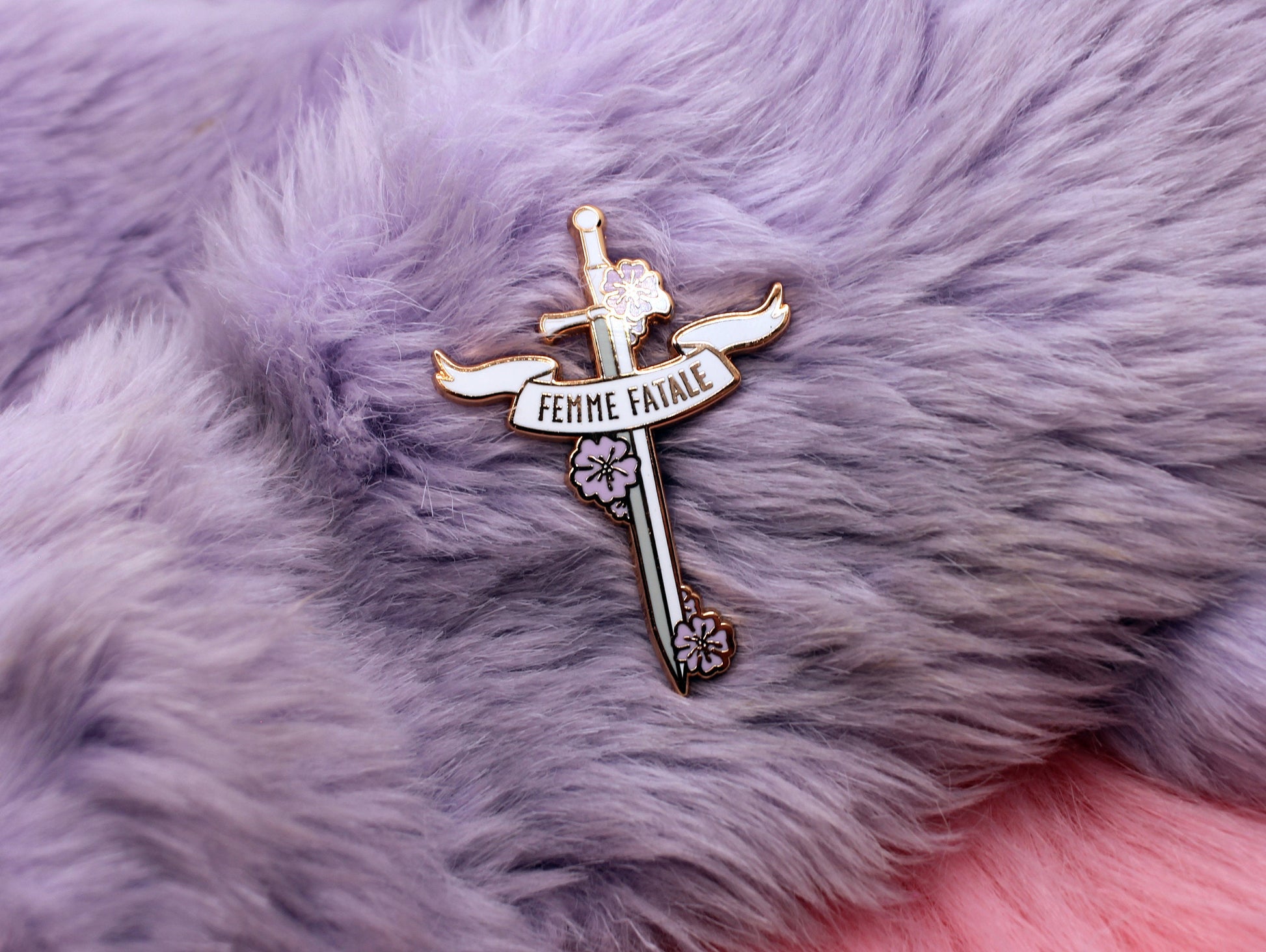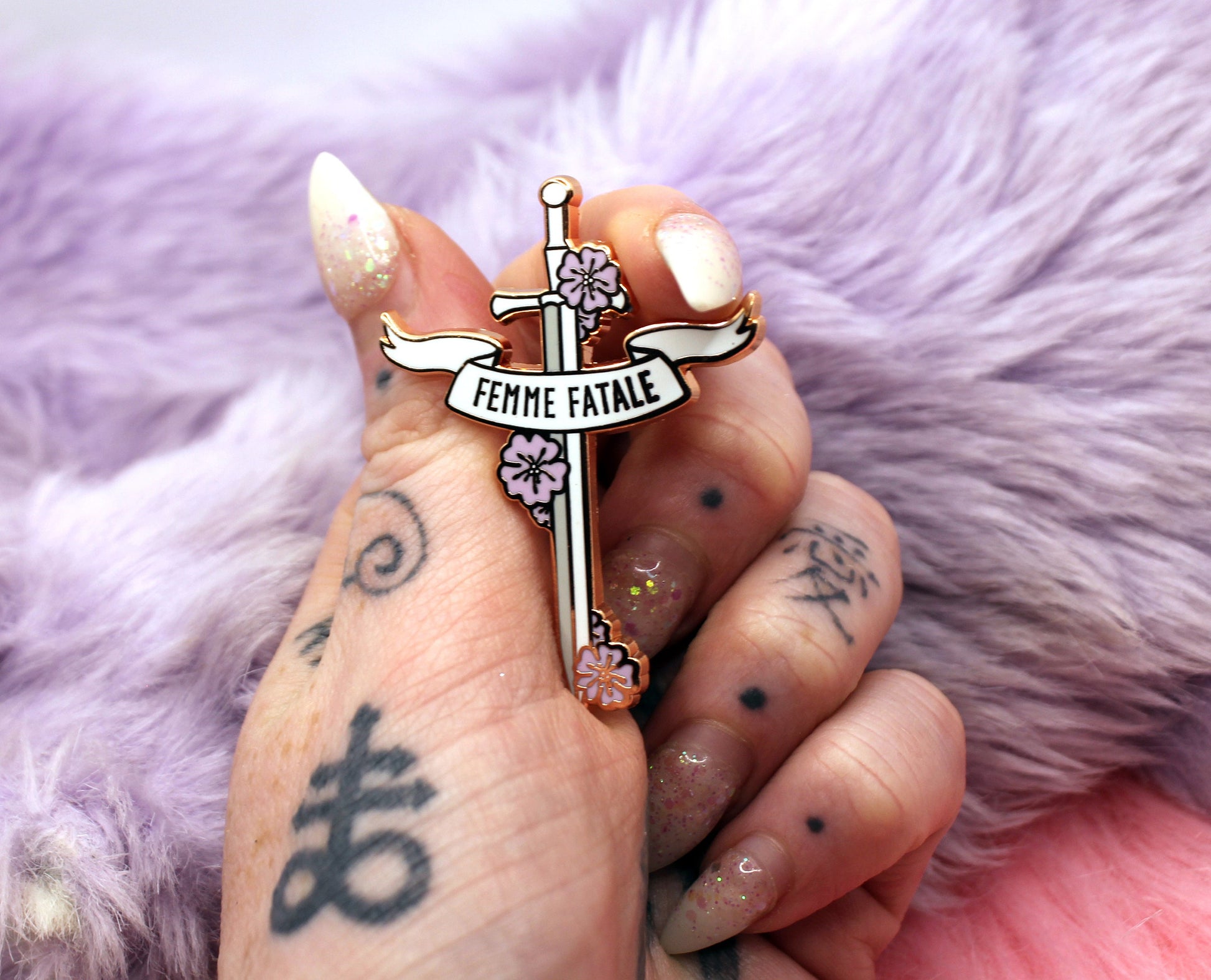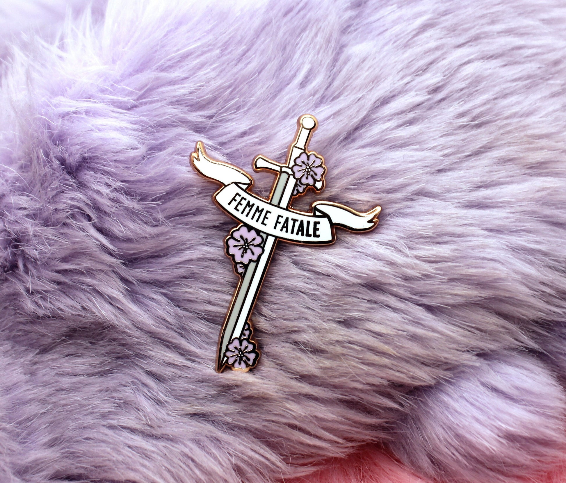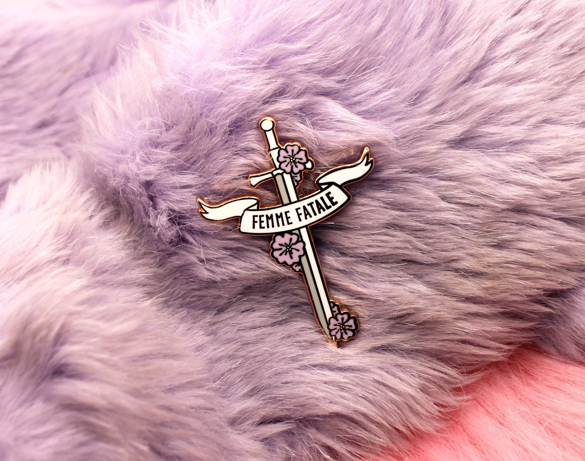 Inspired by the phrase 'Femme Fatale' this pin makes for the perfect brooch or addition to your ita bag! It has 2 rubber back fastenings and is 2 inches tall.