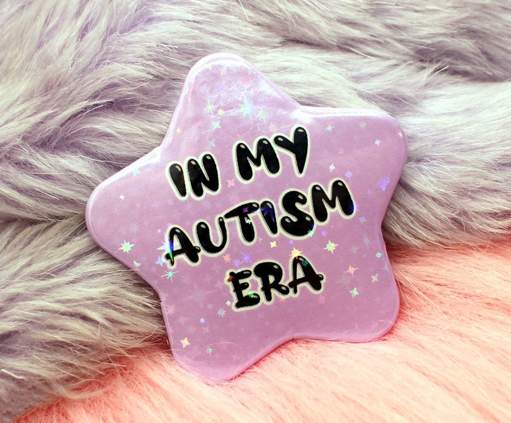 These star badges have a sparkly holographic finish, are approximately 55mm in size and have a safety-pin style back.