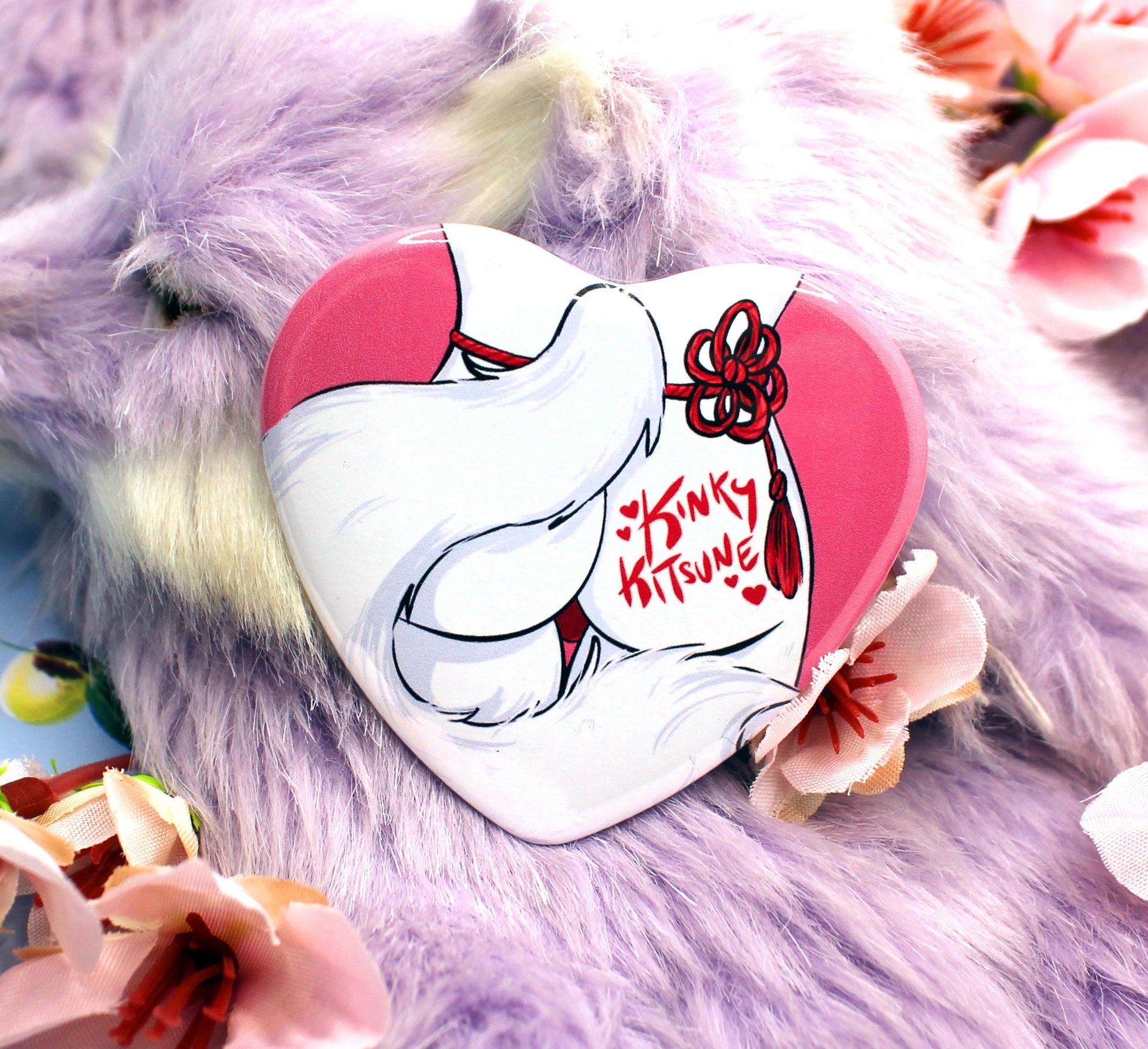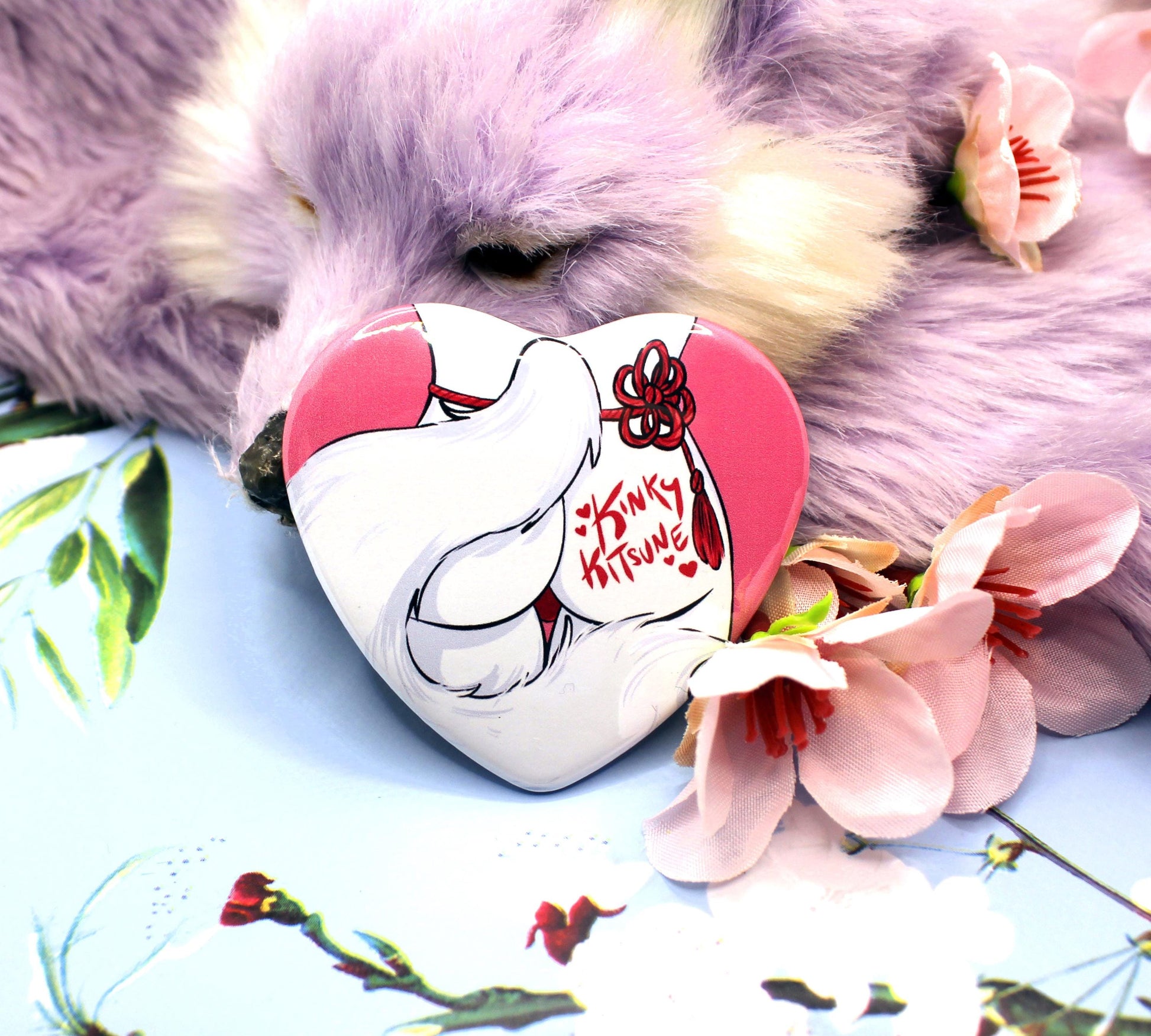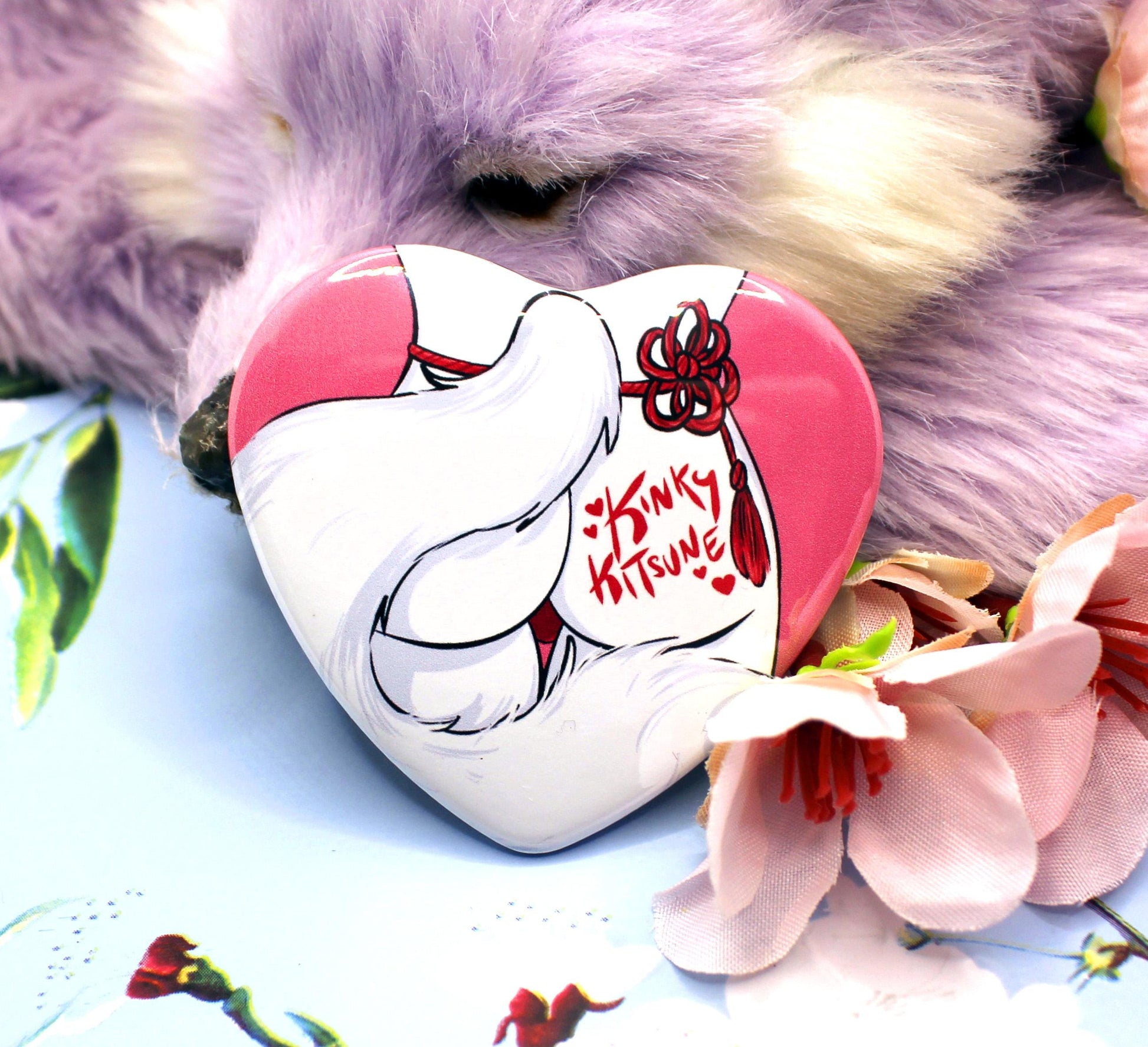 This 'Kinky Kitsune' badge is heart shaped with a clear glossy finish.