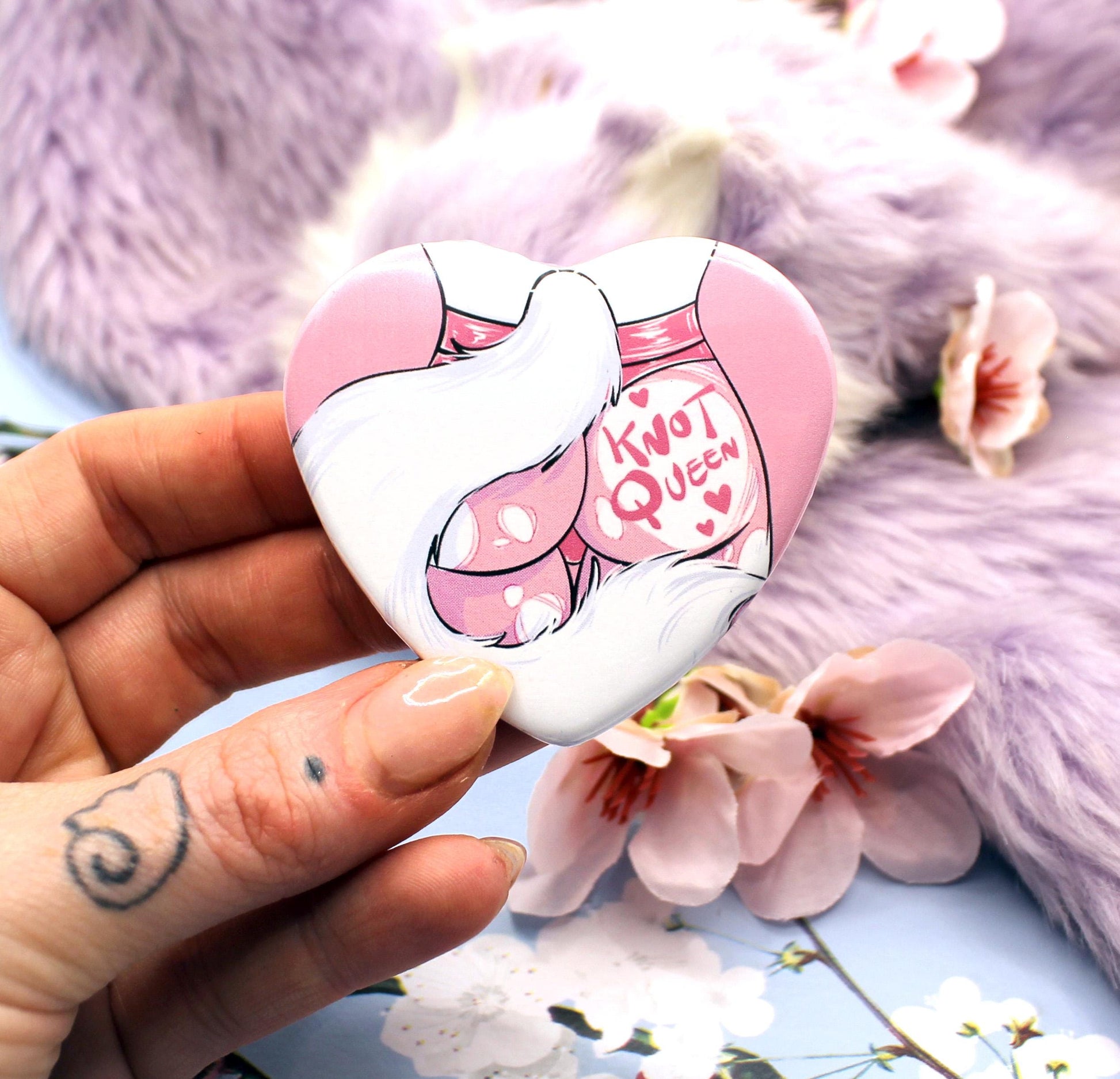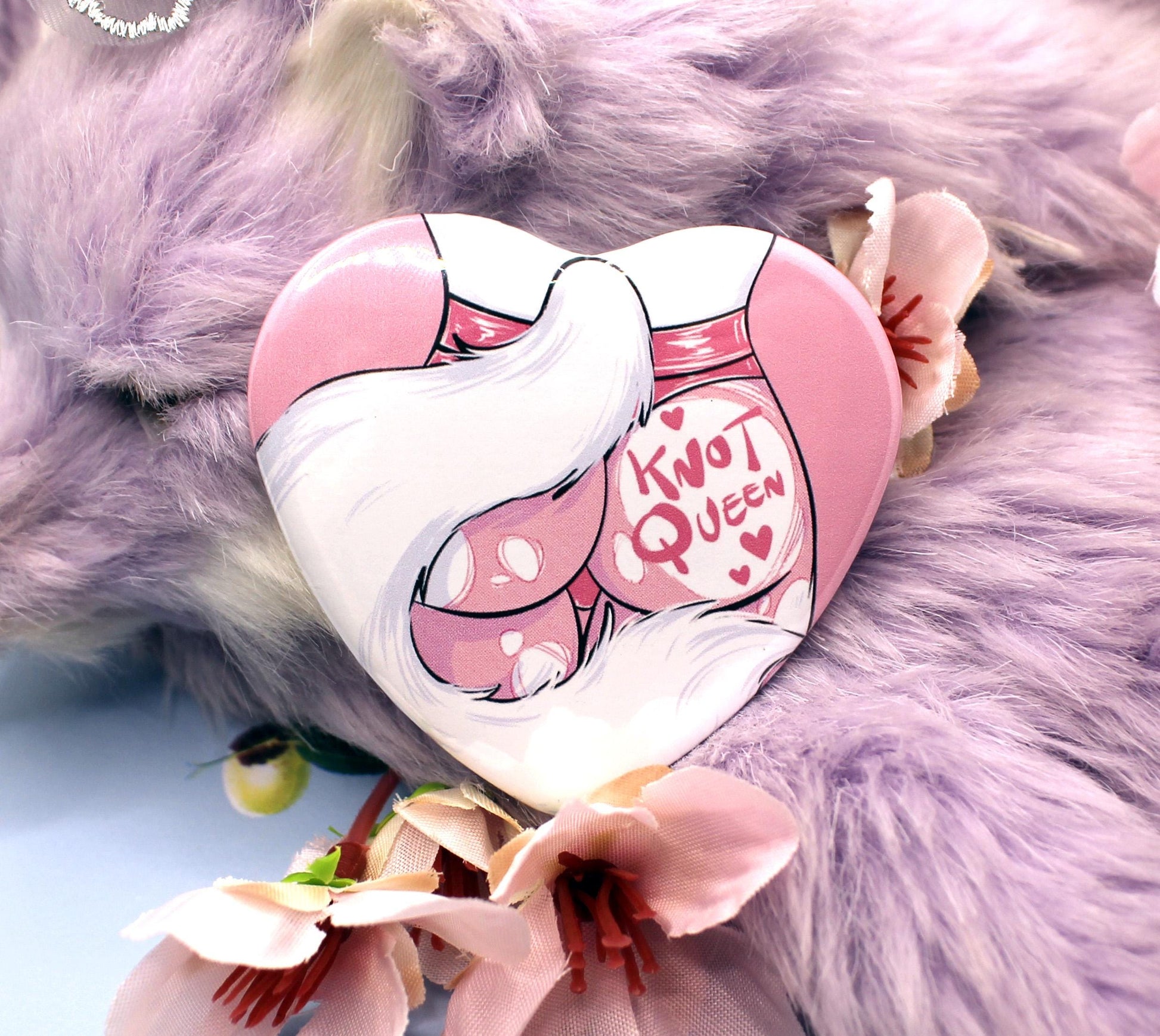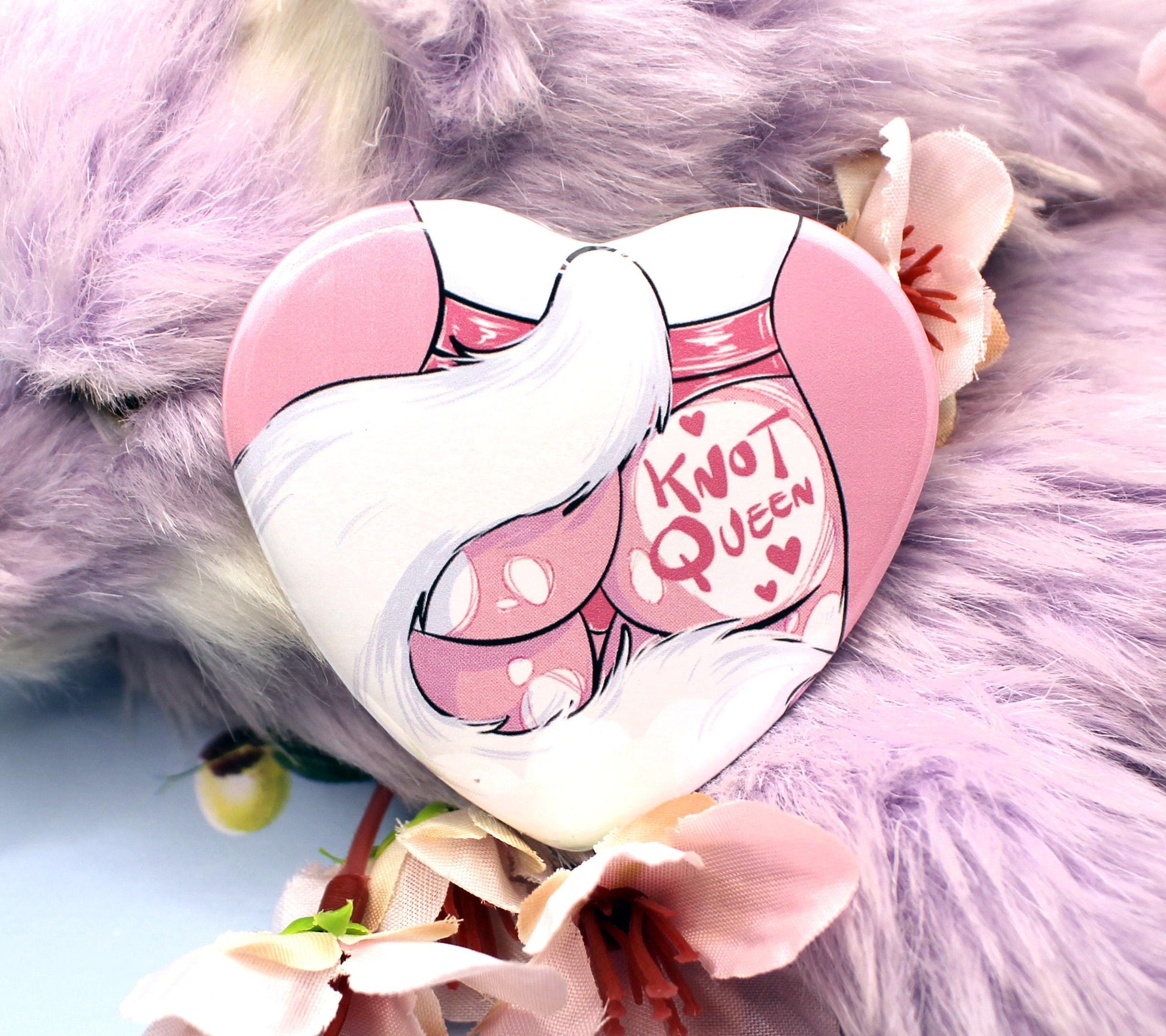 The artwork depicted on this badge is a white fox or wolf's butt and thighs, wearing pastel pink lingerie and torn fish nets. On the right butt-cheek is text that reads 'Knot Queen'.