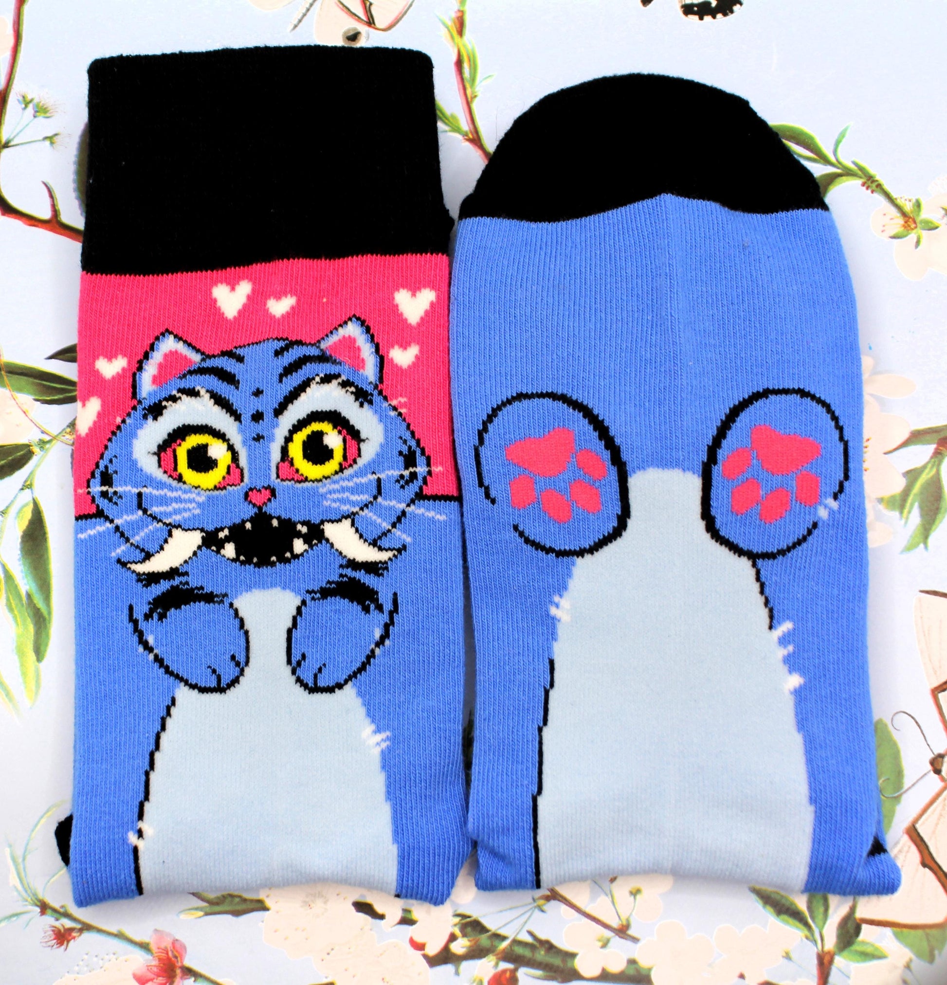 These socks are inspired by the Netflix film Kpop Demon Hunters, featuring Derpy Tiger on a pink heart patterned background.