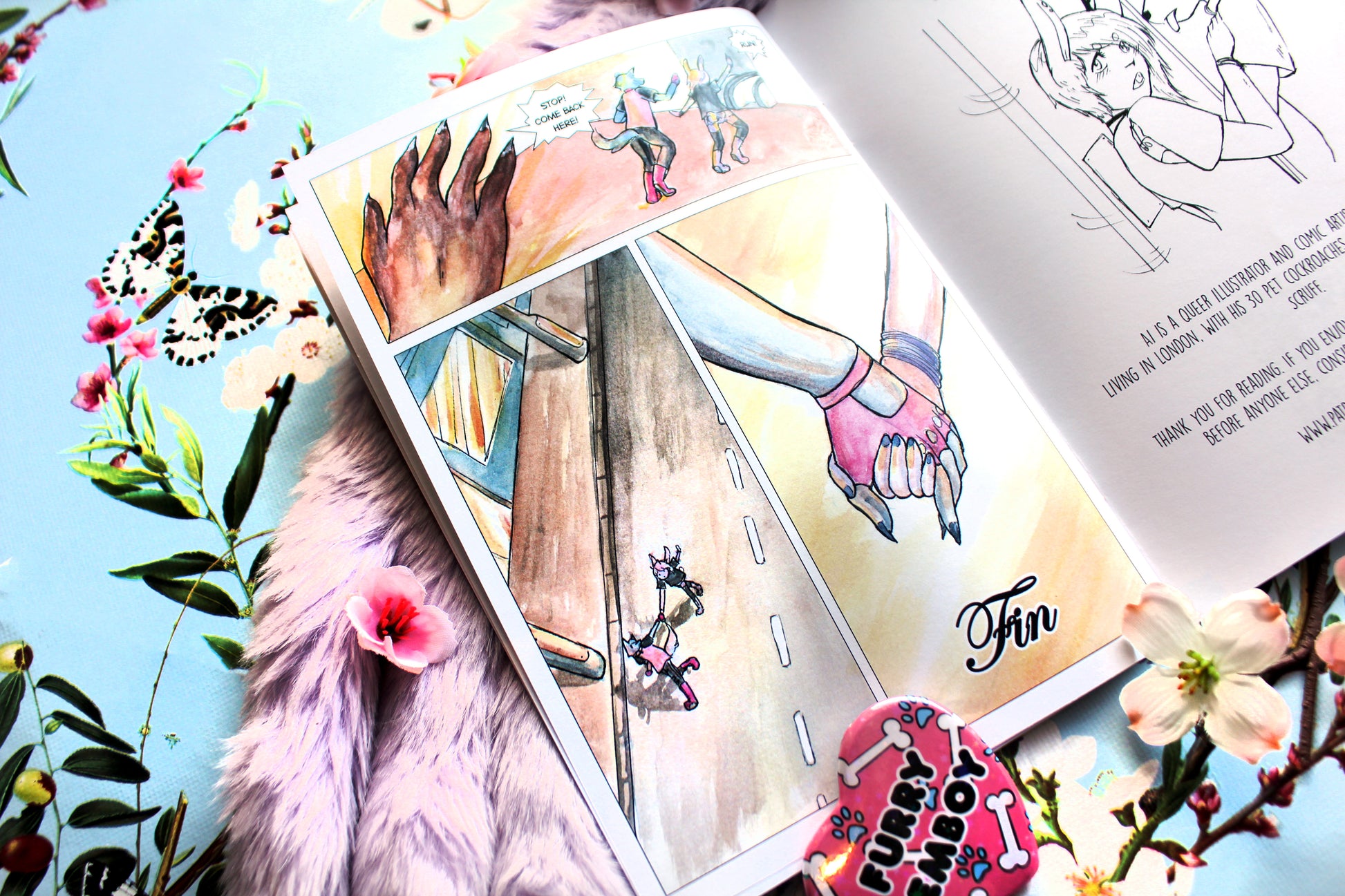 The comic is 12 pages long, and entirely created with watercolour paints and black fine liner.