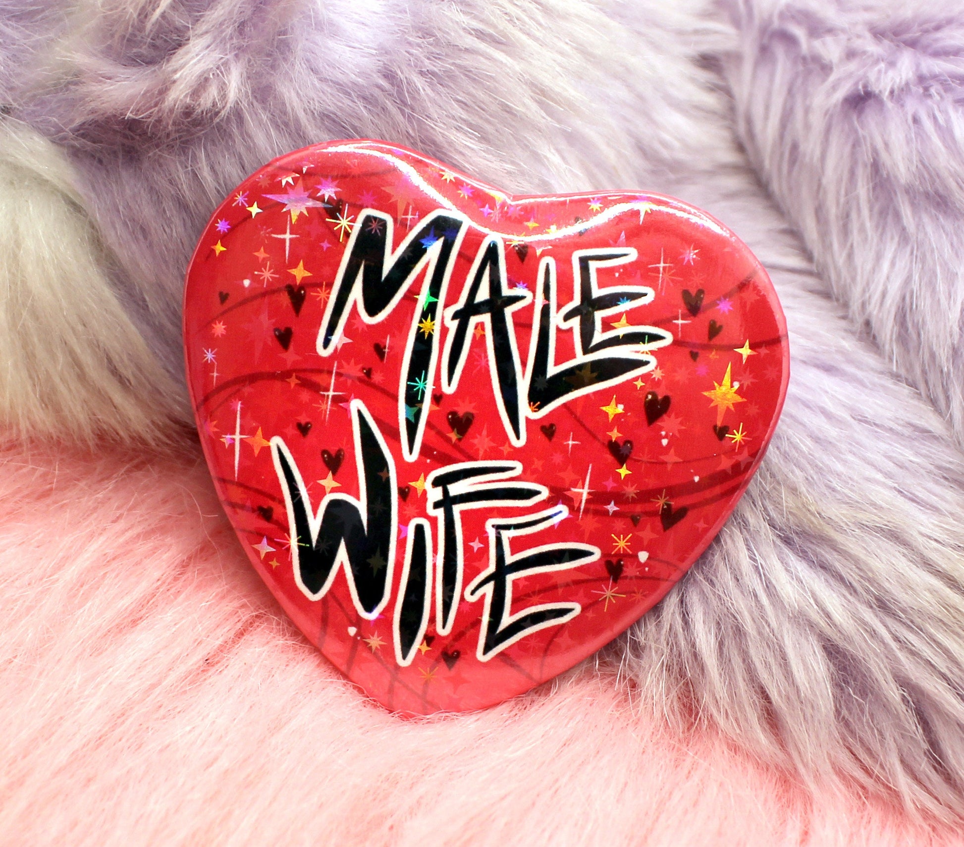 This Male Wife badge is heart shaped with a sparkly glossy finish.