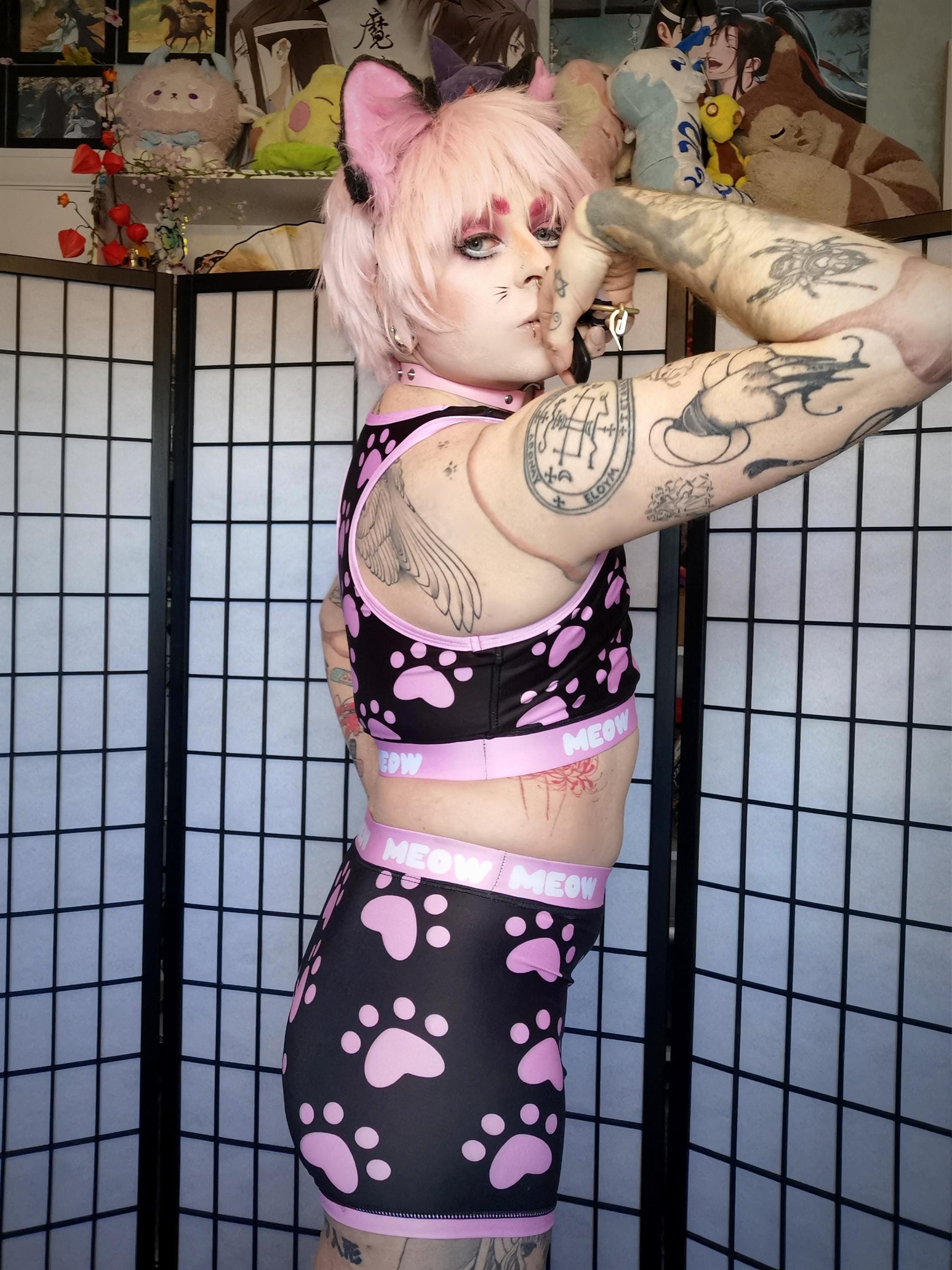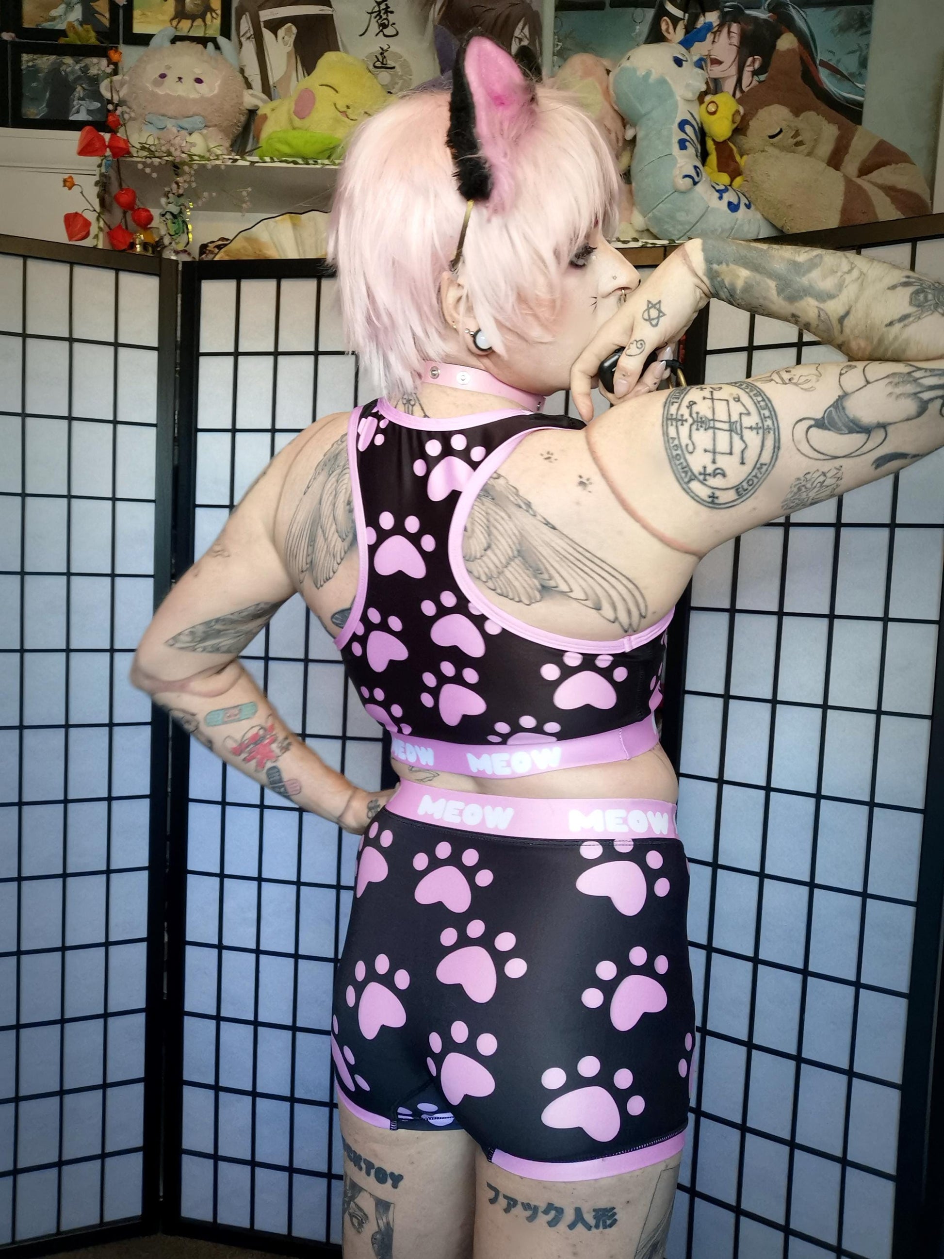 These pet play inspired meow meow cat paw Lingerie Sets are made from 87% breathable polyester and 13% spandex, making them perfect for sporting events or raves as well as undergarments!