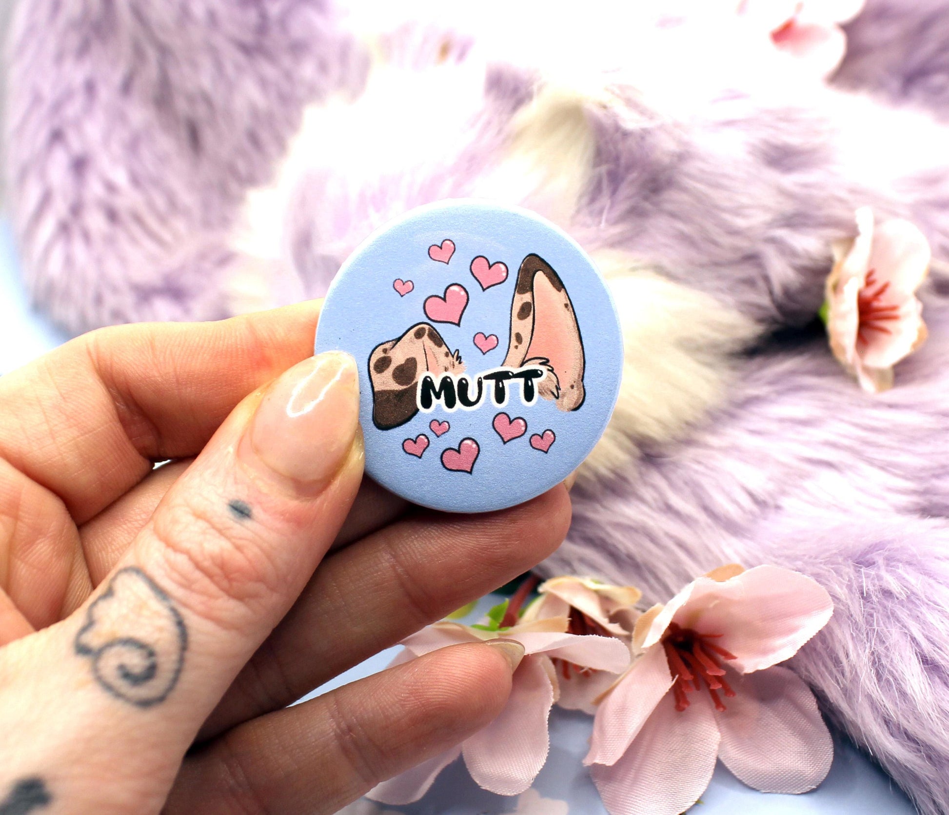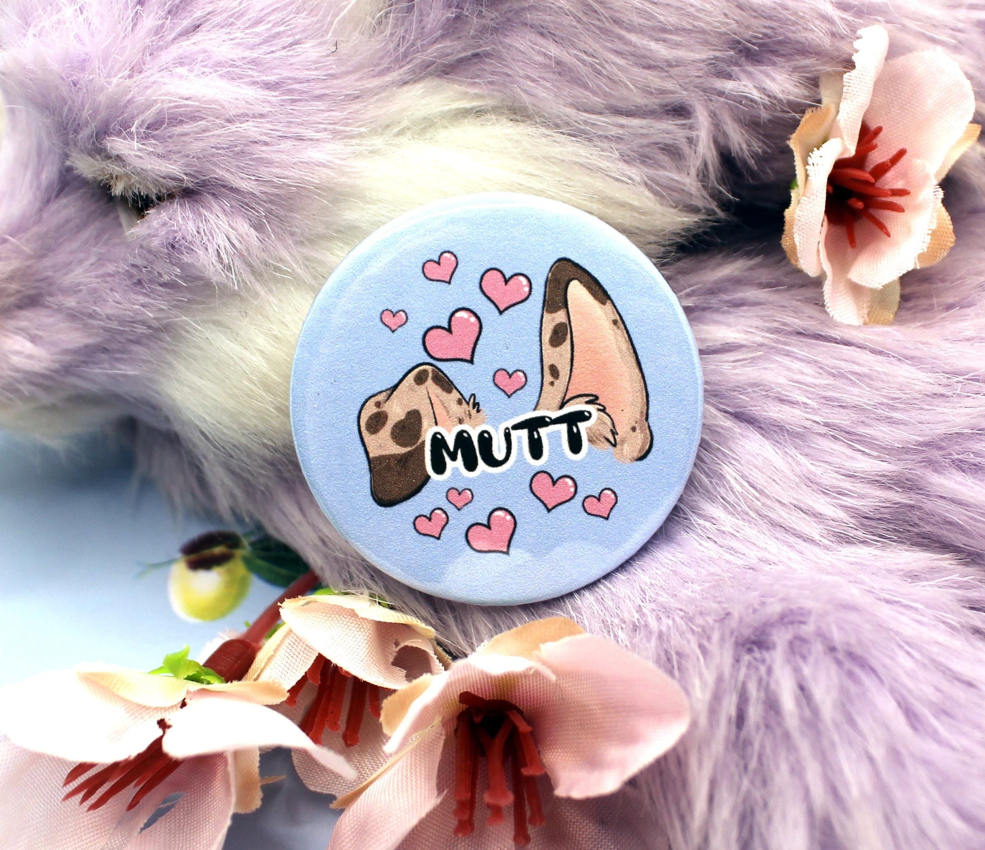 The artwork depicted on the badge is a pair of brown cartoon puppy ears, surrounded by pink hearts on a pastel blue background. Beneath the dog's ears is text that reads 'Mutt' in a black and white bubble font.