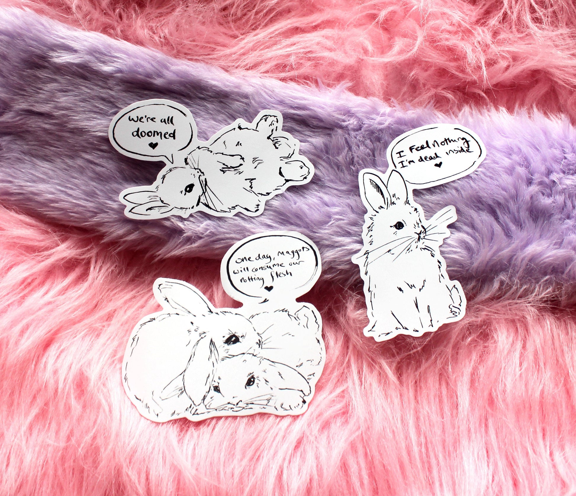 Look, we're all doomed, life is pointless and even this tiny cute rabbit knows it. Therefore why not remind the world of it? Take this 8x5cm sticker home today, printed on gloss vinyl.