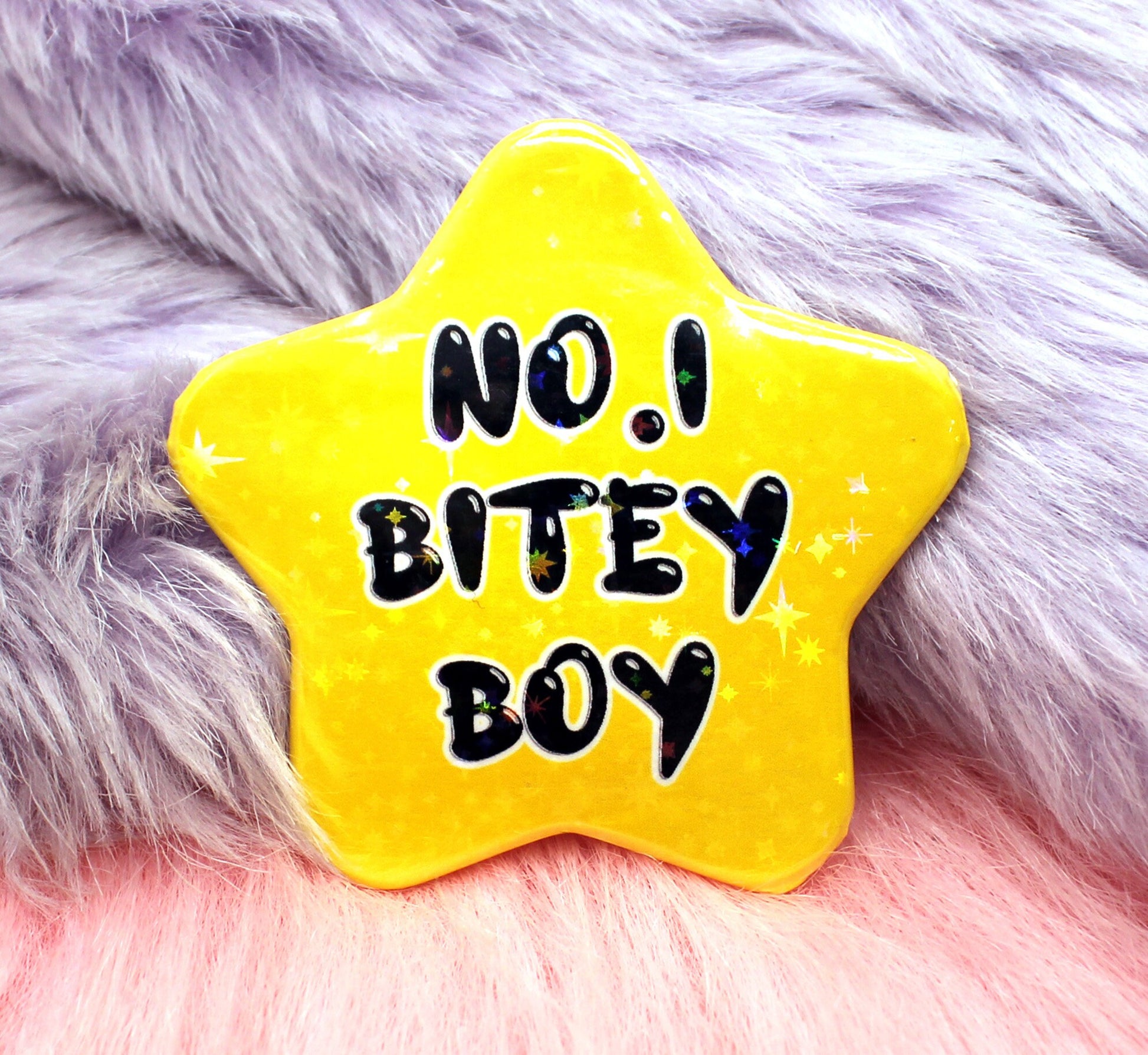 These Number One Bitey Boy star badges are 55mm approx and come with a holographic sparkle finish.