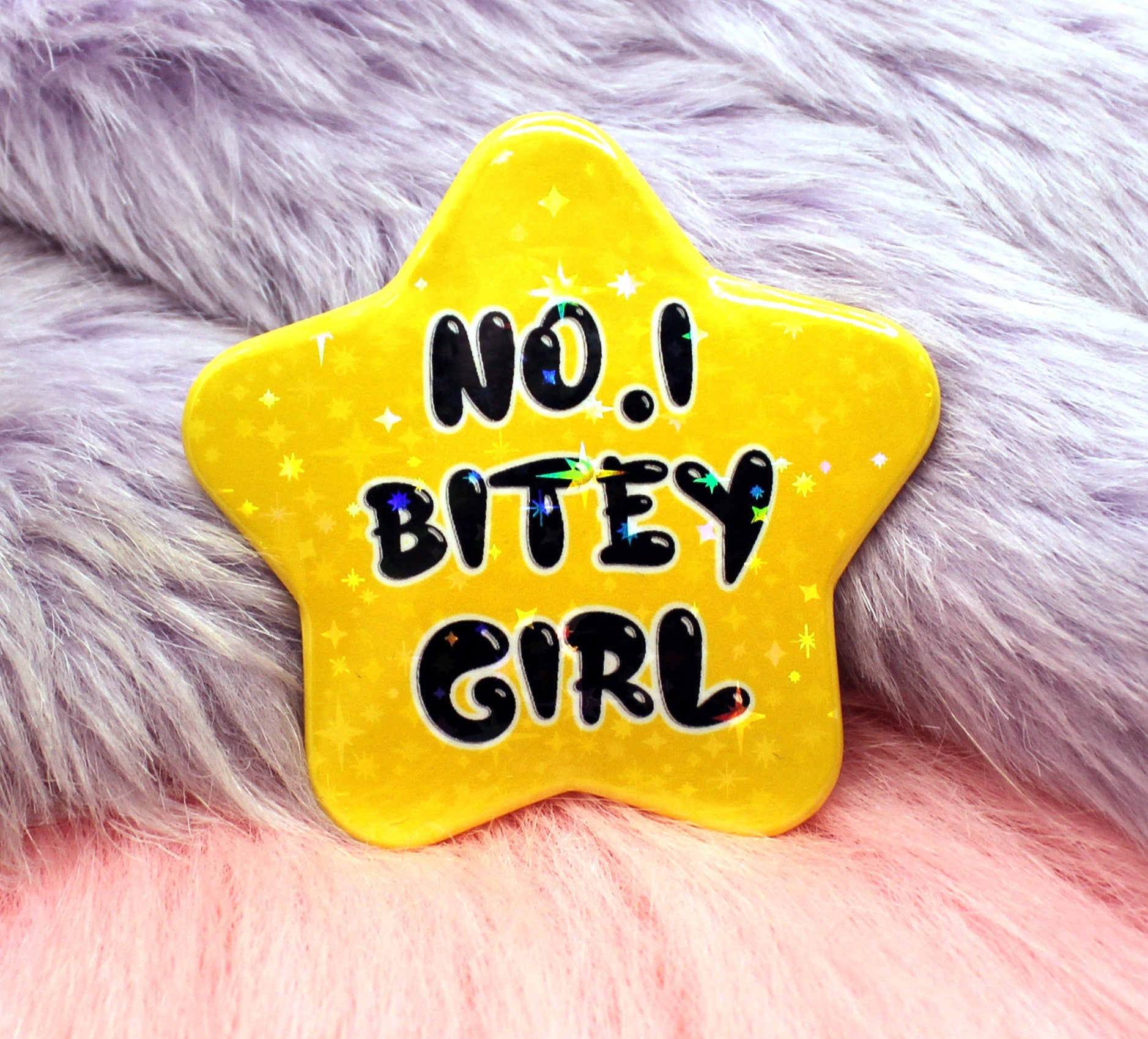 These Number One Bitey Girl star badges are 55mm approx and come with a holographic sparkle finish.