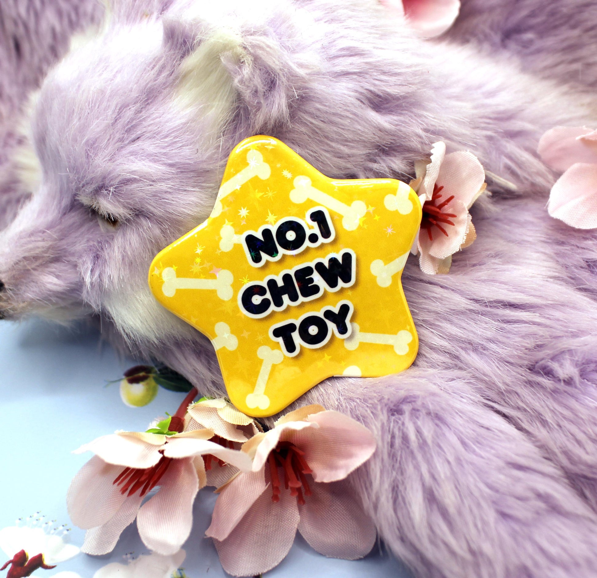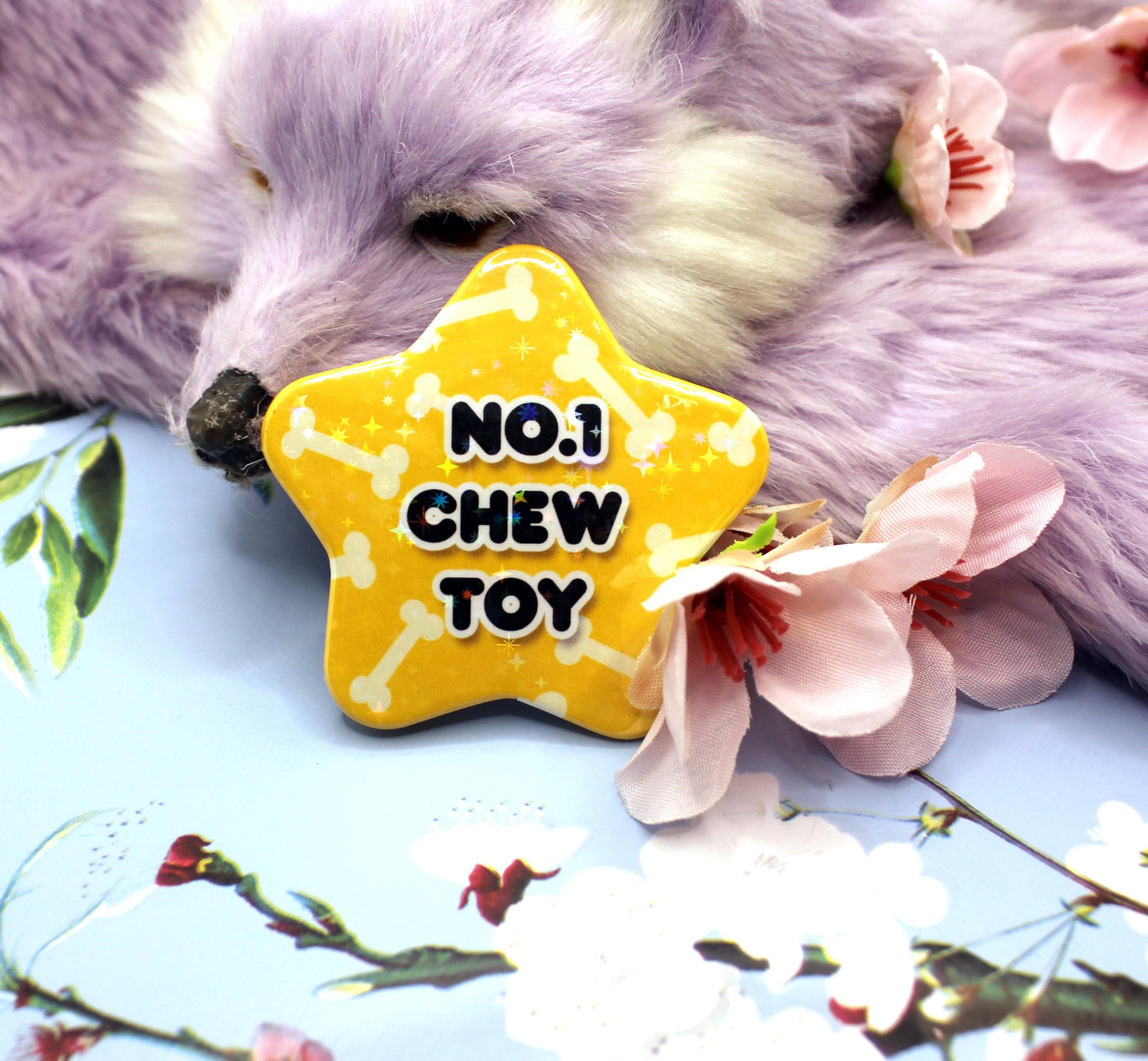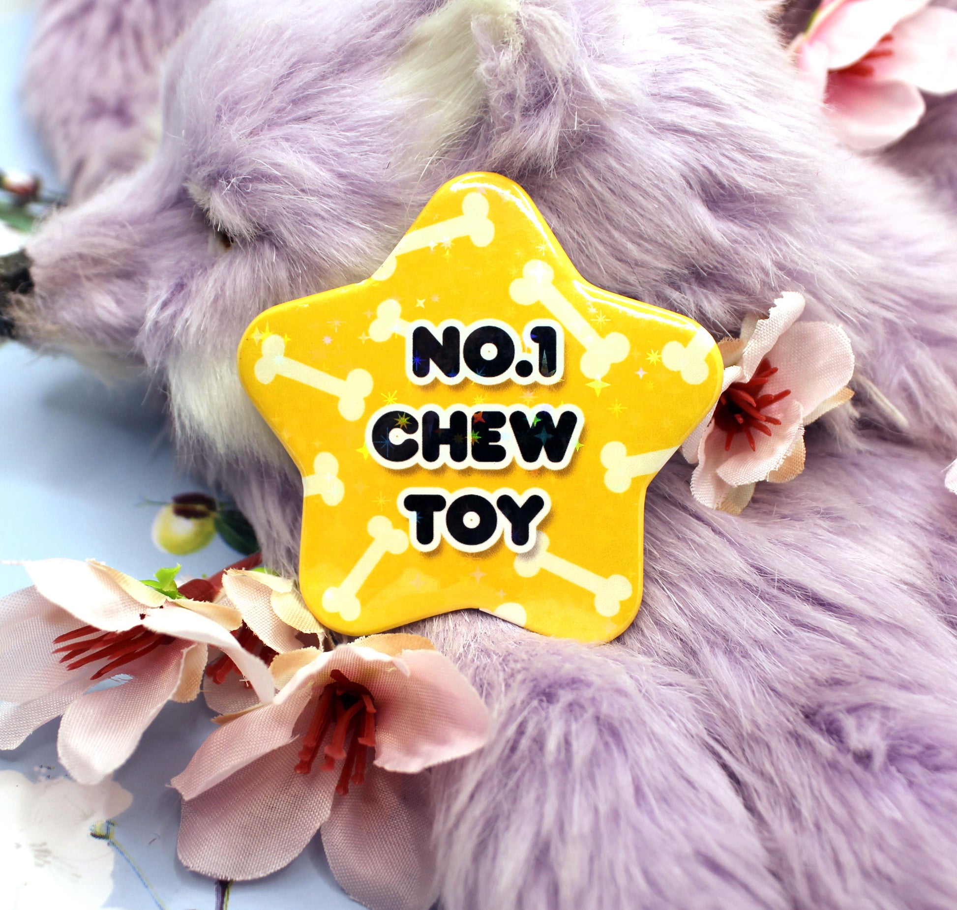 The artwork depicted on this badge is black and white text that reads 'No.1 Chew Toy' in a black bubble font. Behind the text is a repeat pattern of white dog bones, on a yellow background. The holographic sparkle finish gives the badge a 'gold star' effect.