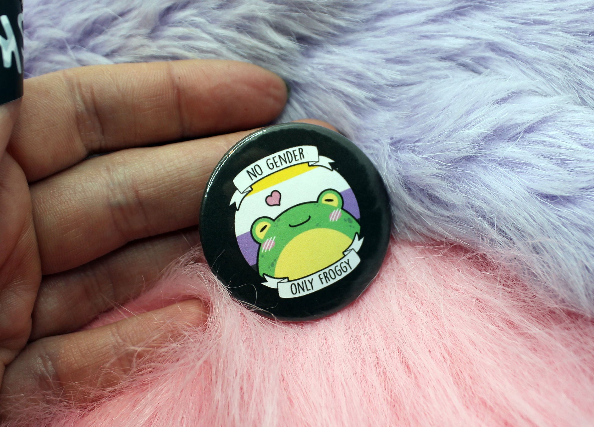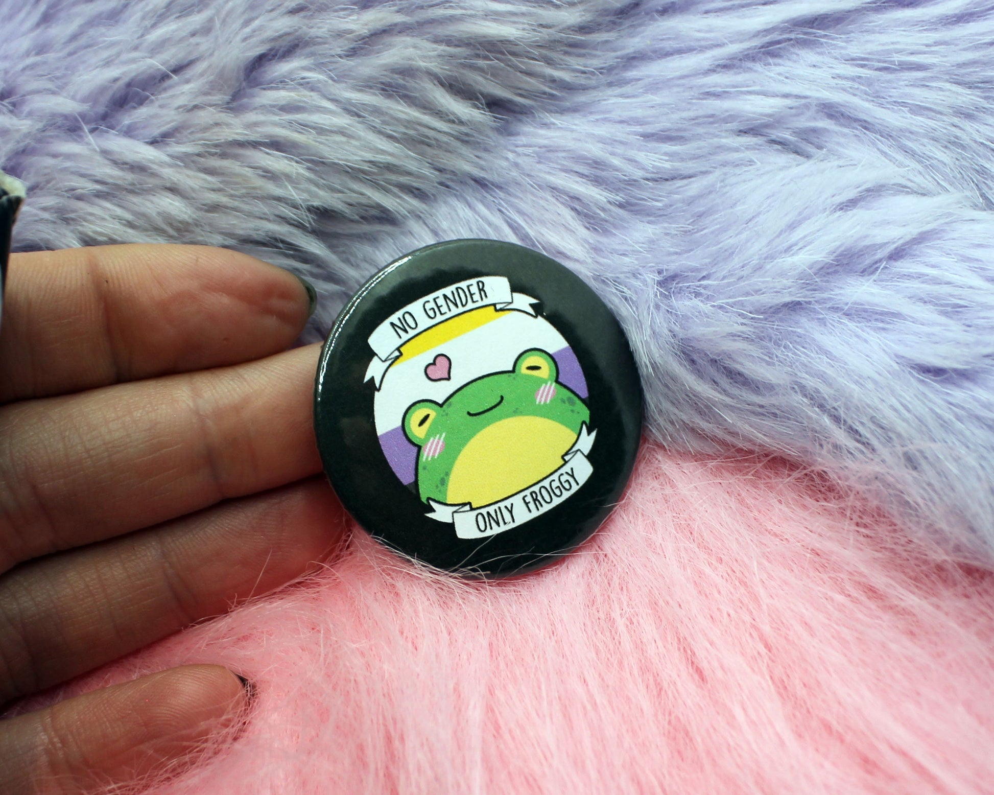 For my fellow froggy loving non-binary pals, I present to you this 32mm Non-Binary Frog badge! Show your enby pride and your love of frogs all in one go!