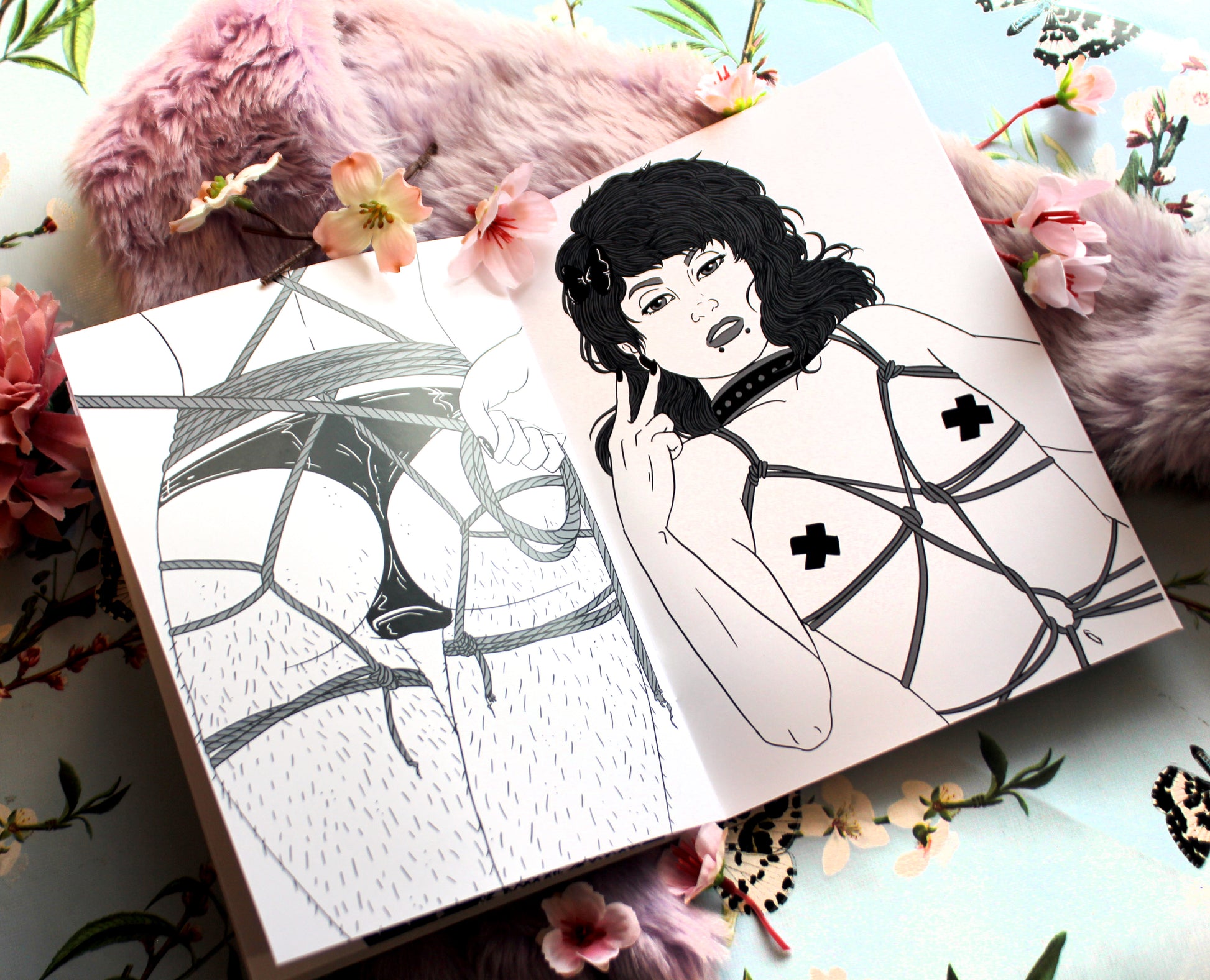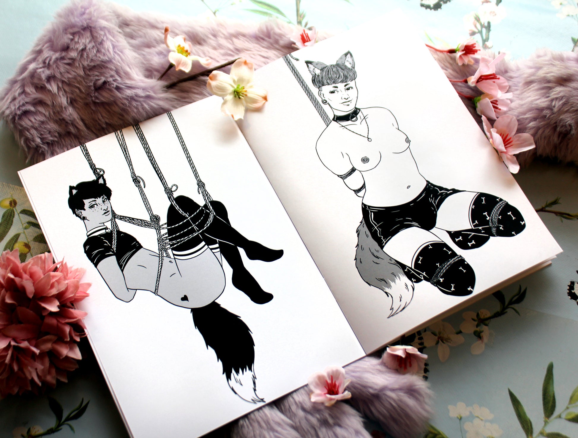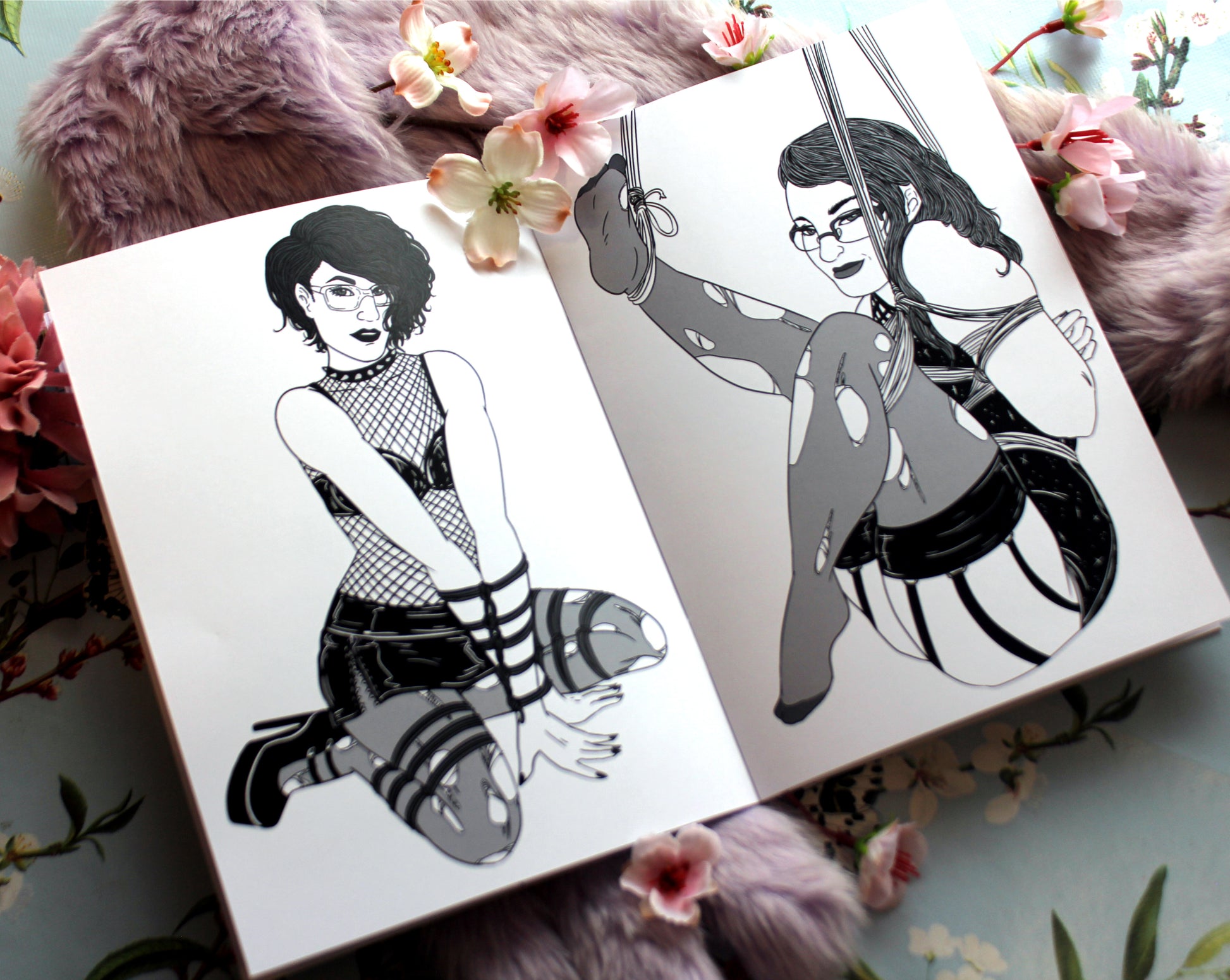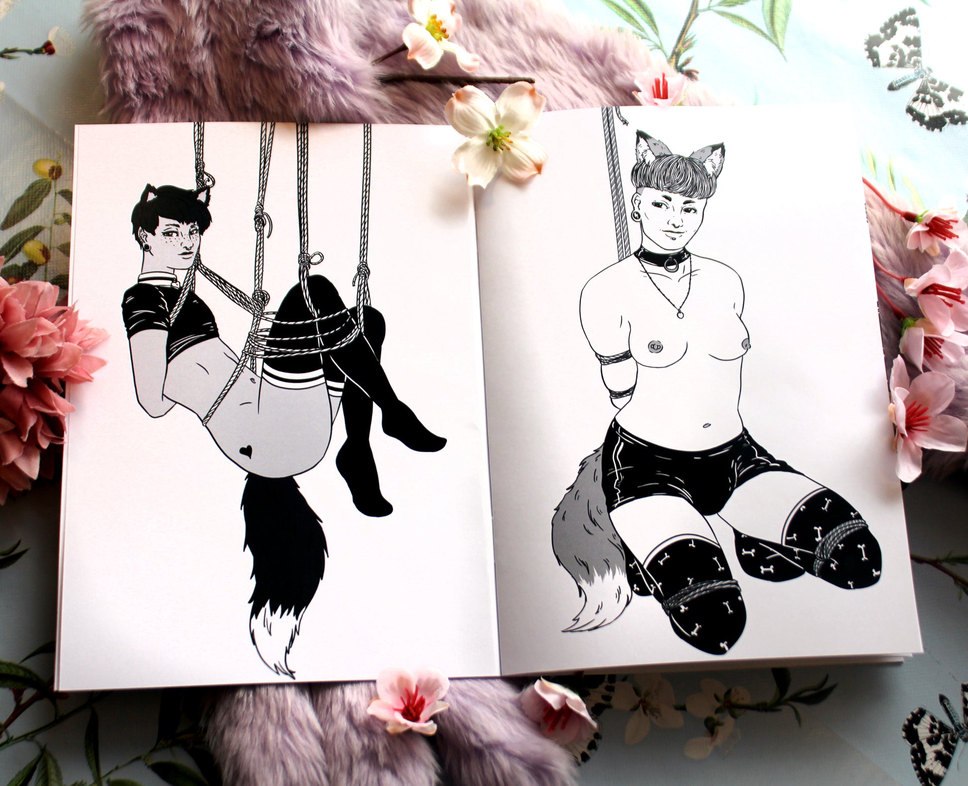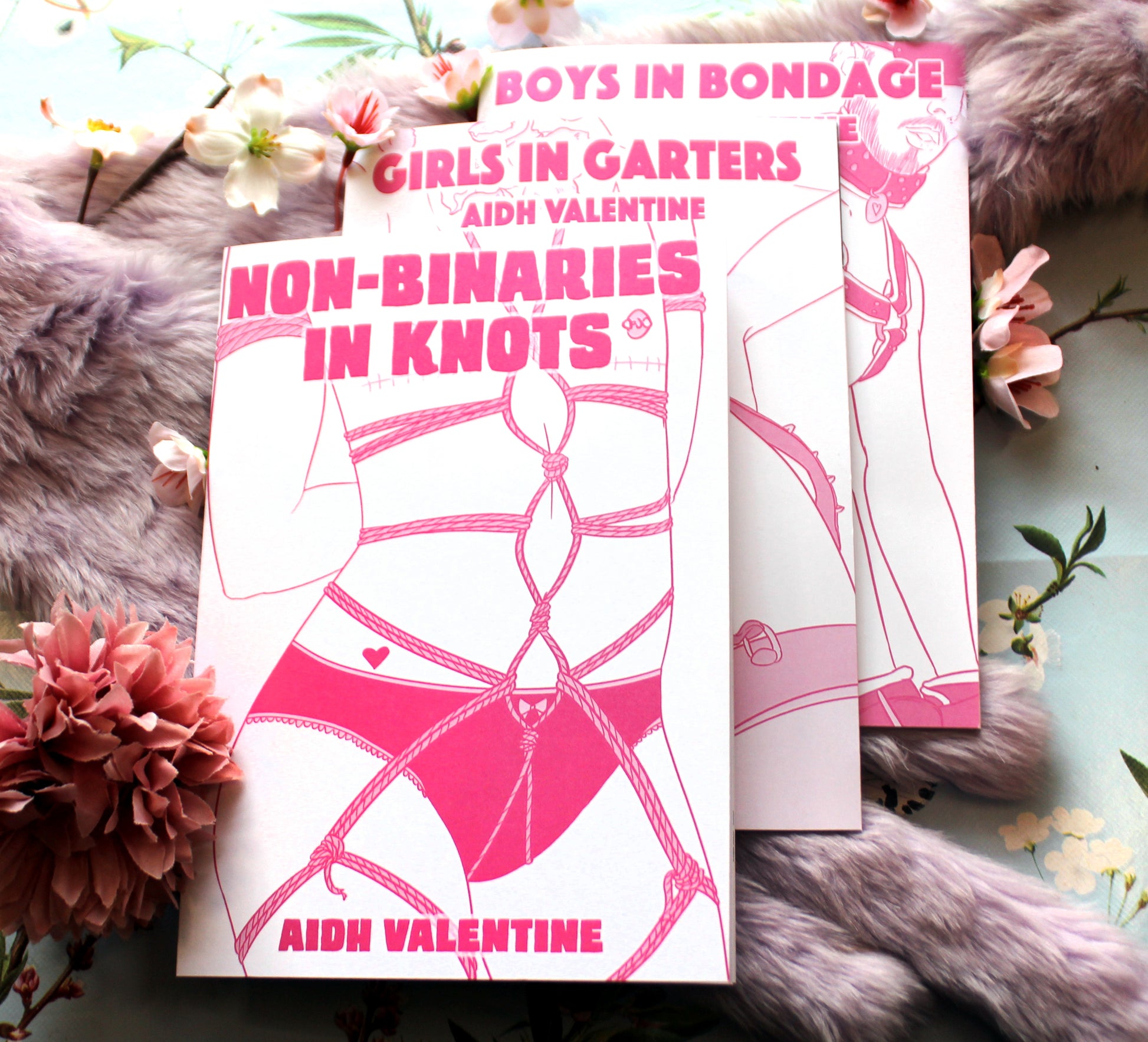 It is the 3rd part of a 3-part Bondage themed zine series (Girls in Garters, and Boys in Bondage, being the first 2 volumes). Non-binaries in knots came into existence as people wanted to get involved in the first two projects but felt uncomfortable with only two gender labels. Most of models depicted are personal friends from within the EnBy community.