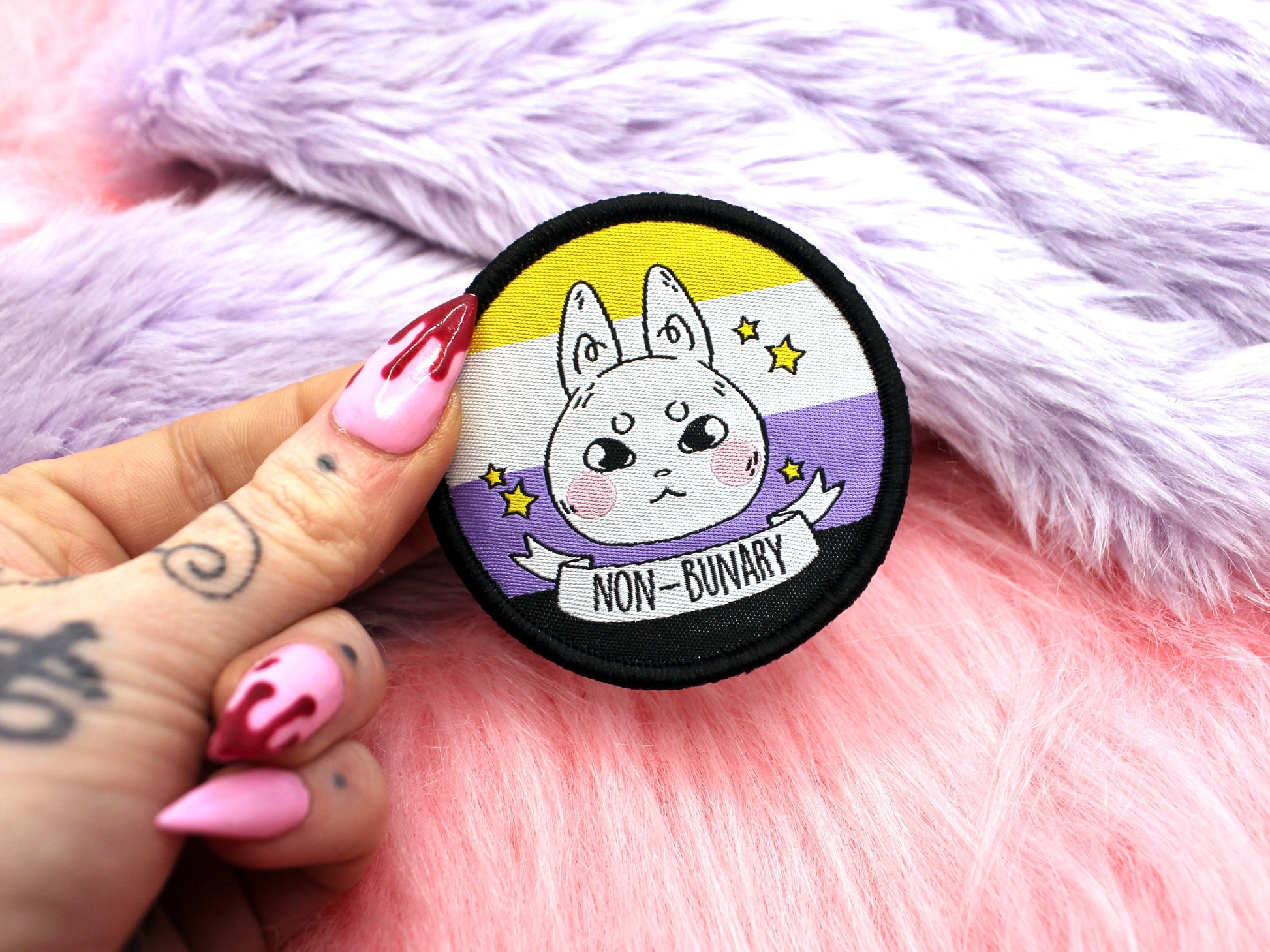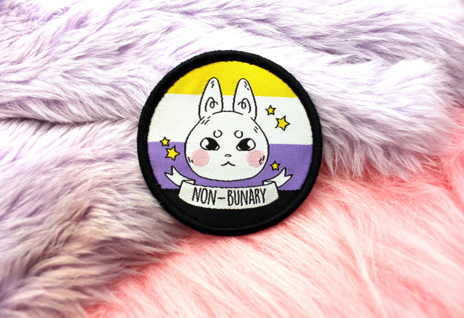 Non-Bunary Iron-On Patch (60mm) - non-binary bunny rabbit embroidered patch