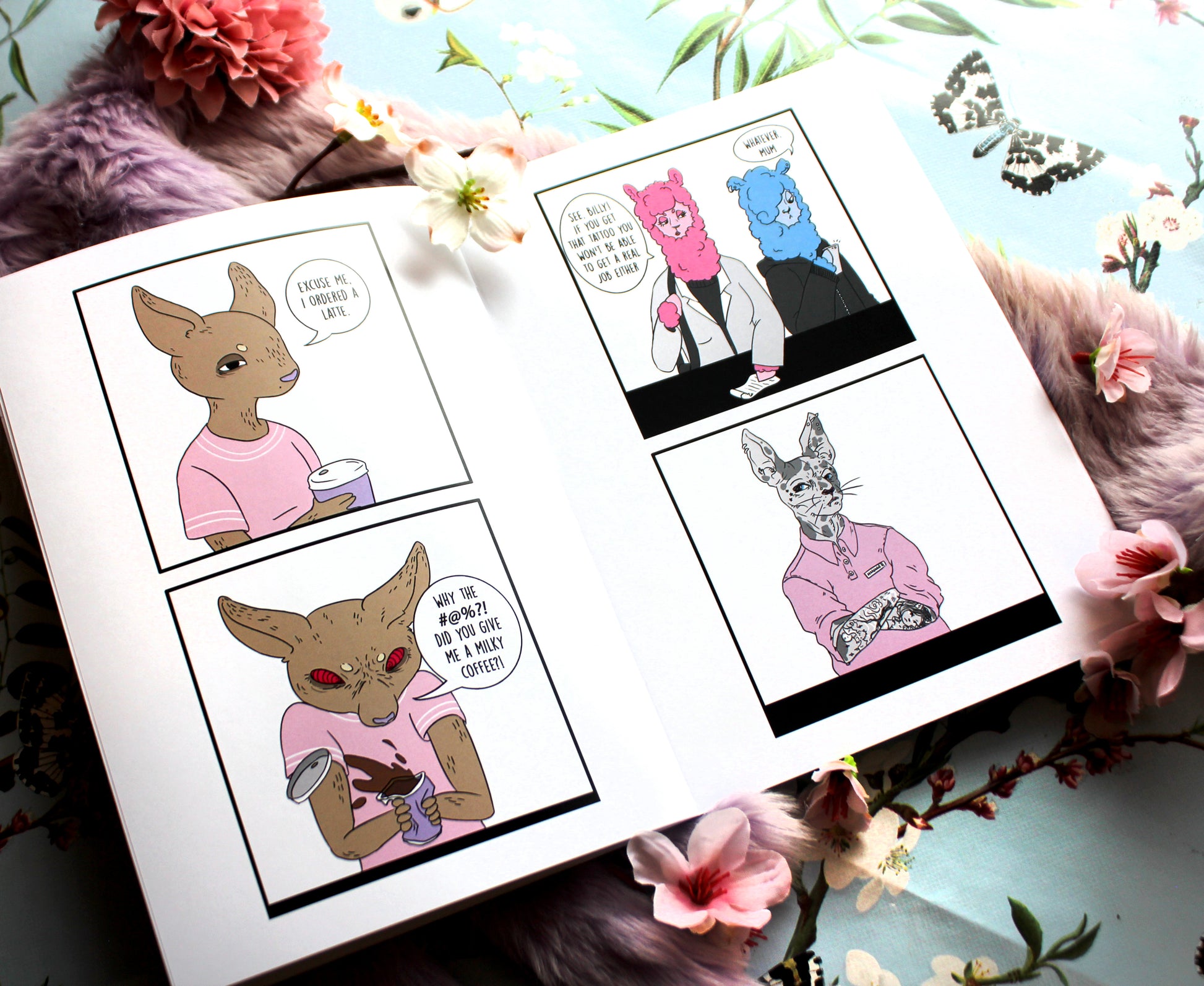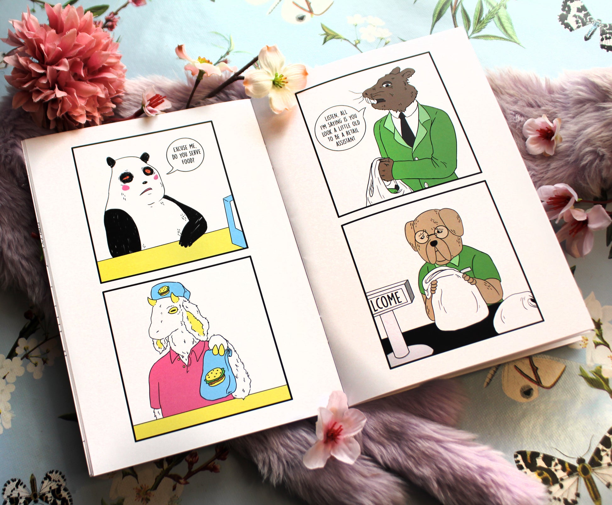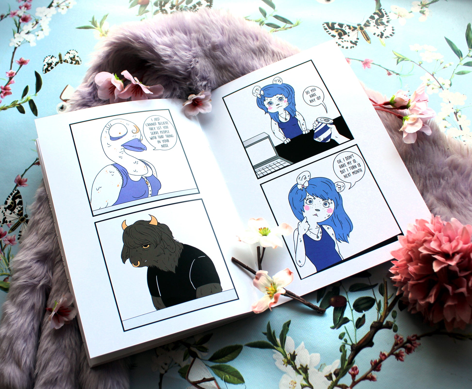 This zine is A5 sized when closed, printed on ethically sourced paper with saddle stitch binding, and 32 pages long.