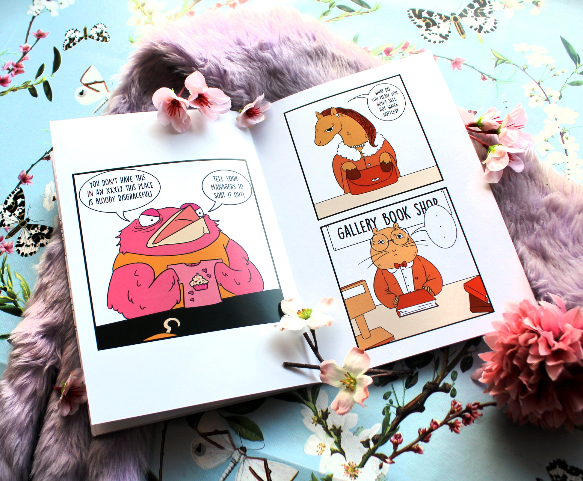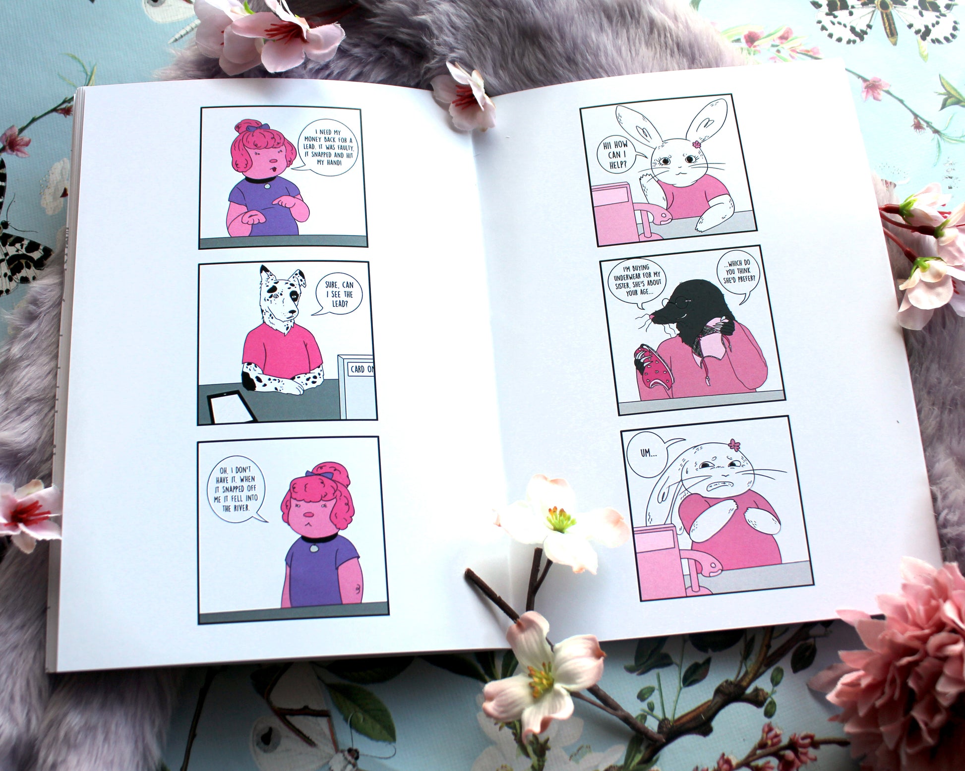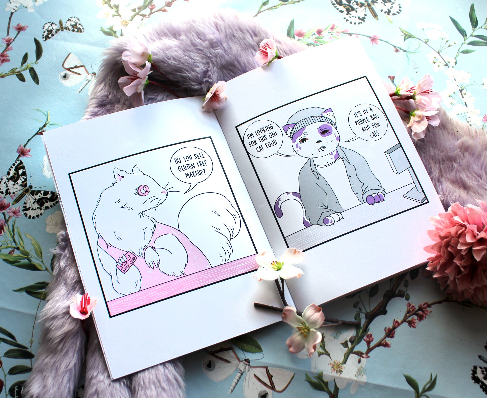 This zine is A5 sized when closed, printed on ethically sourced paper with saddle stitch binding, and 32 pages long.