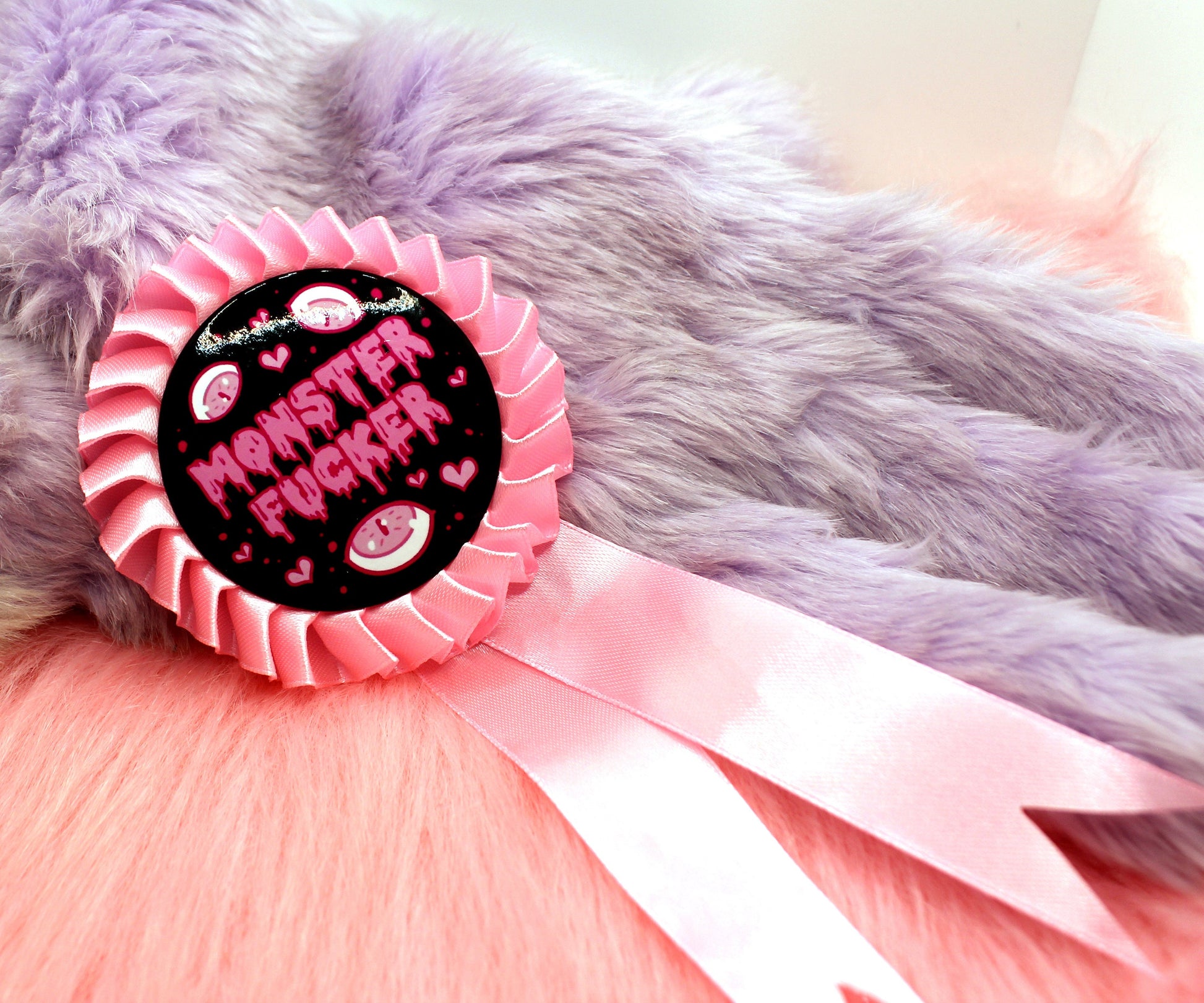 This rosette has a safety-pin style back, and the badge had a laminated bright glossy clear finish.