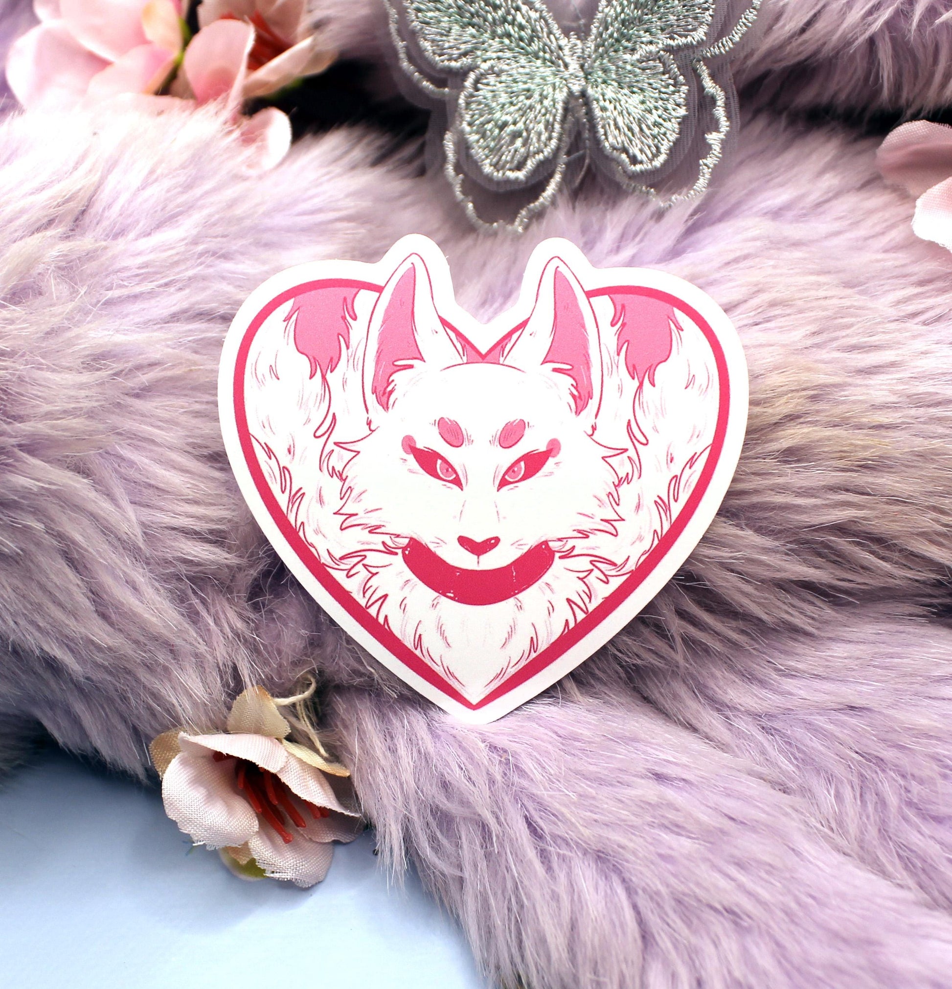 This pink and white fox spirit sticker is 6cm in size, made with waterproof vinyl and has a self adhesive peel-able back.