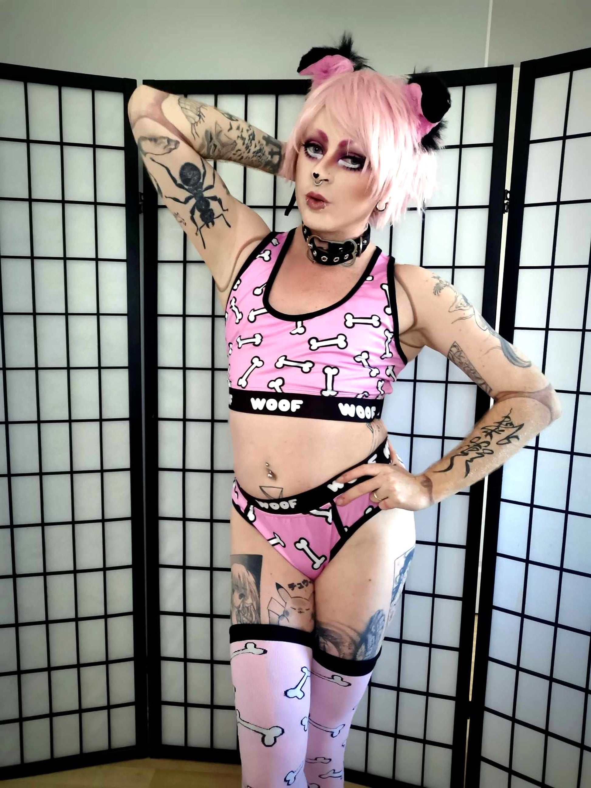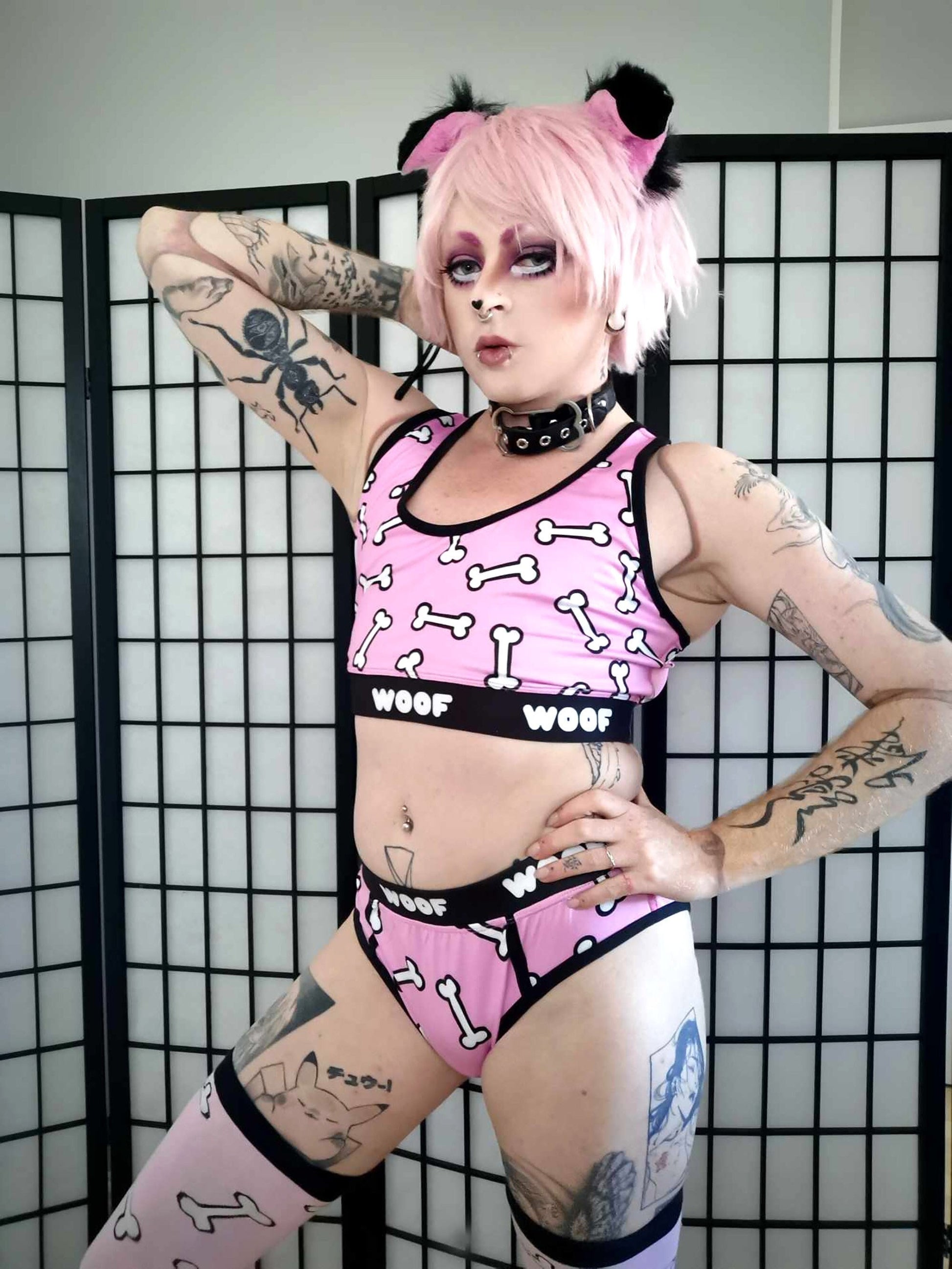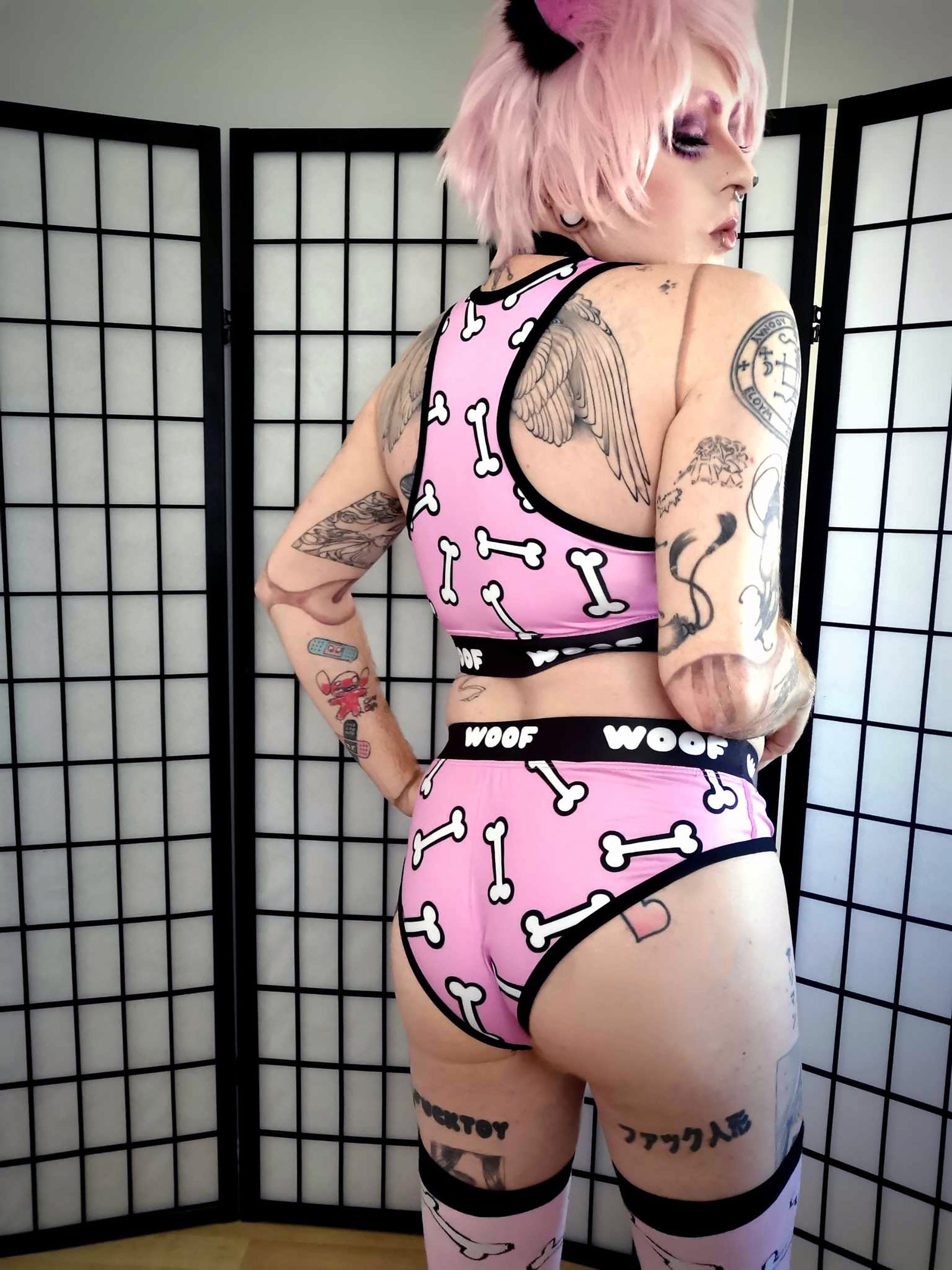 These pet play inspired Pink Woof Woof Puppy Dog Bones Lingerie Sets are made from 87% breathable polyester and 13% spandex, making them perfect for sporting events or raves!