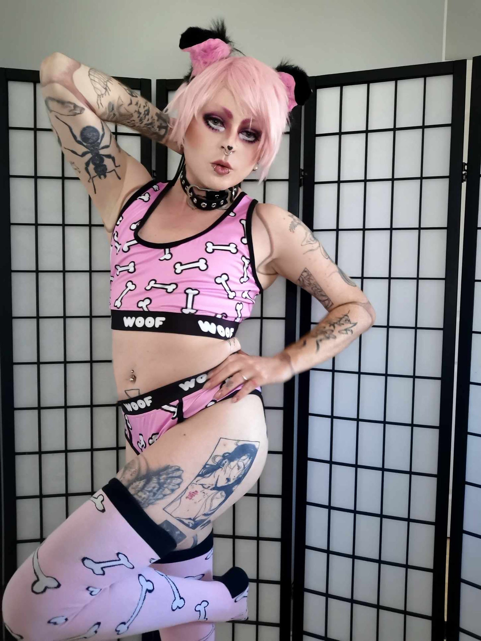 These pet play inspired Pink Puppy Dog Bones Lingerie Sets are made from 87% breathable polyester and 13% spandex, making them perfect for sporting events or raves!