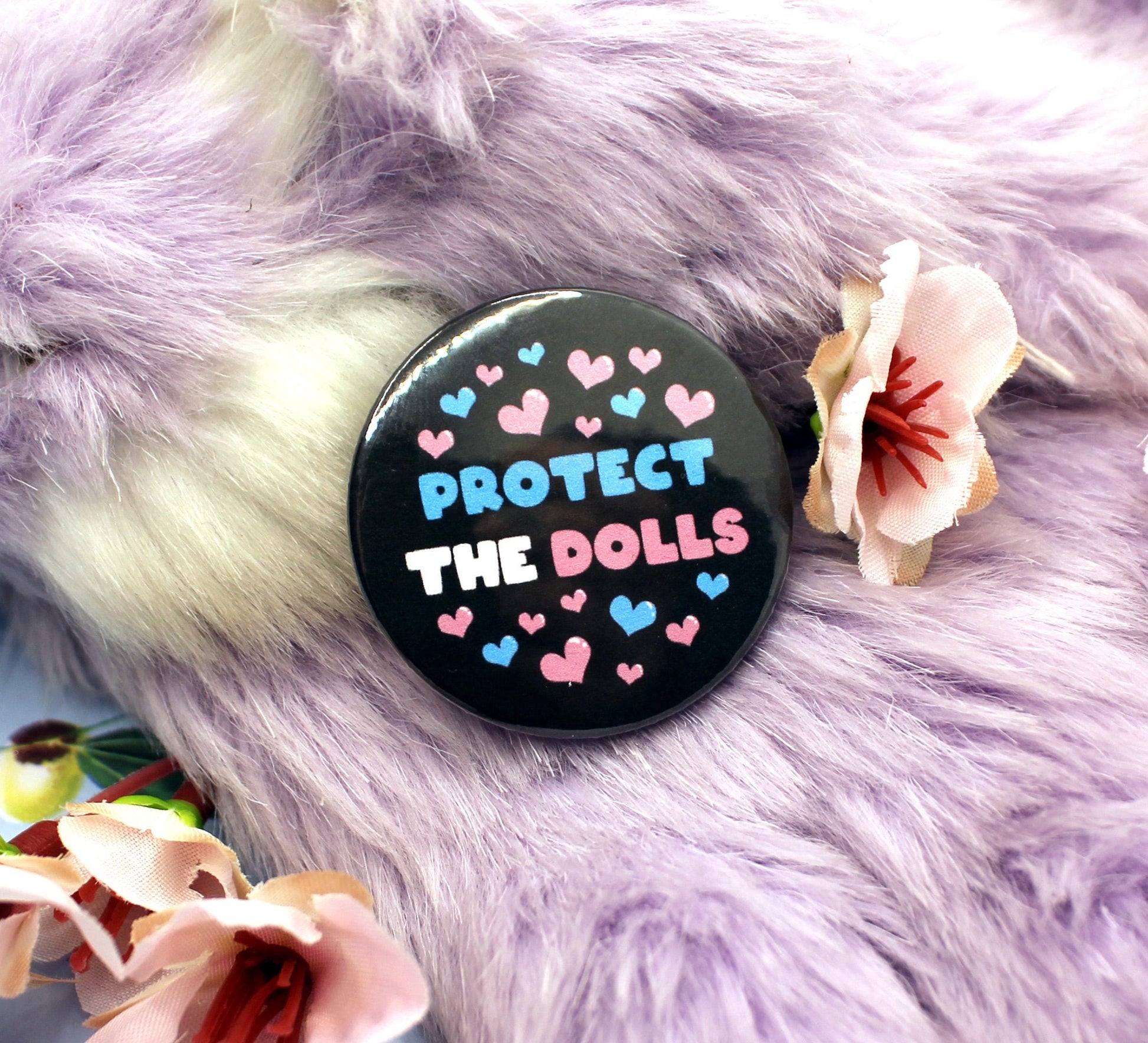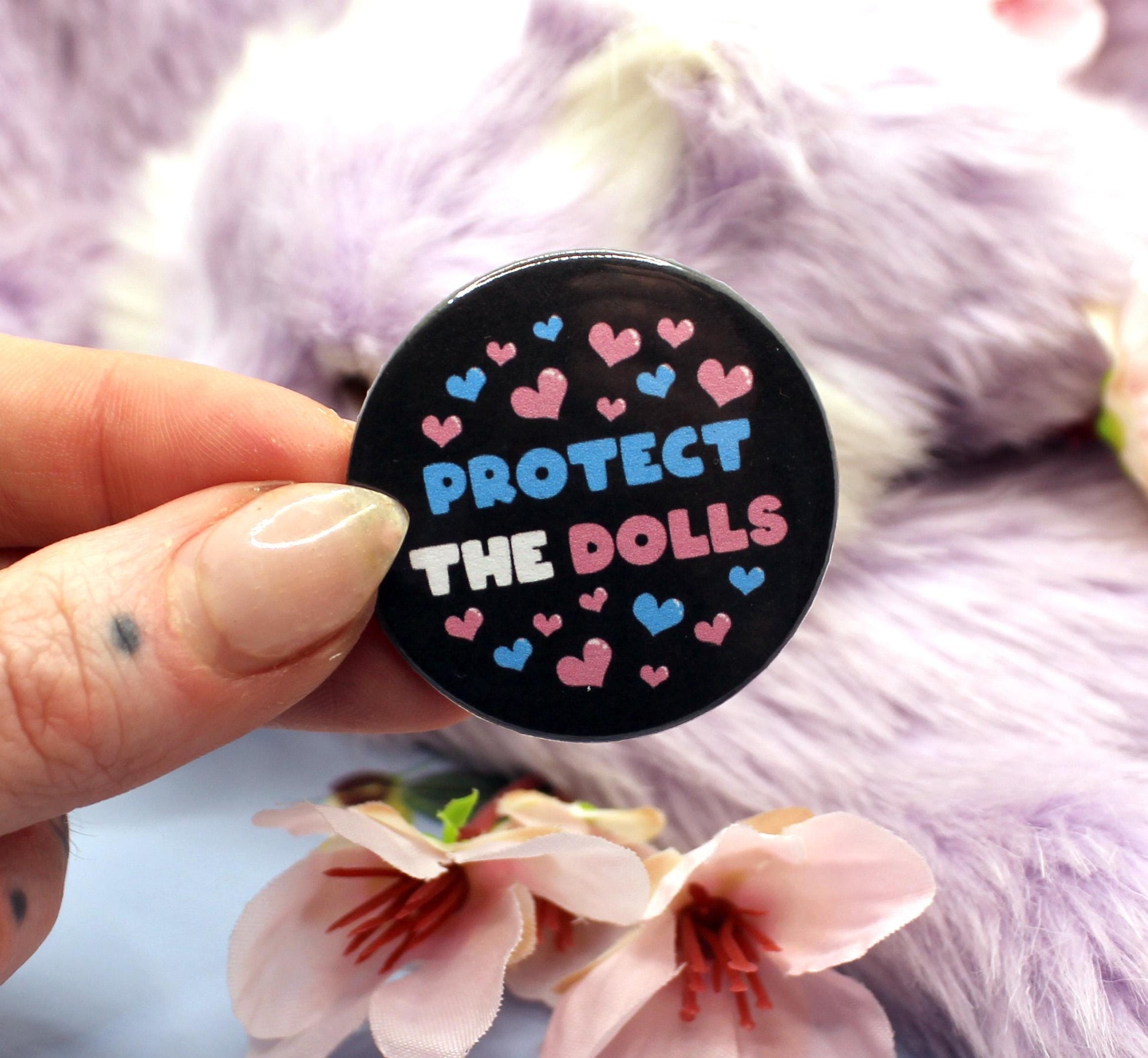 The artwork depicted on the badge is text that reads 'Protect The Dolls' in a blue, white and pink bubble font, the colours of the transgender pride flag. The text is surrounded by hearts, also in trans pride colours. The phrase 'Protect the Dolls' means protect trans women, as transgender rights are currently being threatened internationally at the minute by right-wing agendas.