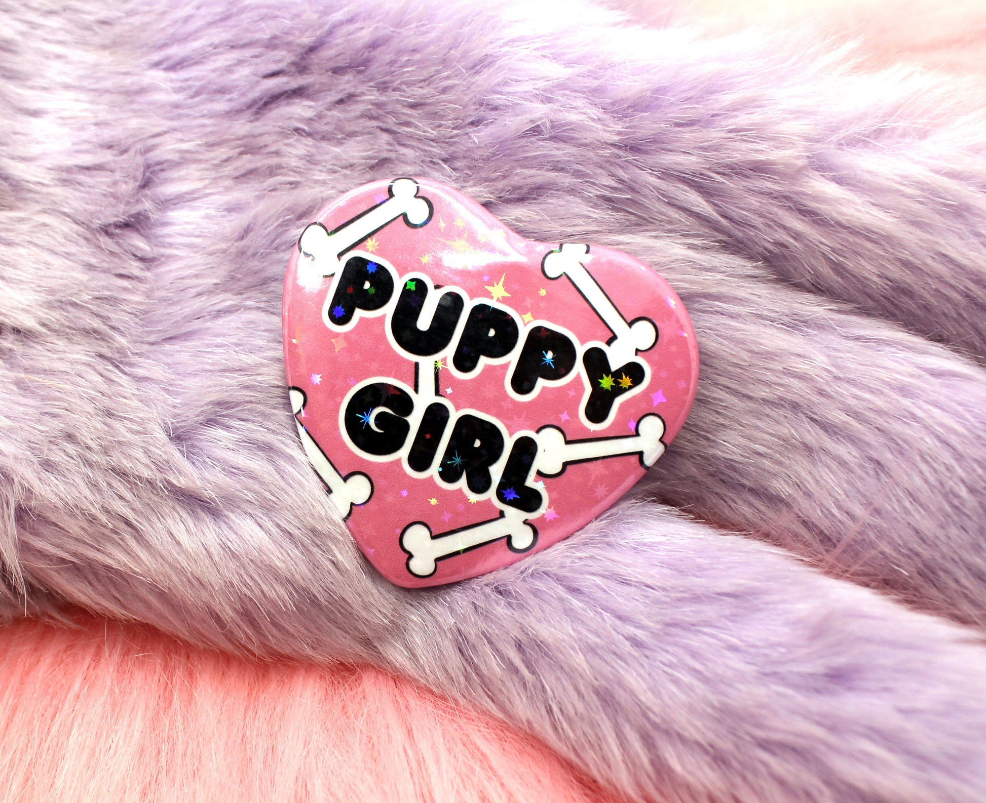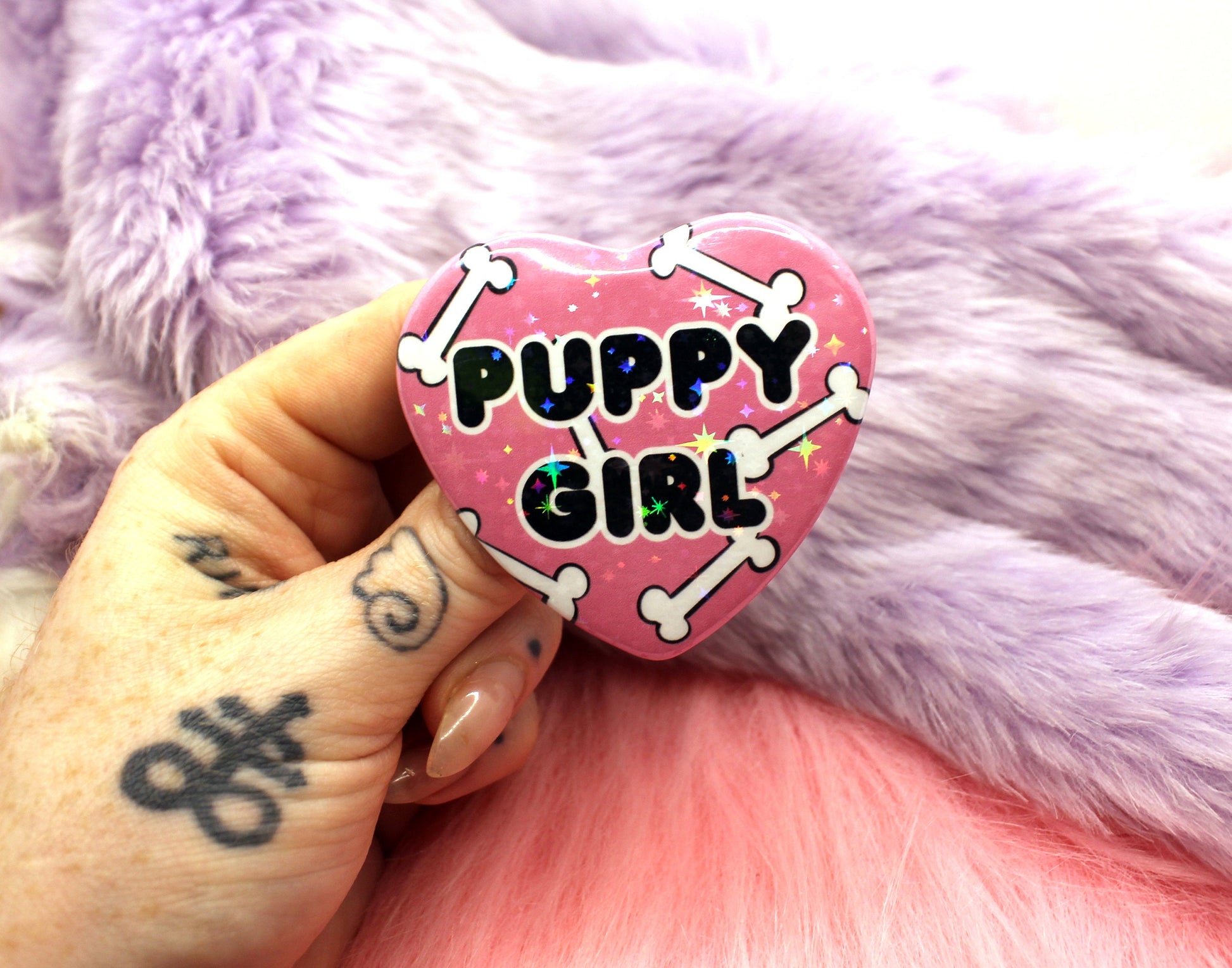 This Puppy Girl badge is heart shaped with a sparkly finish.