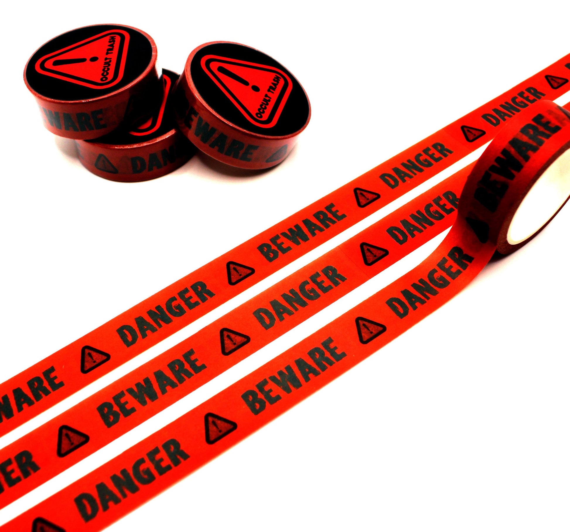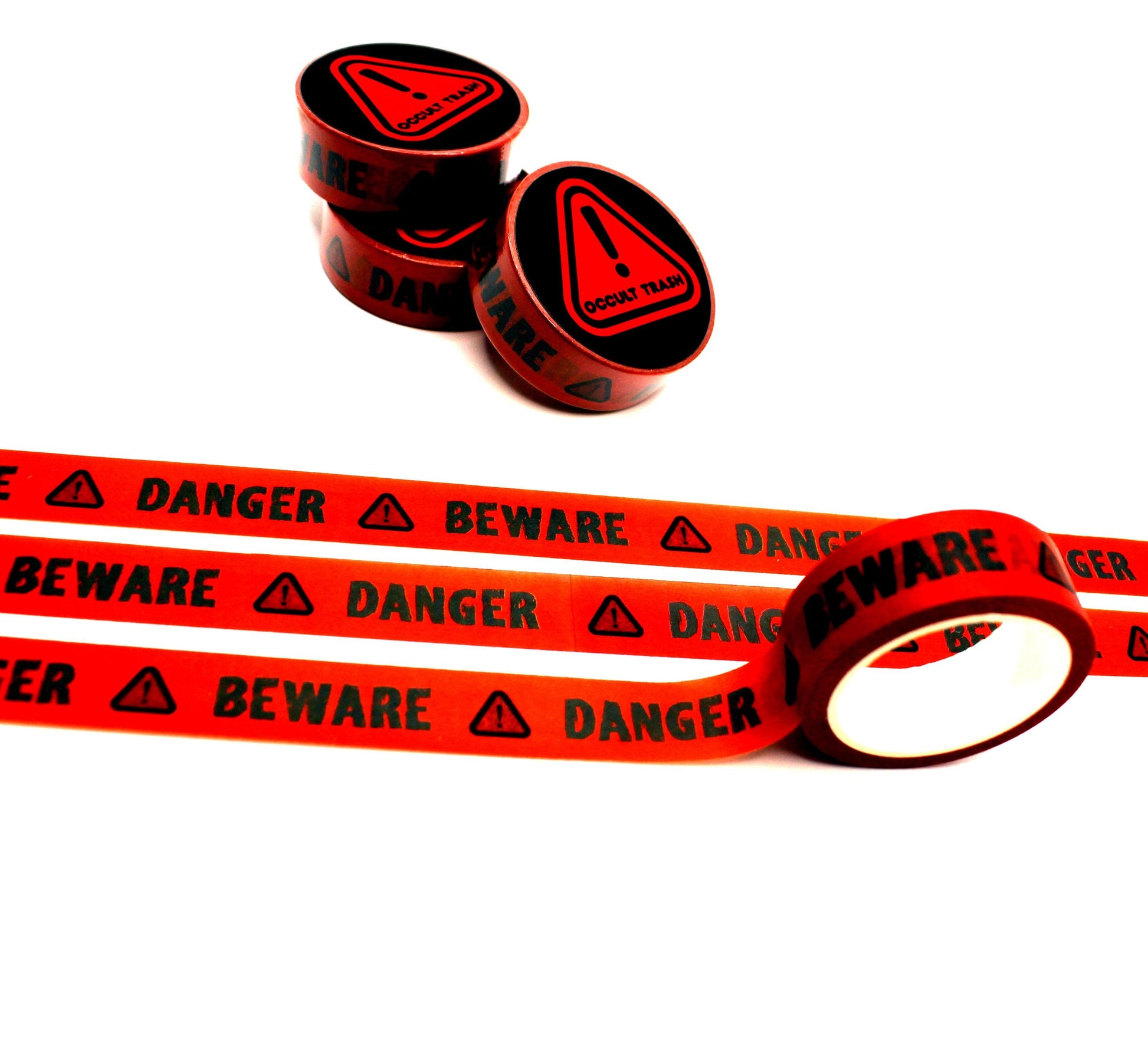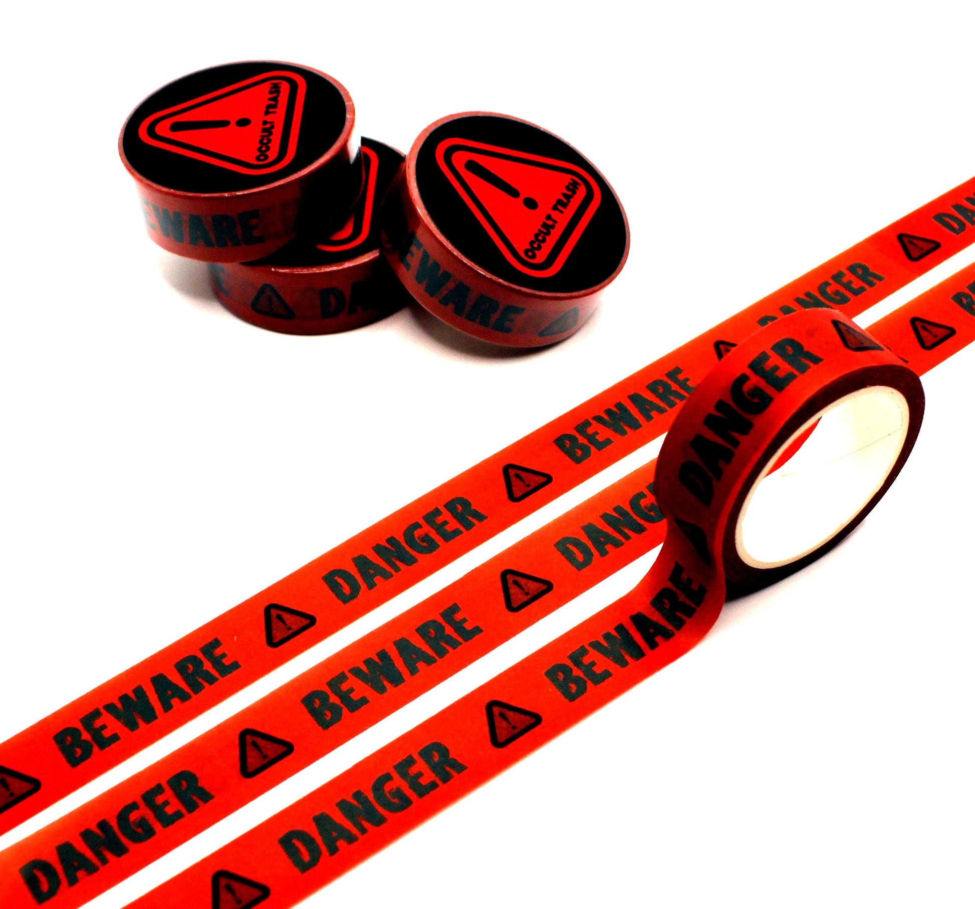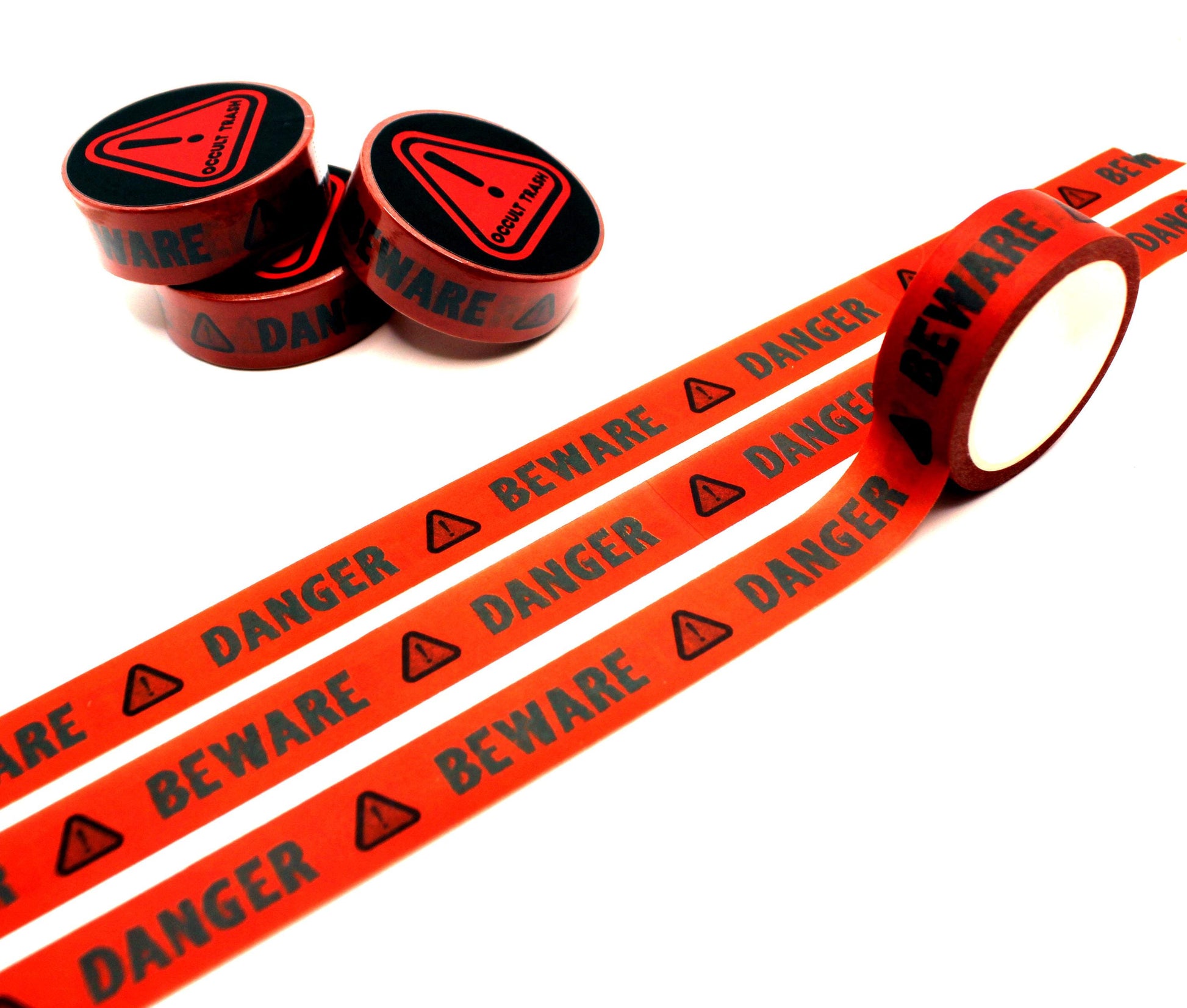 These washi tape rolls are perfect for gift wrapping and crafting. The tape is red with danger exclamation mark motifs and text that reads 'Danger Beware' across it.