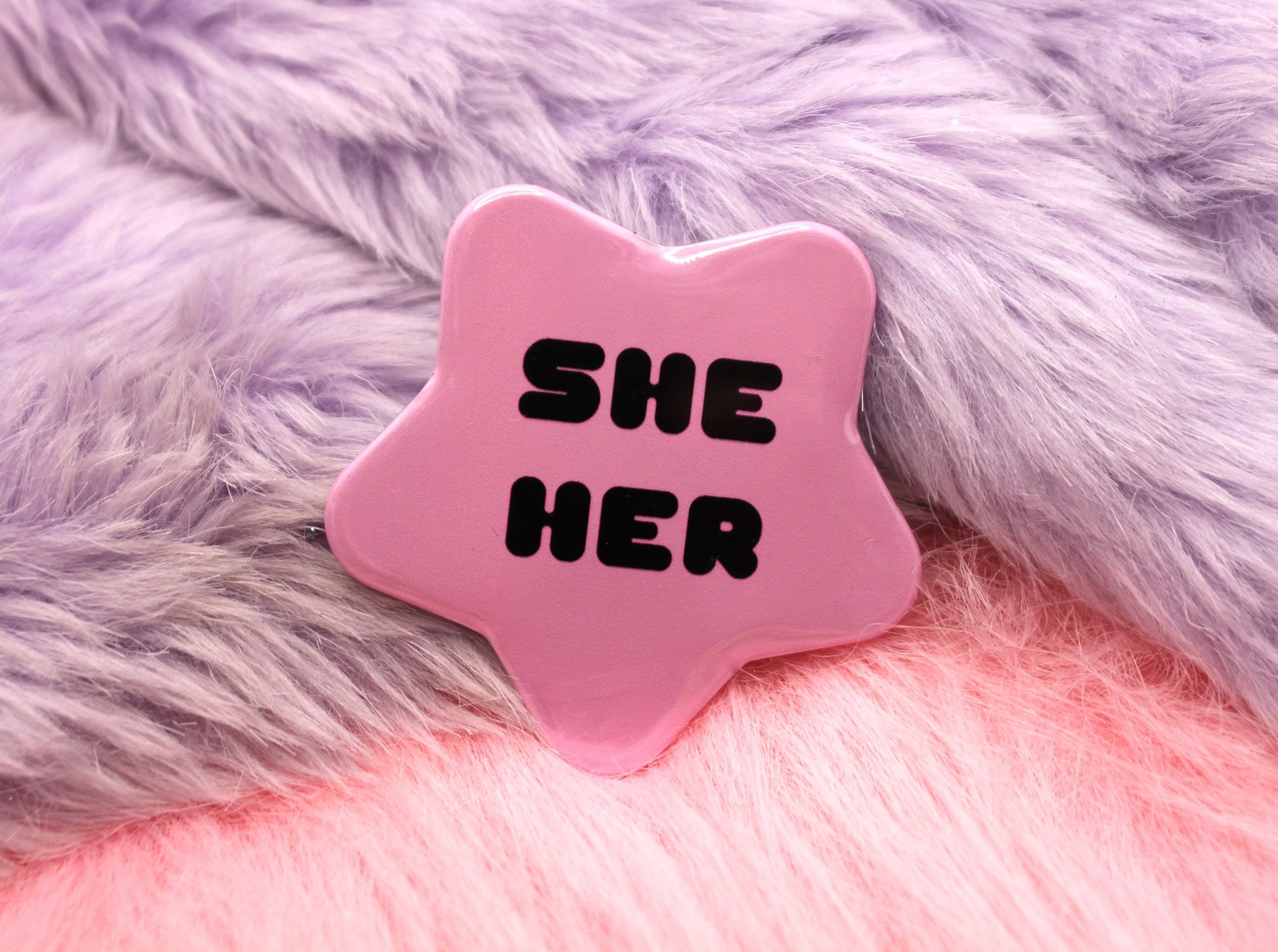She/Her Pronoun Pentagram Star Badges (55mm) - Pink and Black