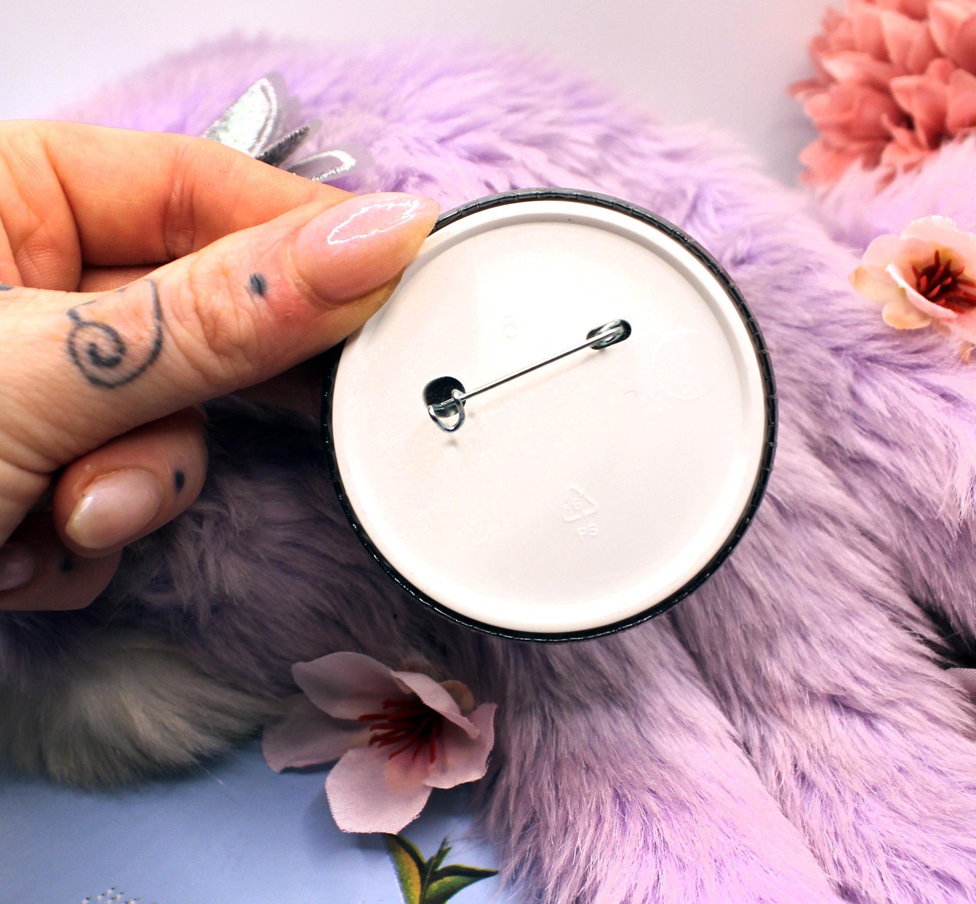 It is 58mm in size with a push-pin back.