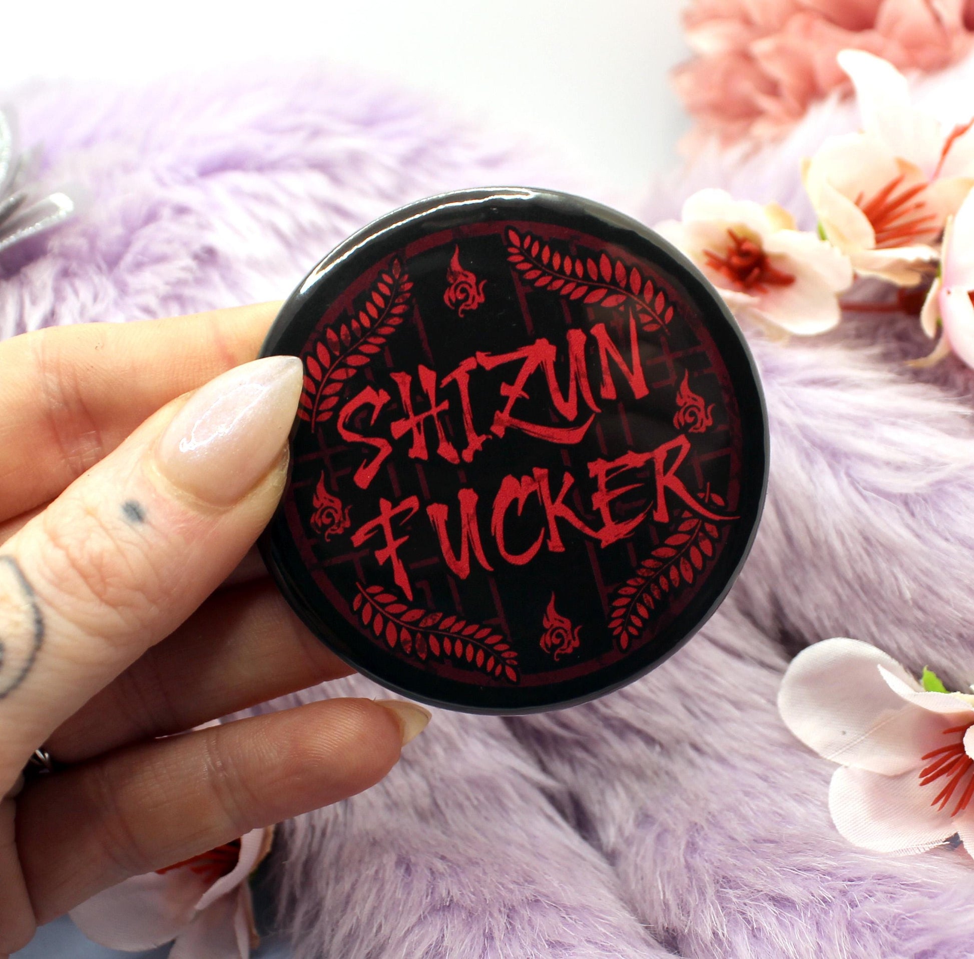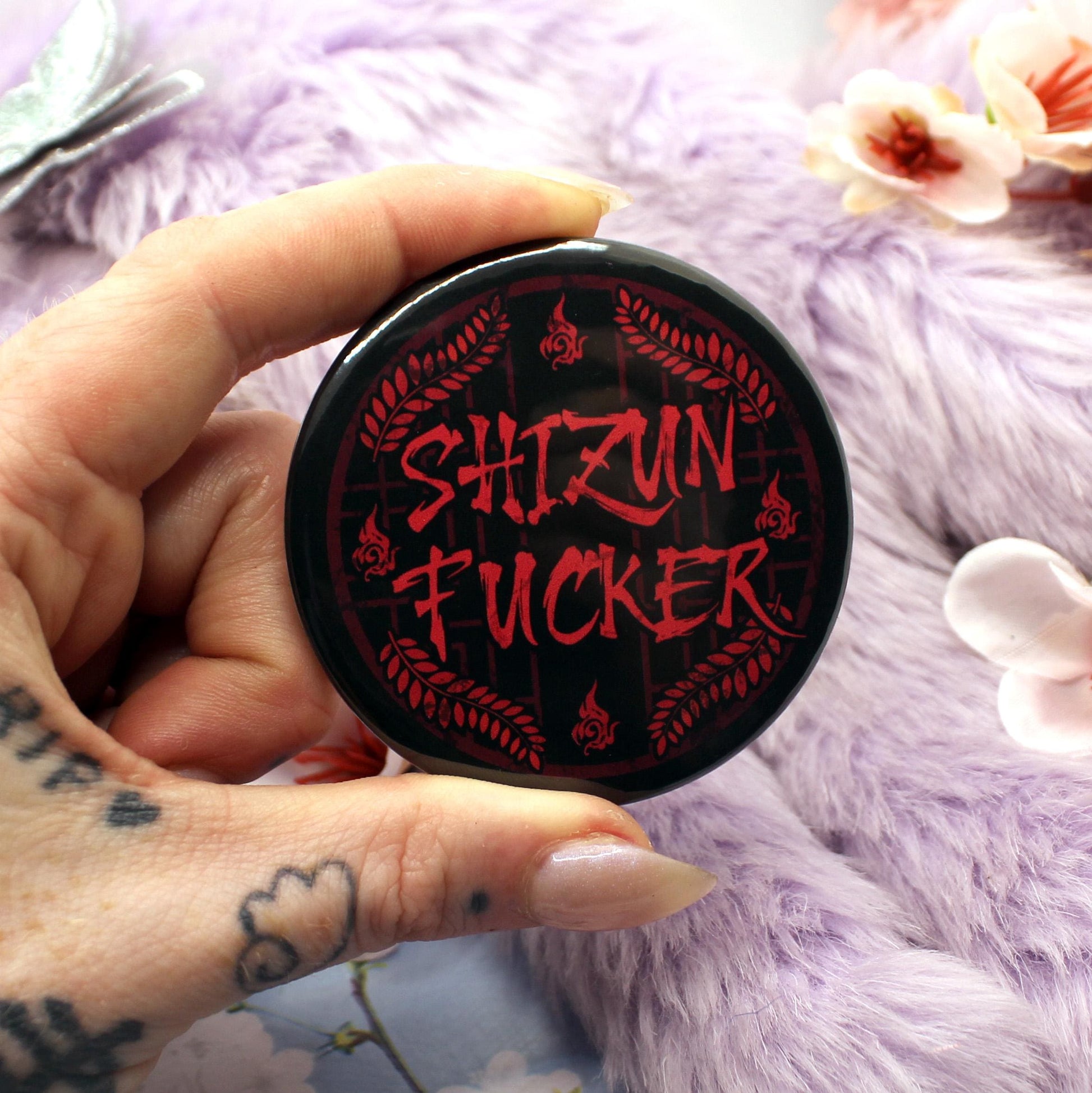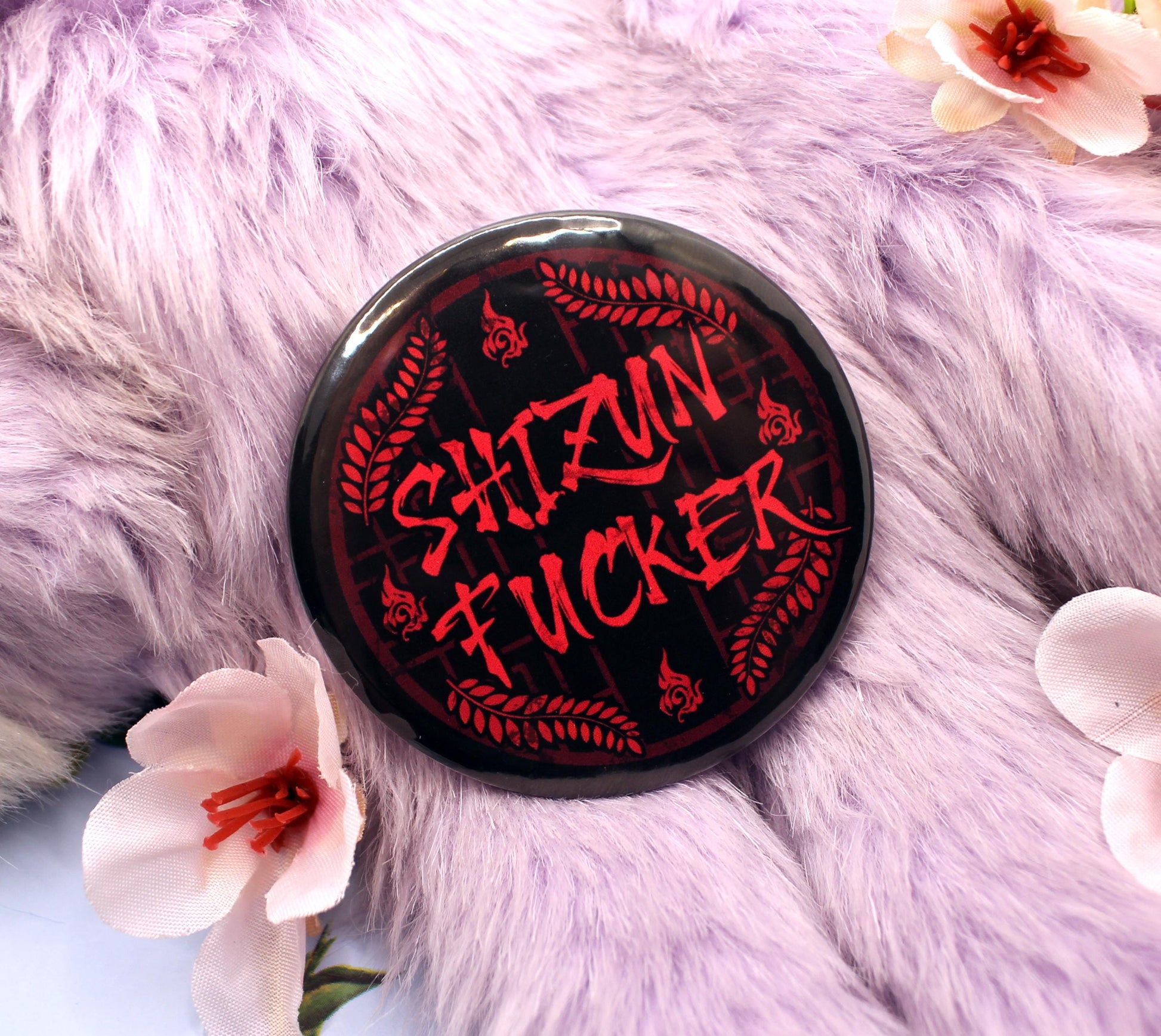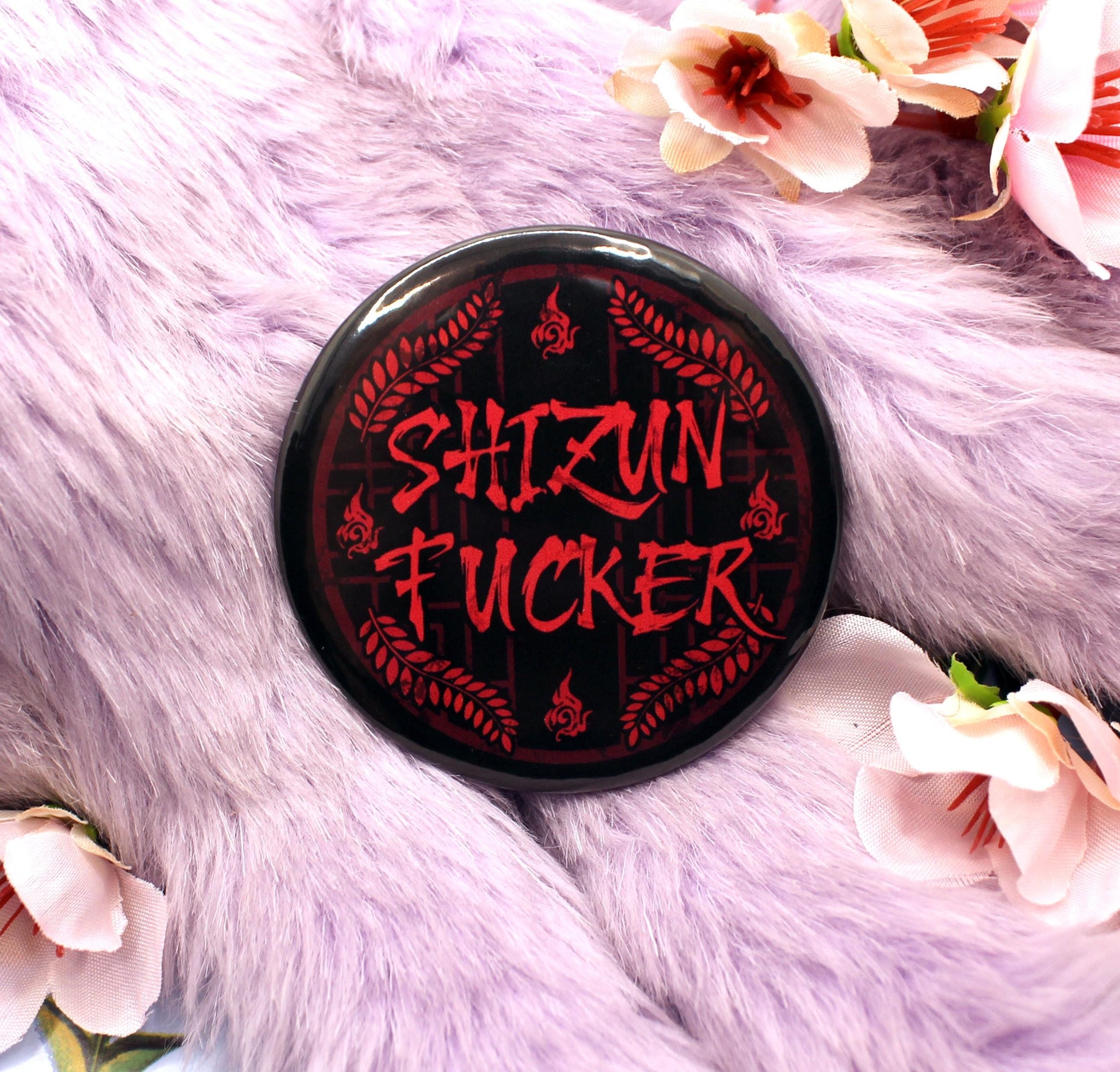 The illustration on the badge shows a red lattice window on a black background, with the word 'Shizun Fucker' across it. In the backgroun is Luo Binghe's forehead sigil, and Mo Ran's weapon, Jiangui's leaf motif.