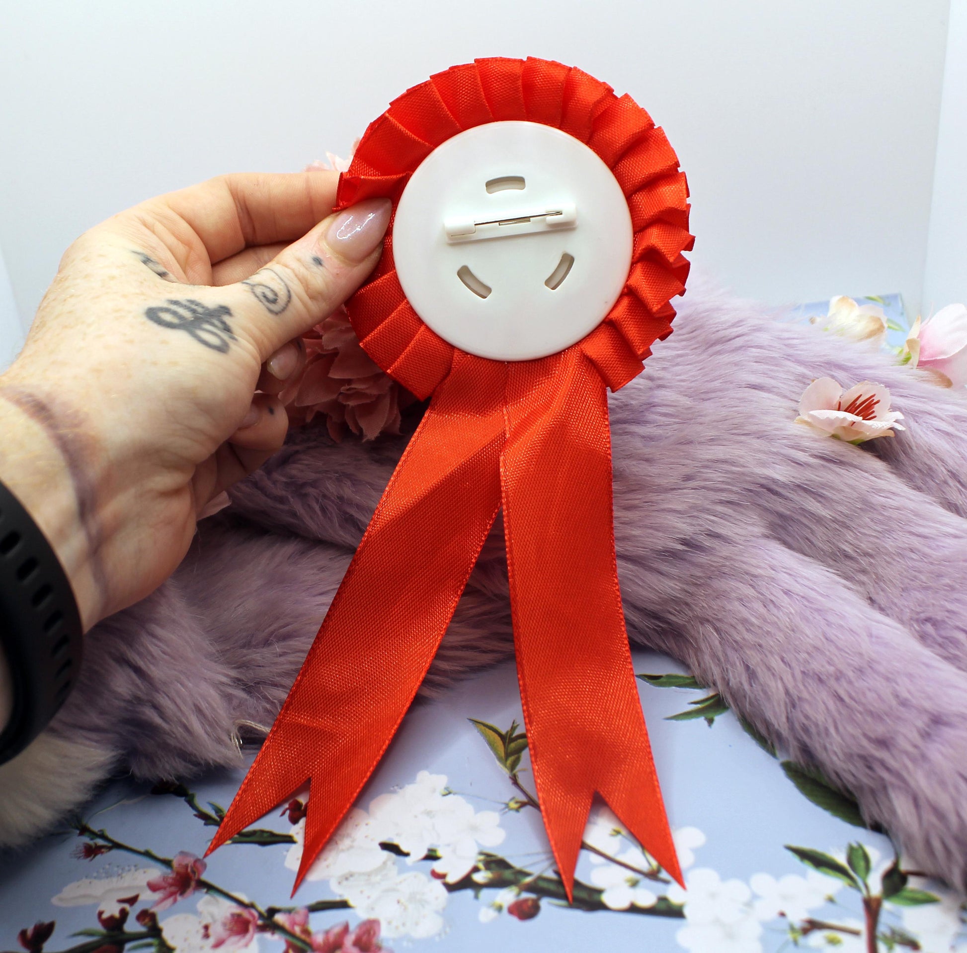 This rosette features a design inspired by Rou Bao Bu Chi Rou (also known as Meatbun or Meatbun Doesn't Eat Meat) and MXTX's danmei literary works, The Husky and His White Cat Shizun (also known as Erha or 2ha) and The Scum Villain Saving System.