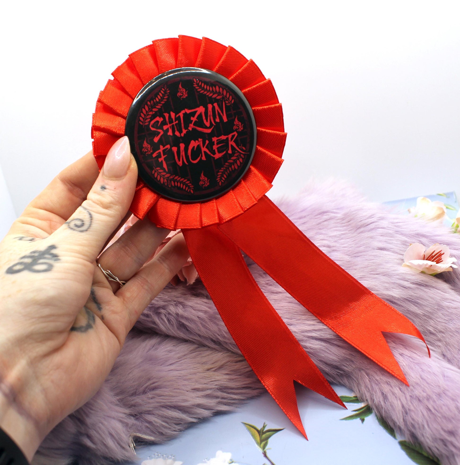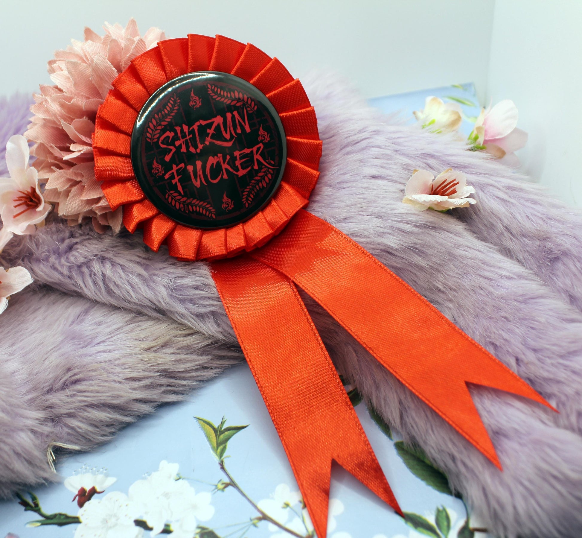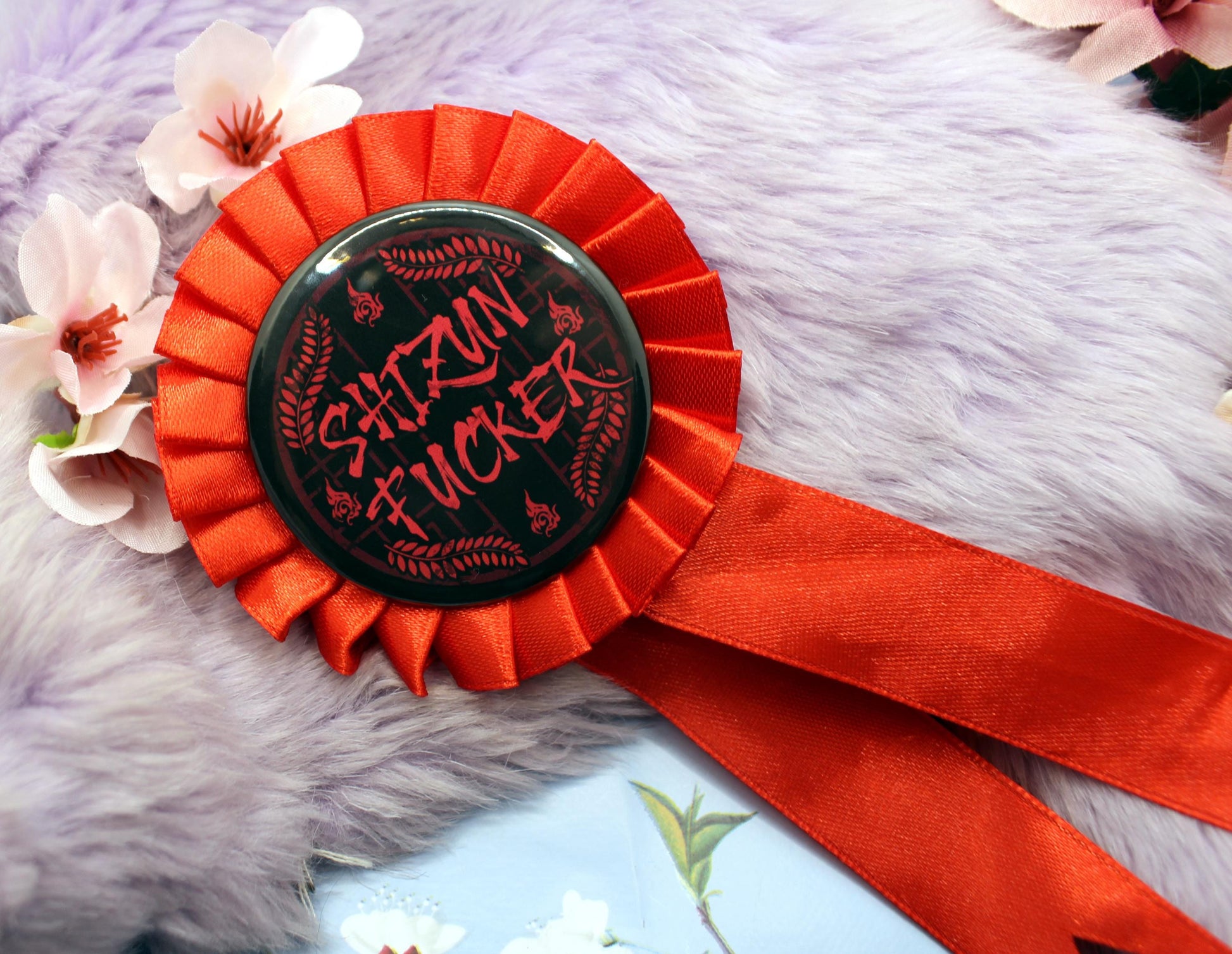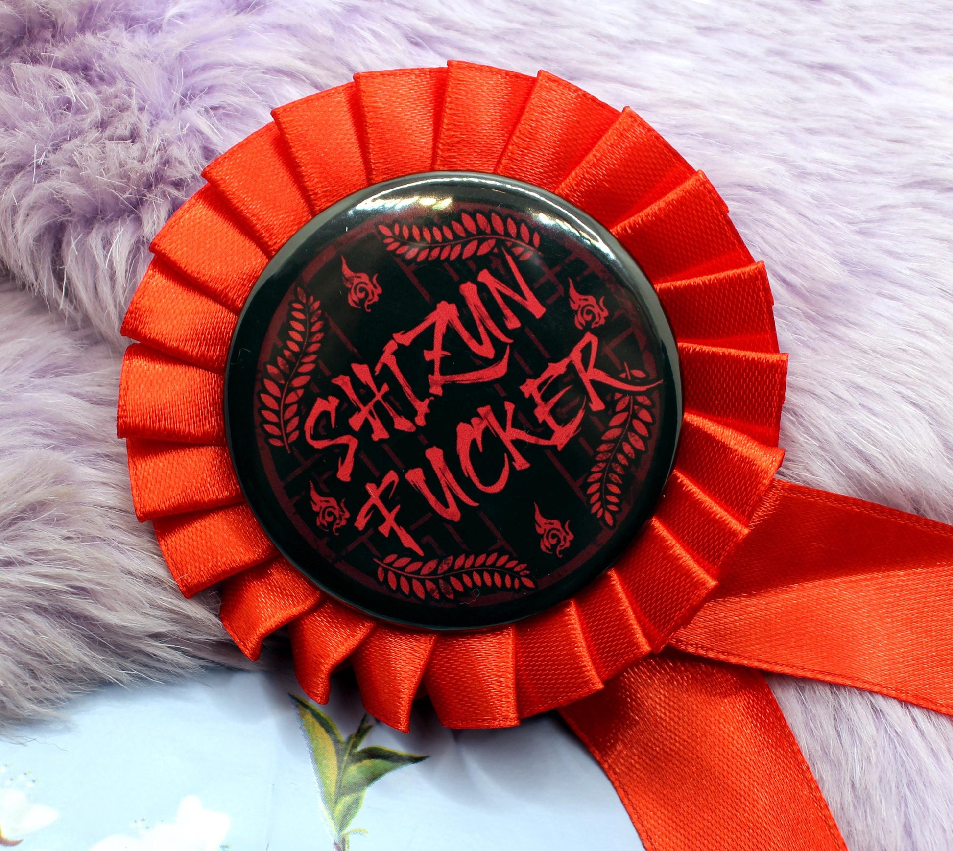 The illustration on the badge shows a red lattice window on a black background, with the word 'Shizun Fucker' across it. In the background is Luo Binghe's forehead sigil, and Mo Ran's weapon, Jiangui's leaf motif on a red ribbon rosette. The badge itself is 58mm in size with a push-pin back. The full rosette is 9cm x 20cm approx.