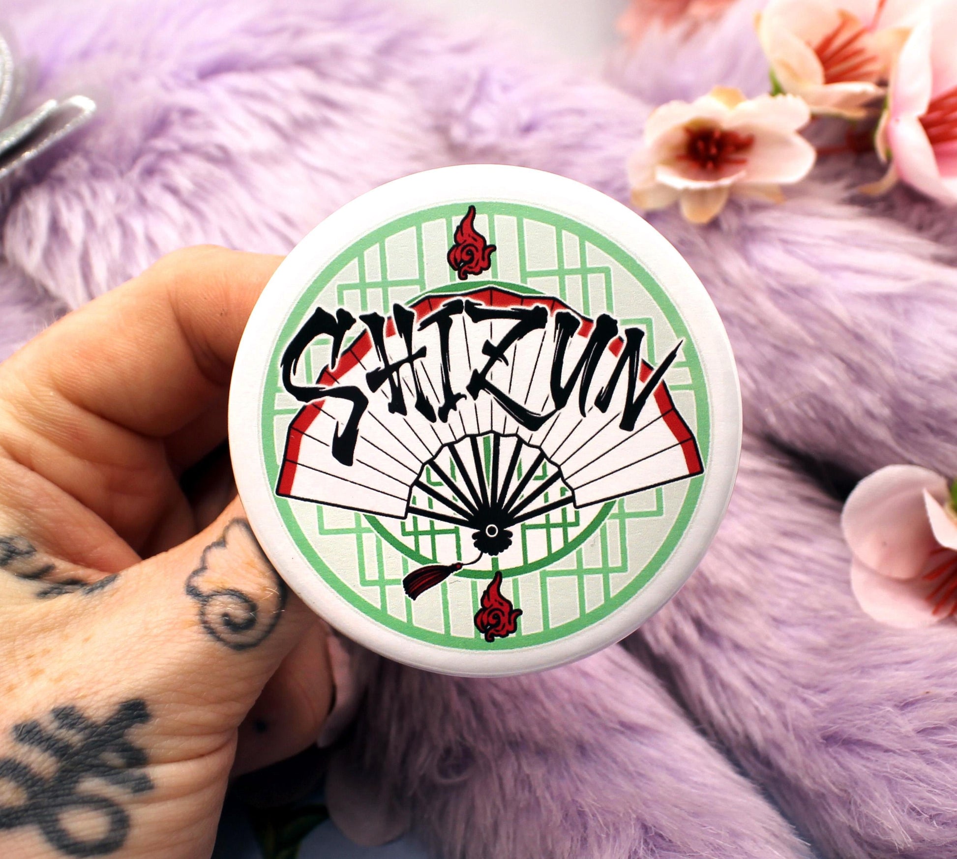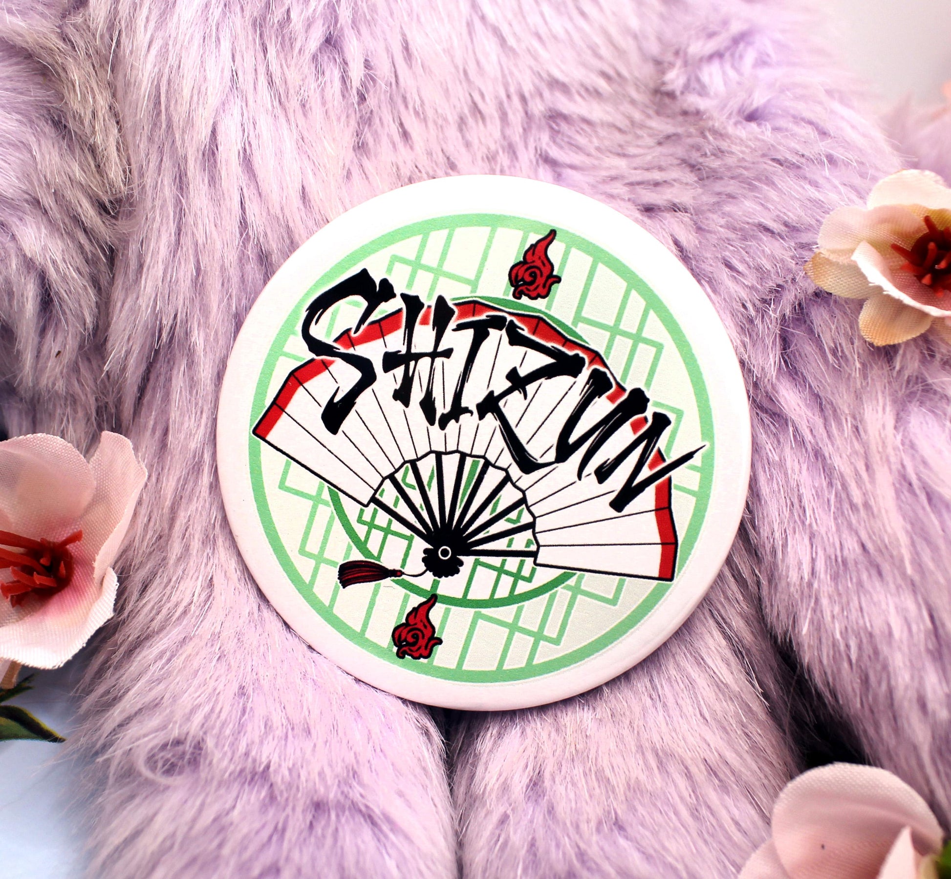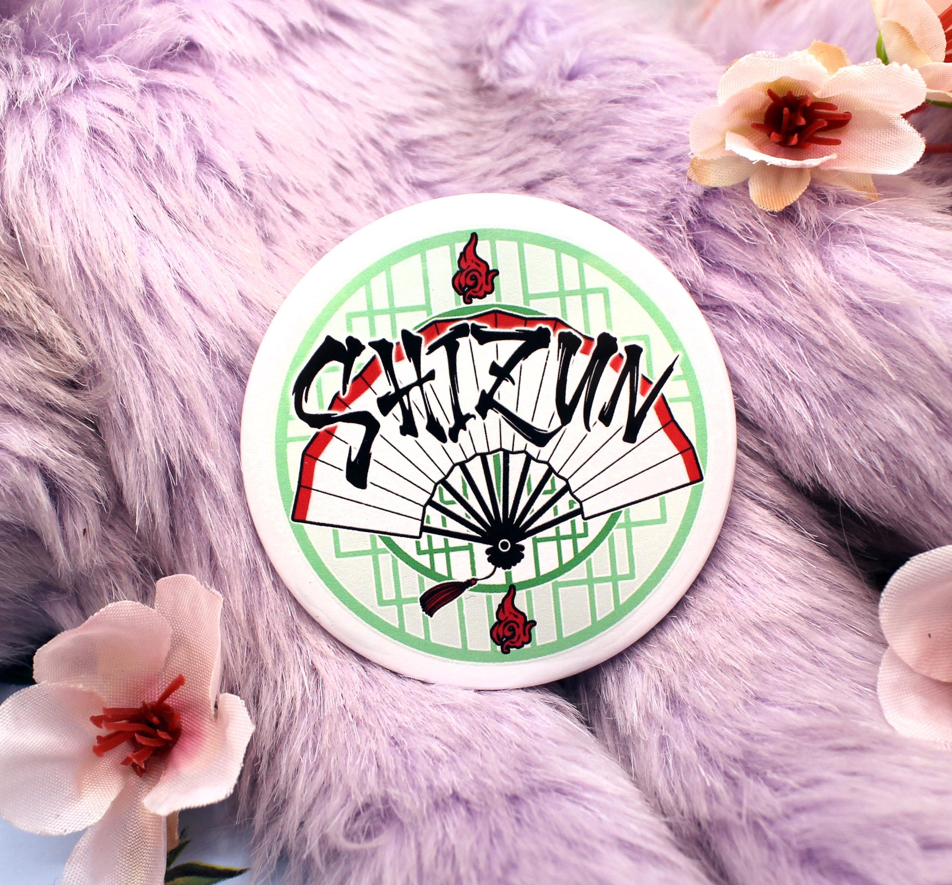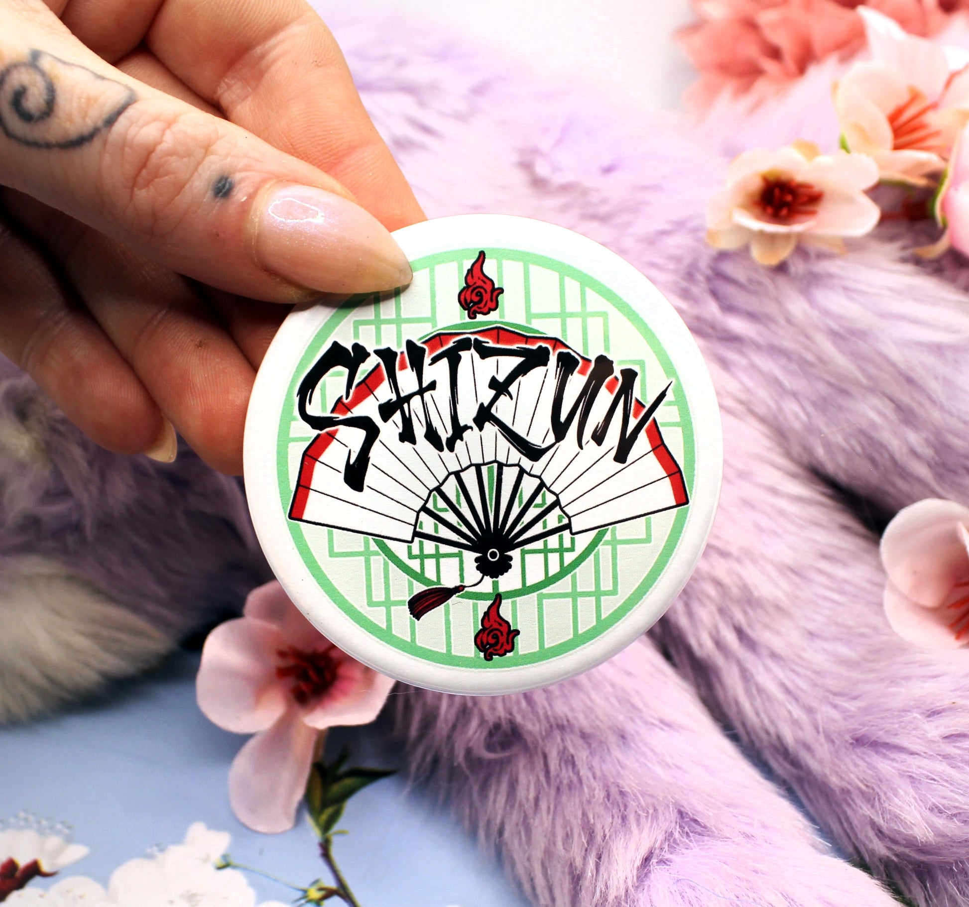 The illustration on the badge shows a green lattice window on a white background, with Shen Qingqiu's folding fan in front of it and the word 'Shizun' across it. In the background is Luo Binghe's forehead sigil.